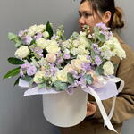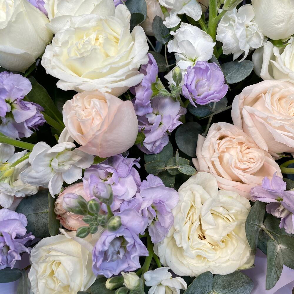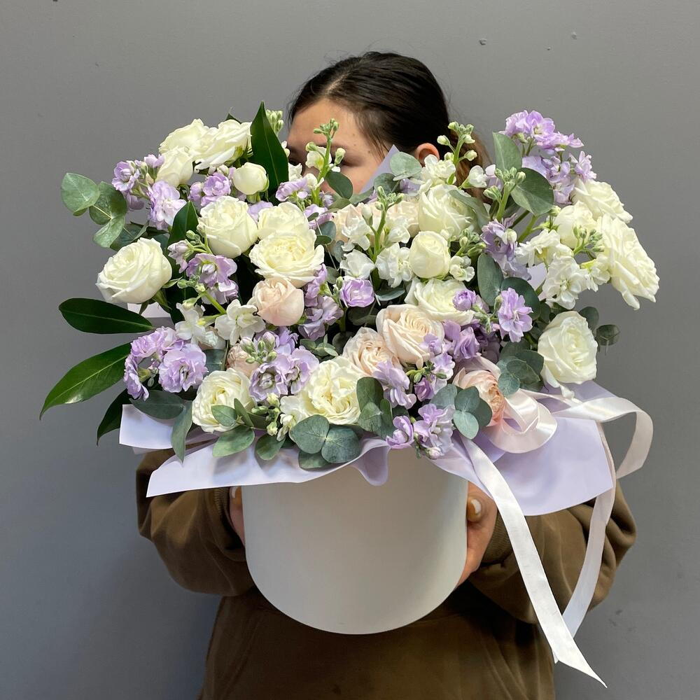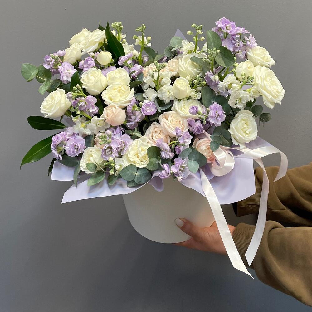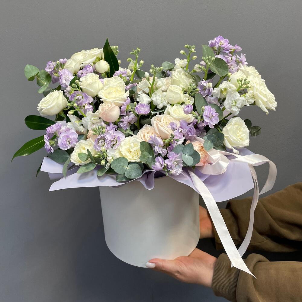 Маттиола - 5 шт. Эвкалипт - 7 шт. Кустовая роза - 6 шт. коробка шляпная с лентами и оазисом - 1 шт.