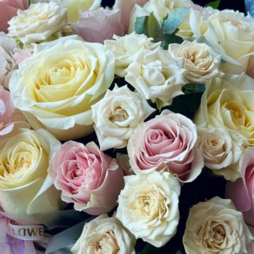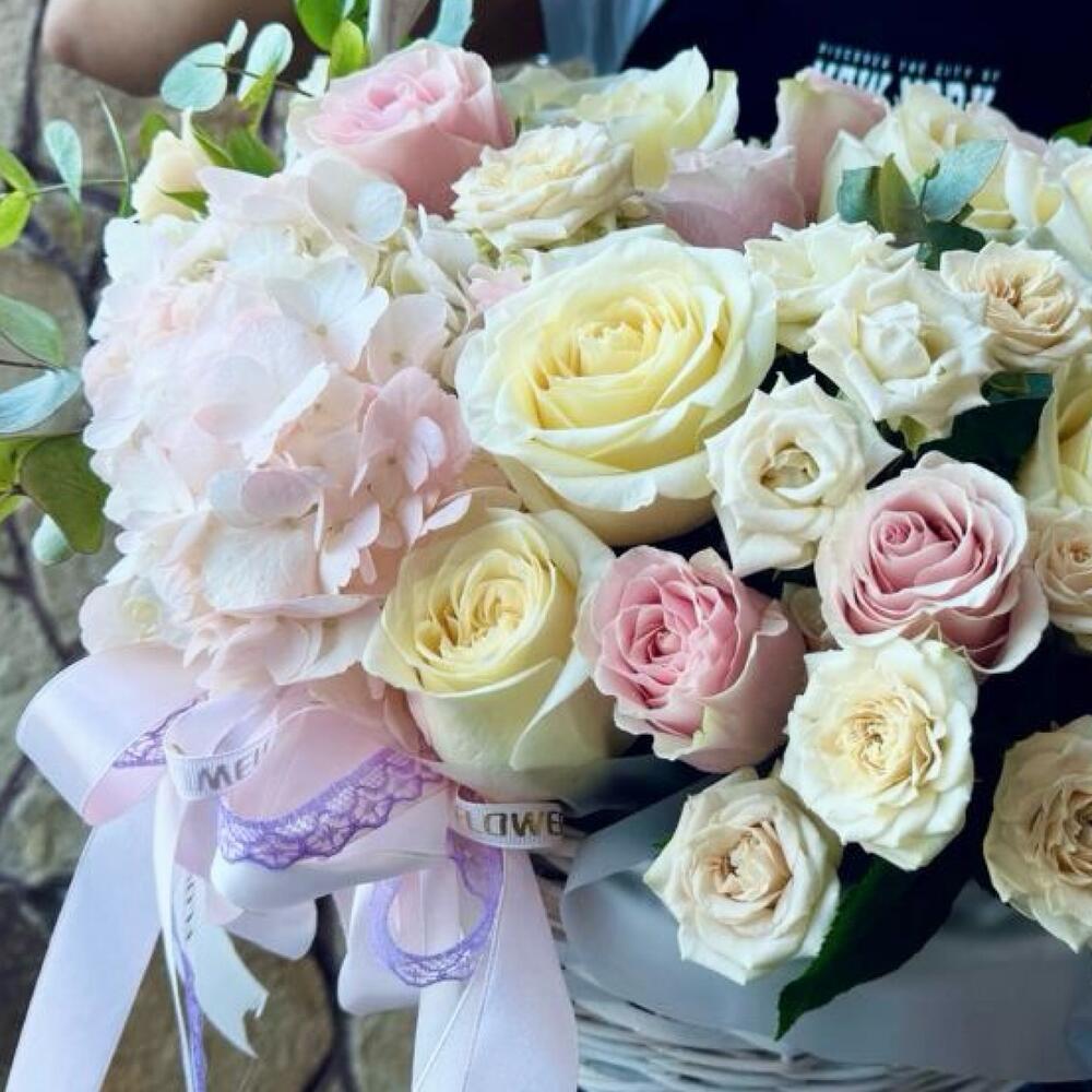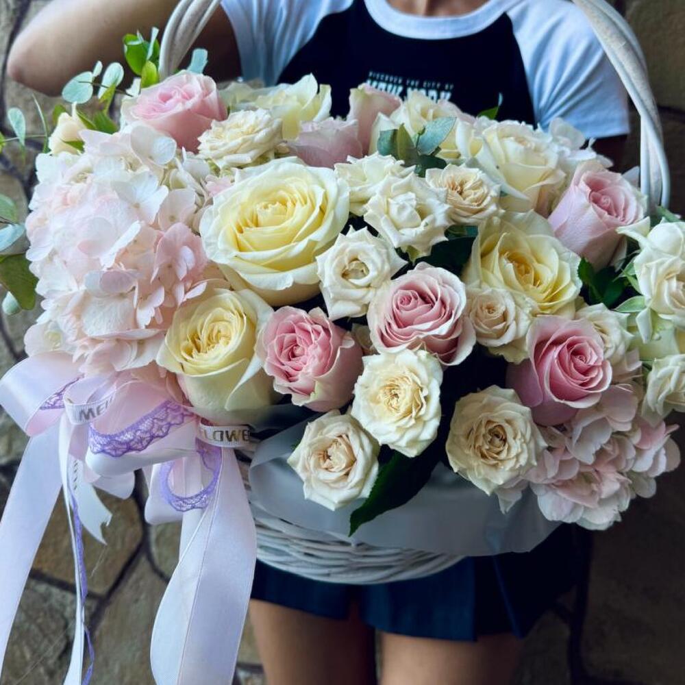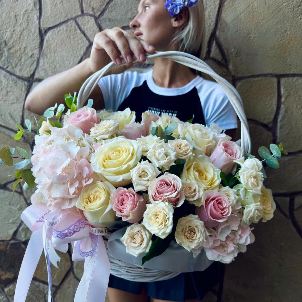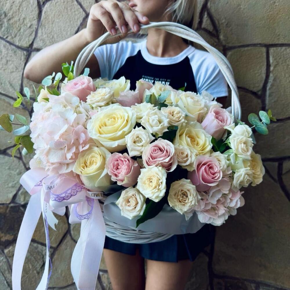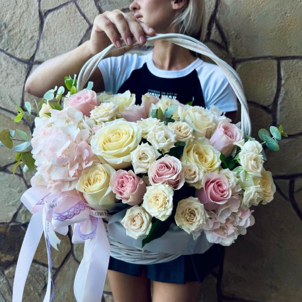 Гортензия - 2 шт. Лента атласная - 2 шт. Диантус - 3 шт. Корзина плетеная - 1 шт. Эвкалипт Микс - 5 шт. роза микс - 15 шт. зелень декоративная микс пучок - 1 шт. роза кустовая микс . - 7 шт.