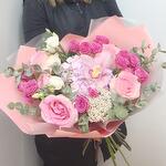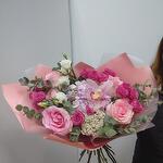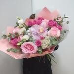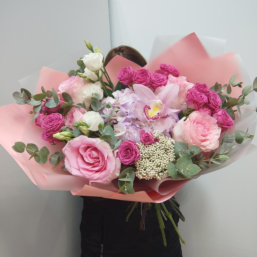 Гортензия - 1 шт. Озотамнус - 1 шт. Орхидея Цимбидиум - 1 шт. Эвкалипт - 7 шт. Роза - 5 шт. Эустома - 1 шт. Лента атласная - 2 шт. Роза пионовидная кустовая - 4 шт. Упаковка дизайнерская - 5 шт.