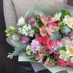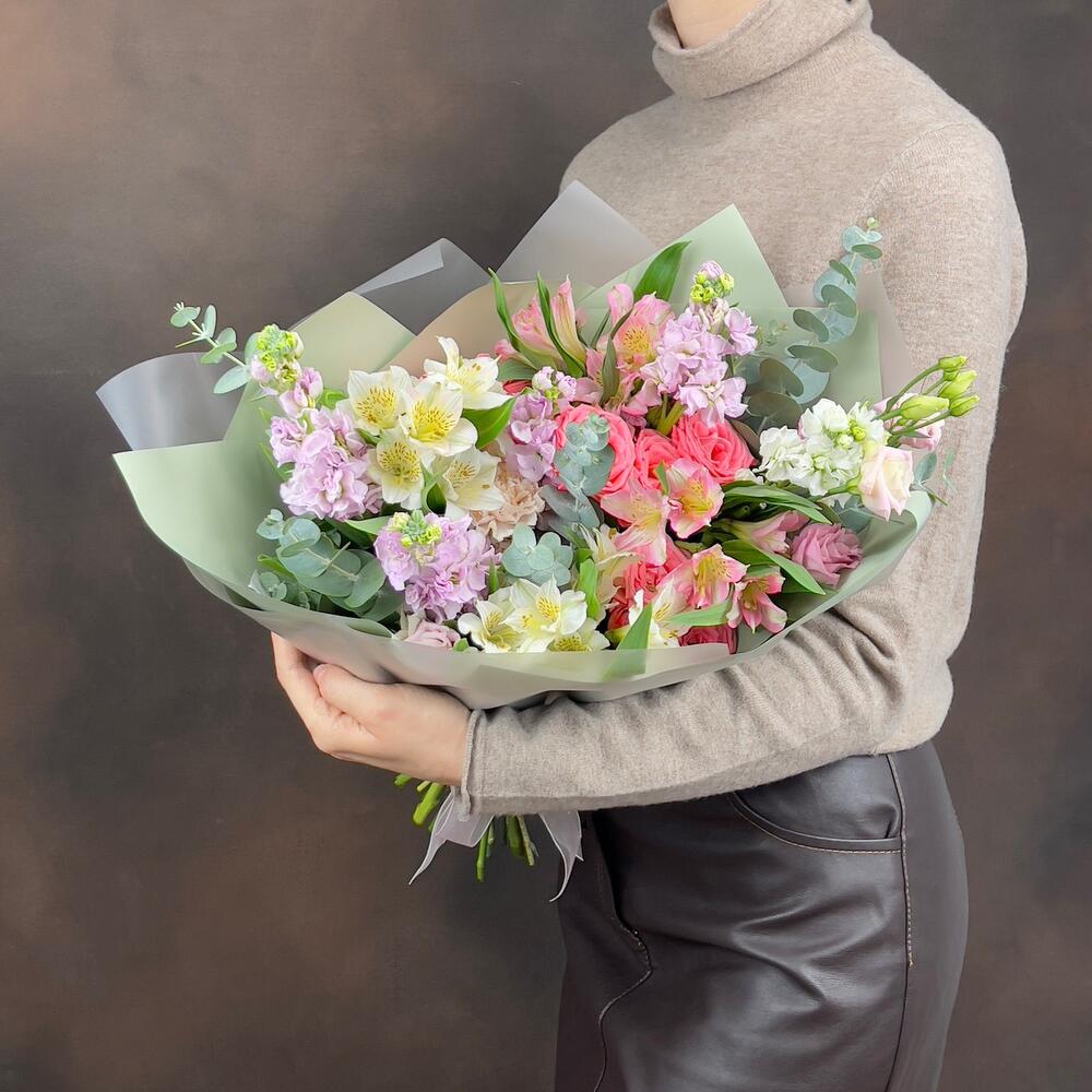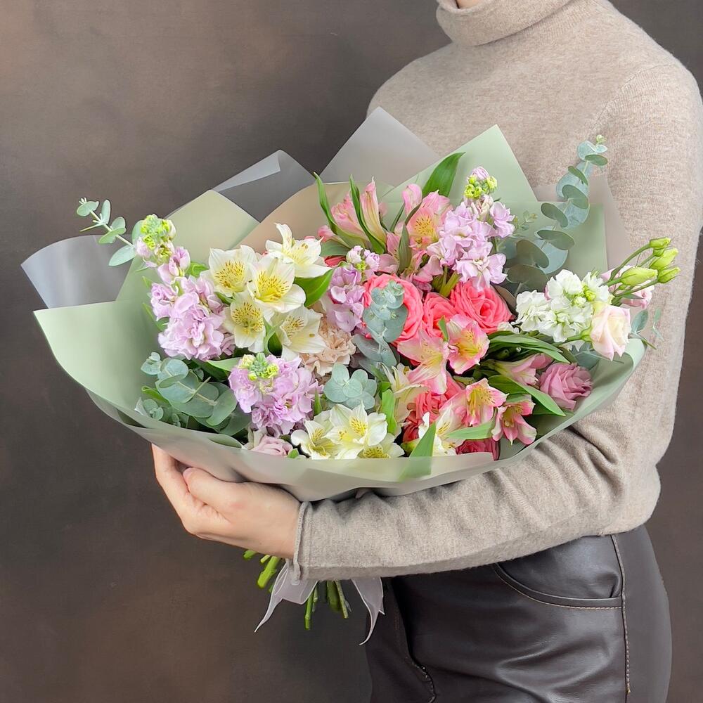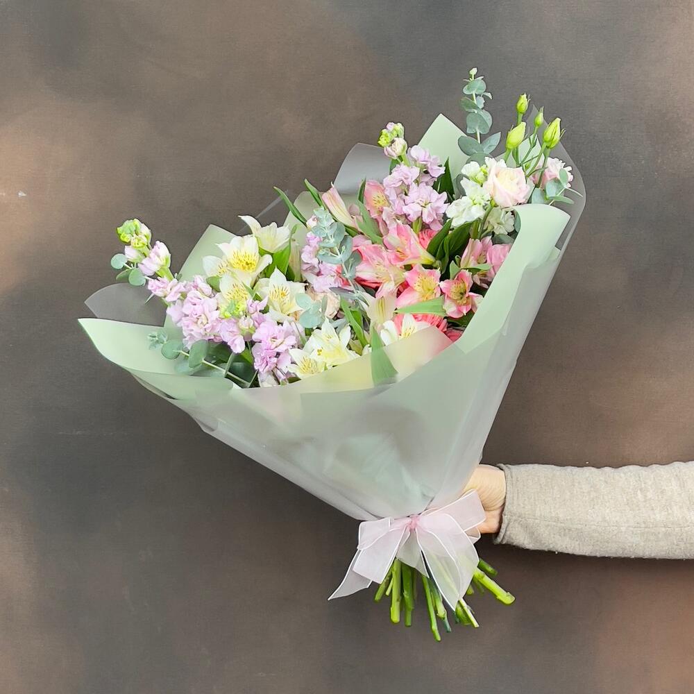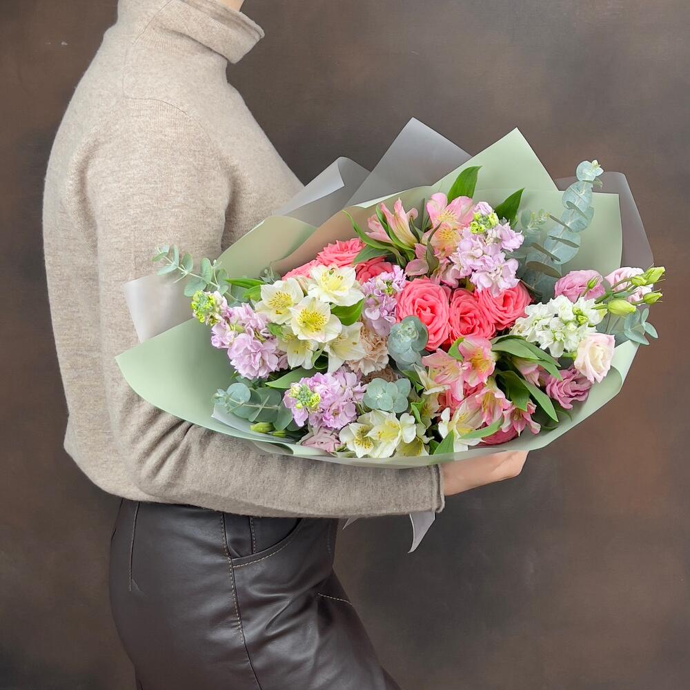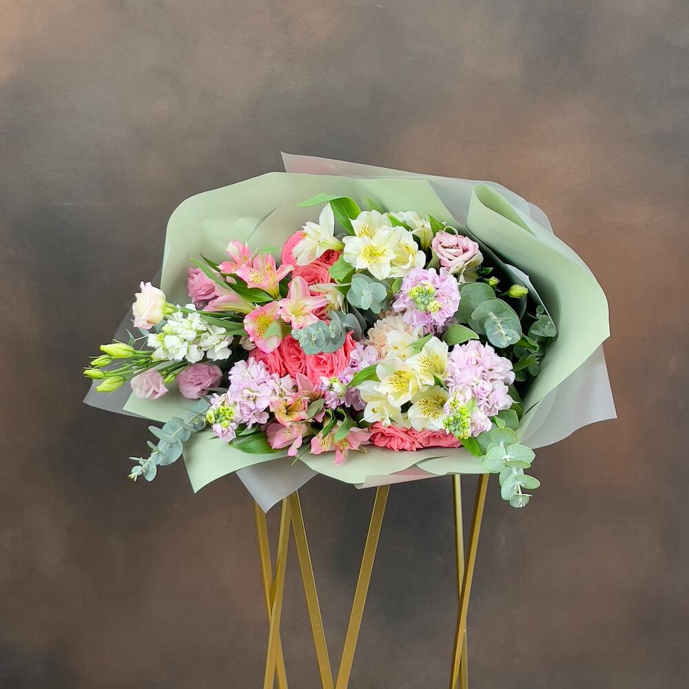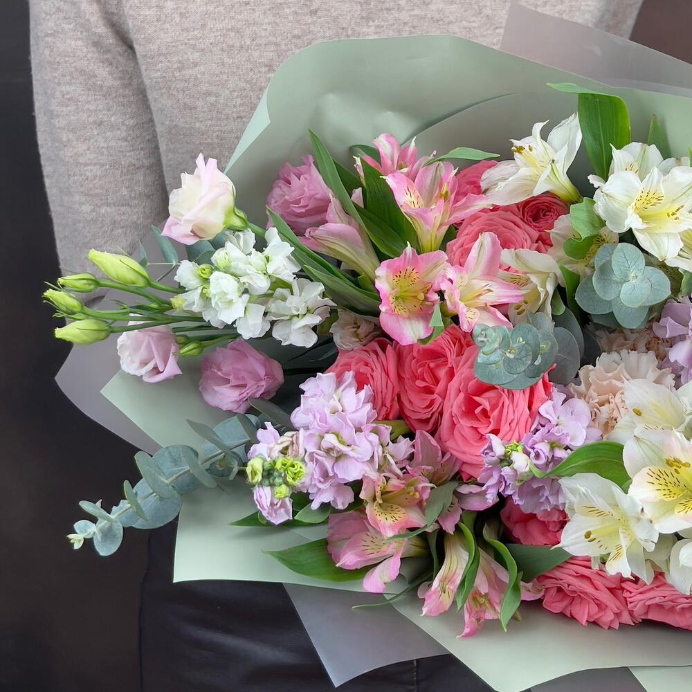 Эвкалипт - 4 шт. Гвоздика - 2 шт. Упаковка дизайнерская - 1 шт. эустома розовая - 1 шт. Маттиола Белая - 1 шт. Роза кустовая Барбадос - 3 шт. Маттиола Розовая - 4 шт. альстромерия белая - 3 шт. альстромерия розовая - 2 шт.