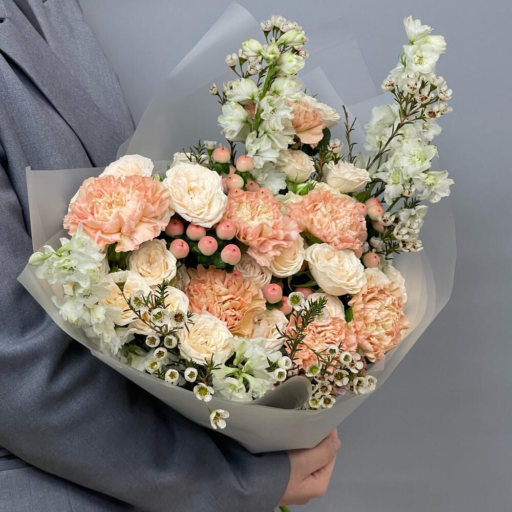 Гиперикум - 3 шт. Дельфиниум - 5 шт. Роза кустовая - 9 шт. Гвоздика - 7 шт. Хамелациум - 3 шт. Упаковка дизайнерская - 1 шт.