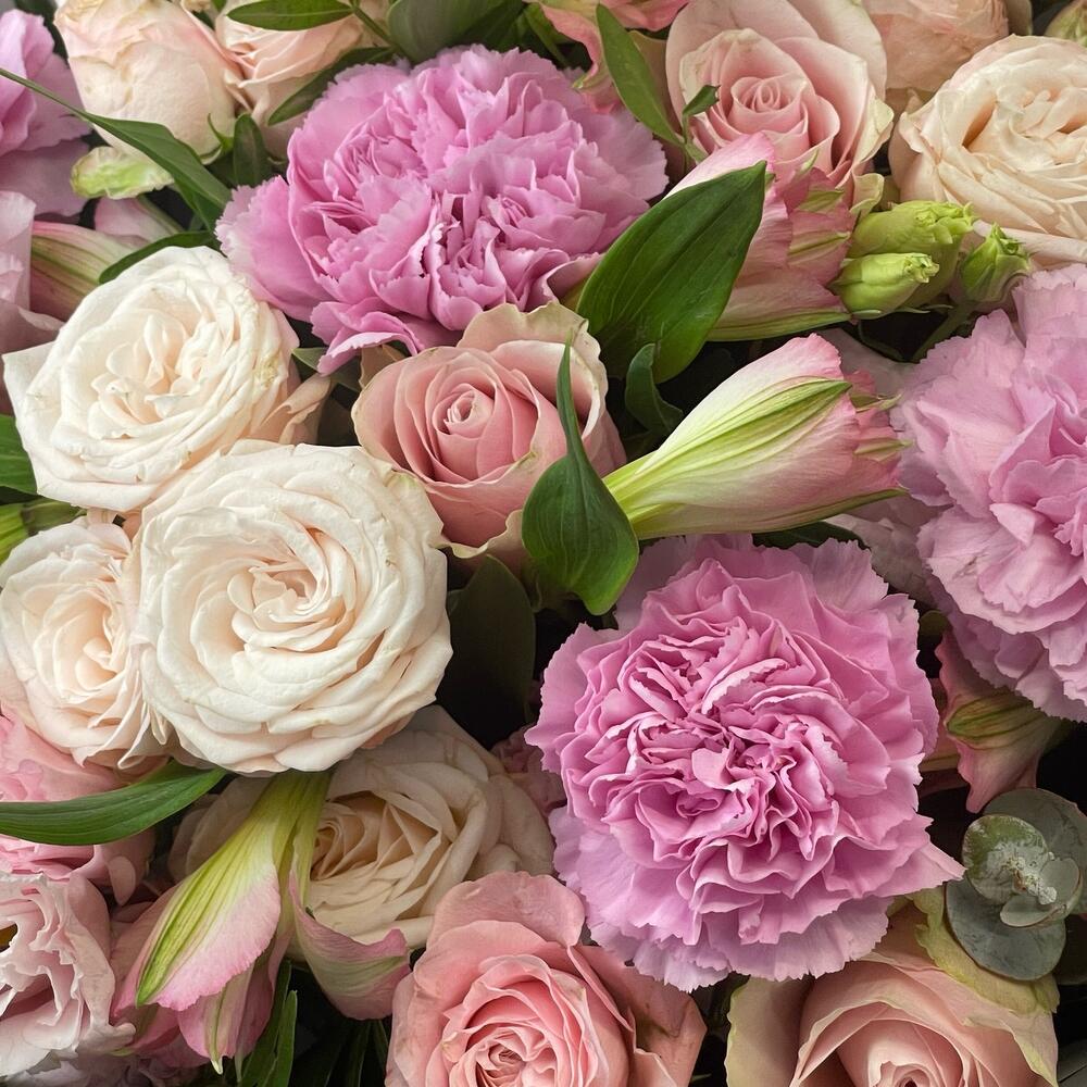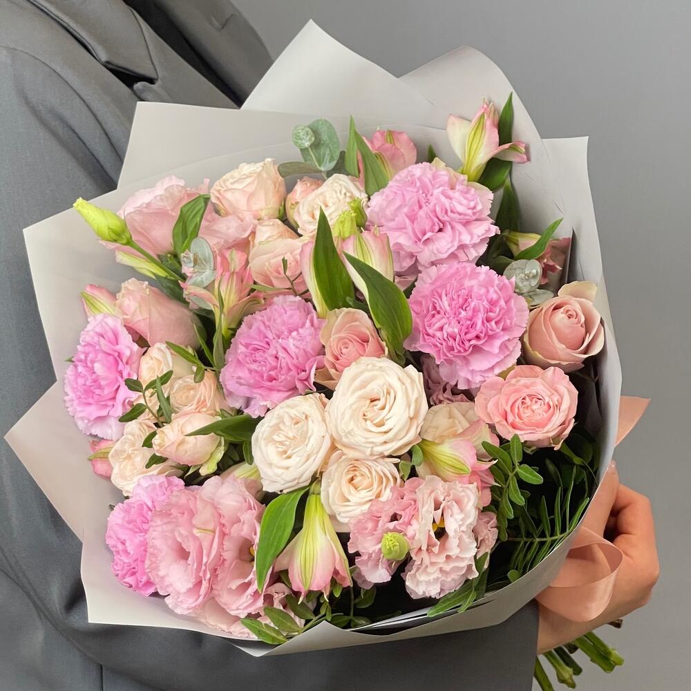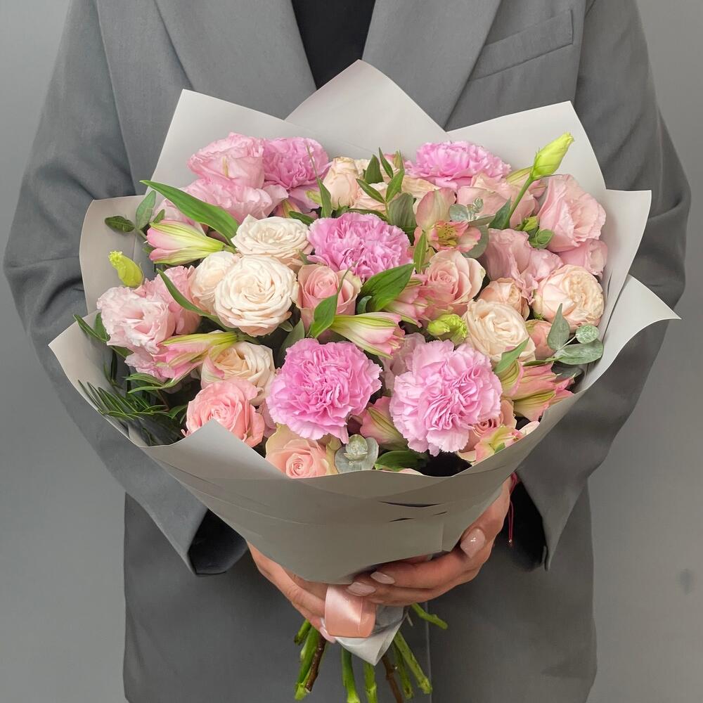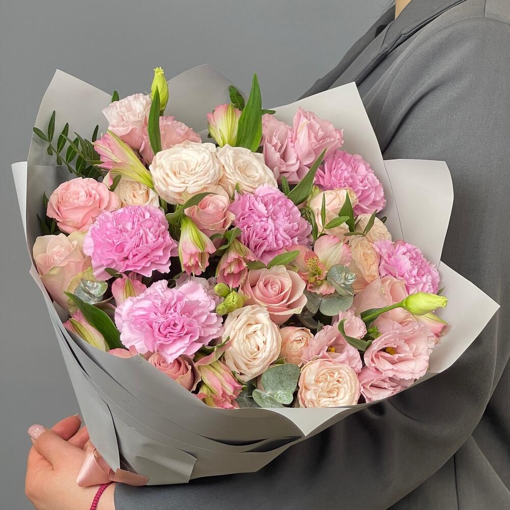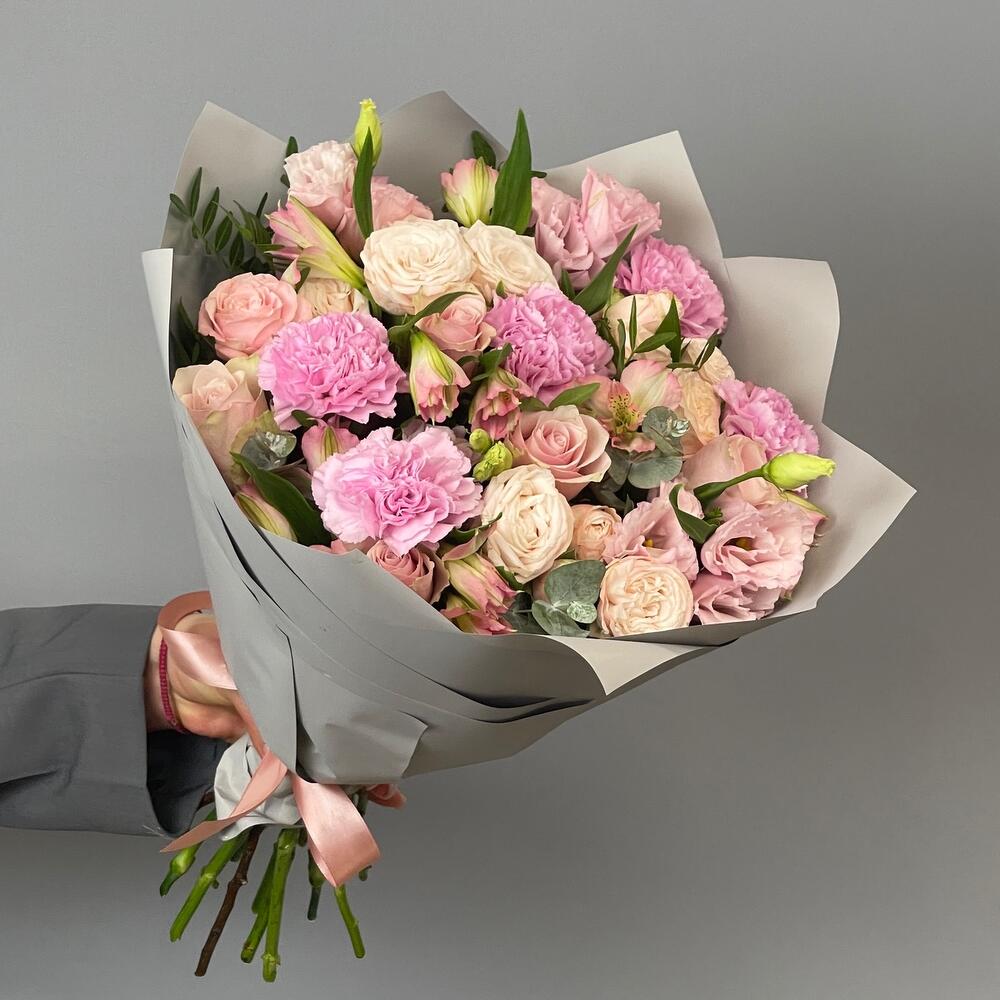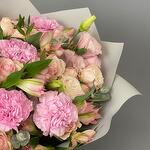 Фисташка - 3 шт. Упаковка дизайнерская - 1 шт. эустома розовая - 3 шт. Роза кустовая пионовидная Бомбастик - 3 шт. Роза одноголовая Пинк Атена - 5 шт. гвоздика клирвоттер - 5 шт. альстромерия розовая - 3 шт.