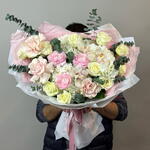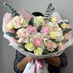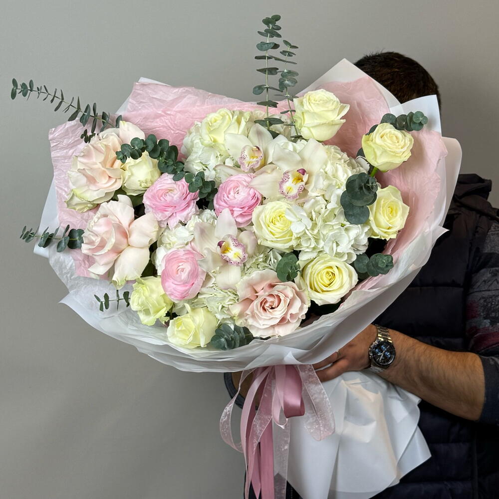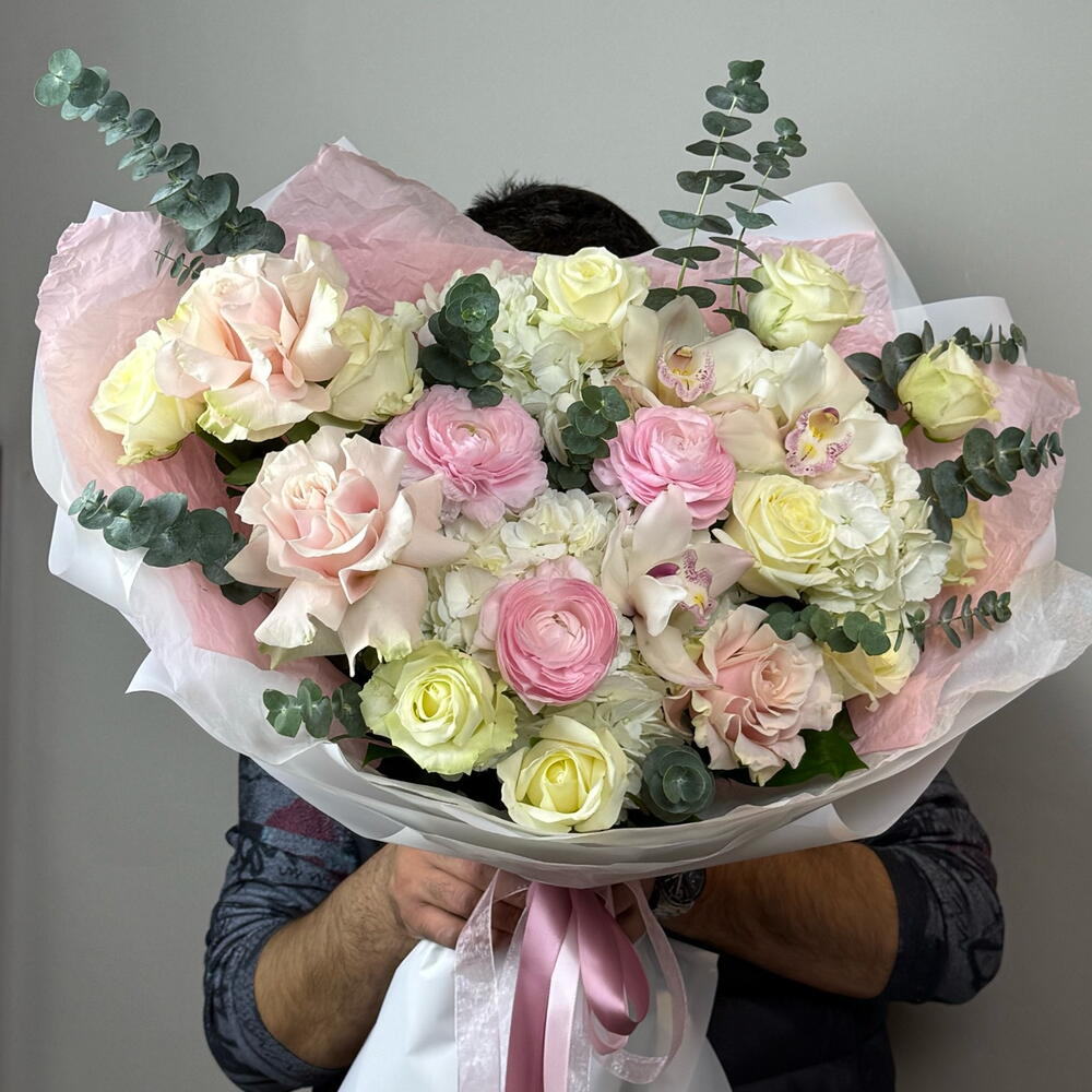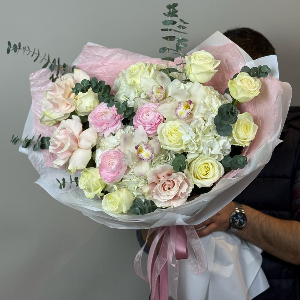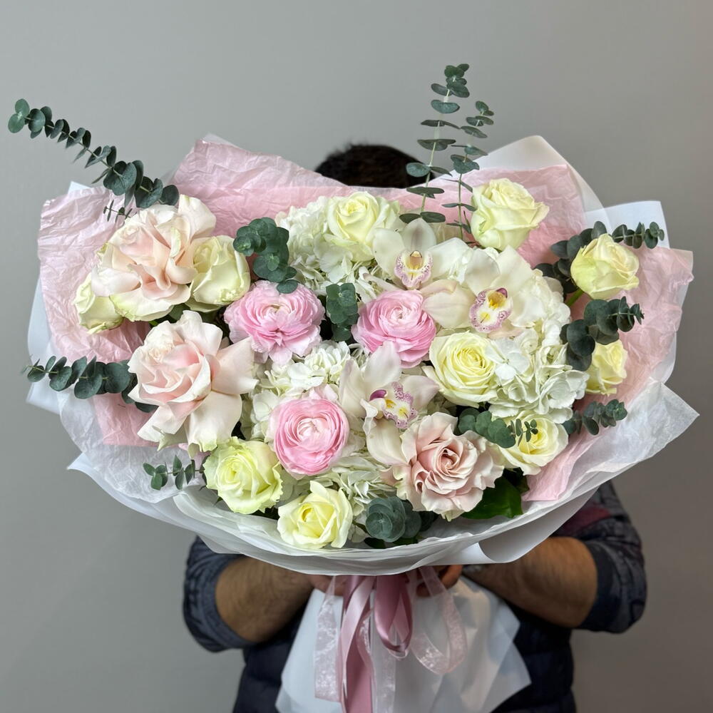 Орхидея Цимбидиум - 3 шт. Эвкалипт - 5 шт. Роза - 3 шт. Лента атласная - 1 шт. Открытка - 1 шт. Упаковка дизайнерская - 1 шт. гортензии - 3 шт. Ранункулус - 3 шт.
