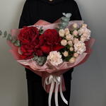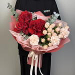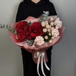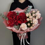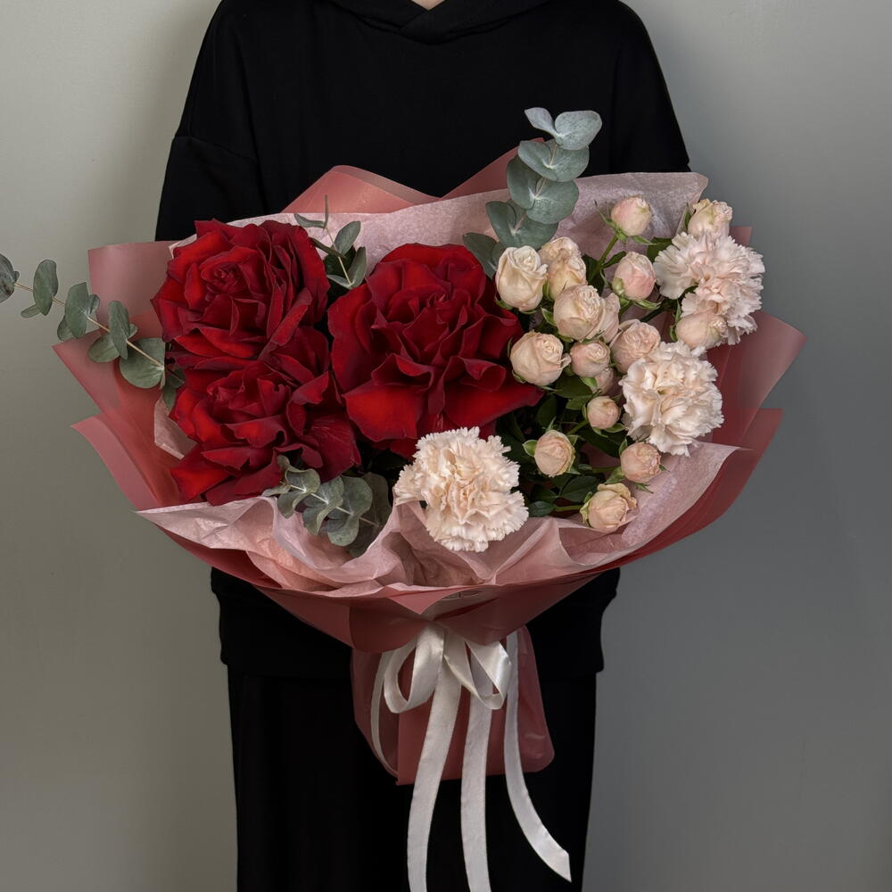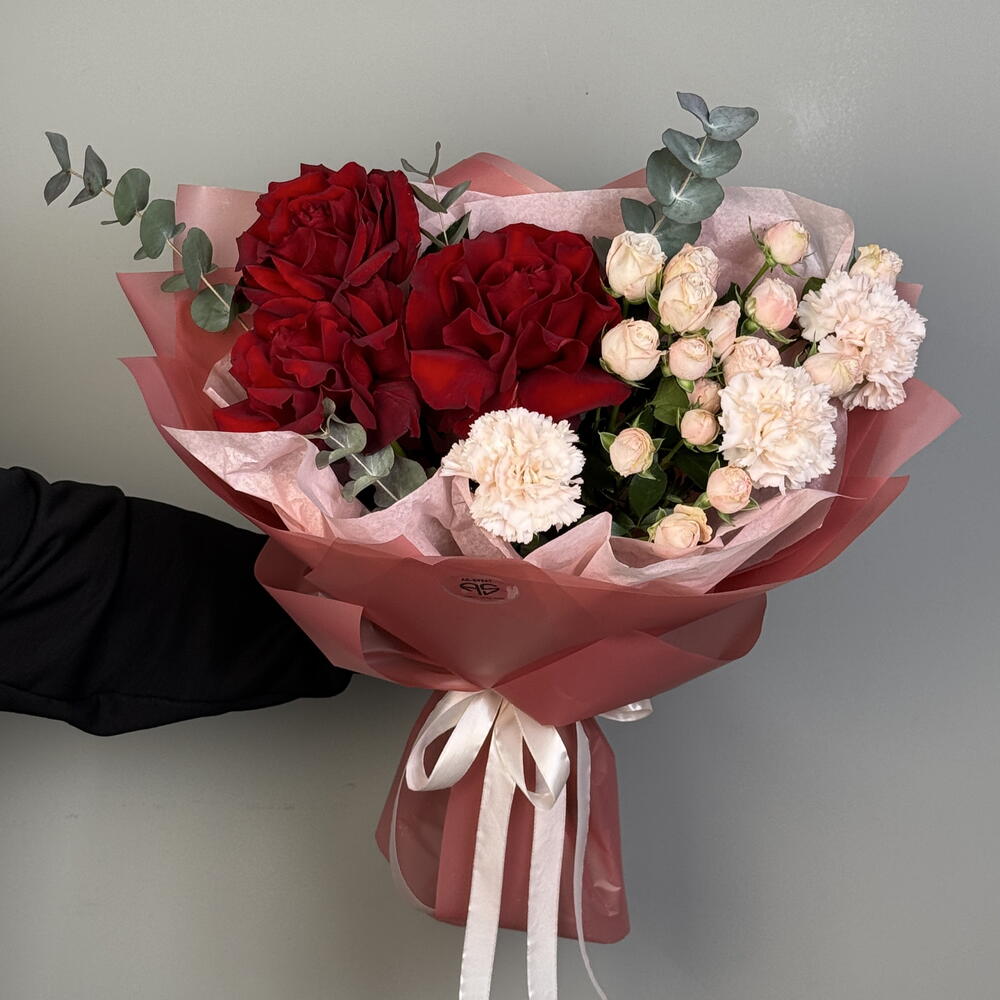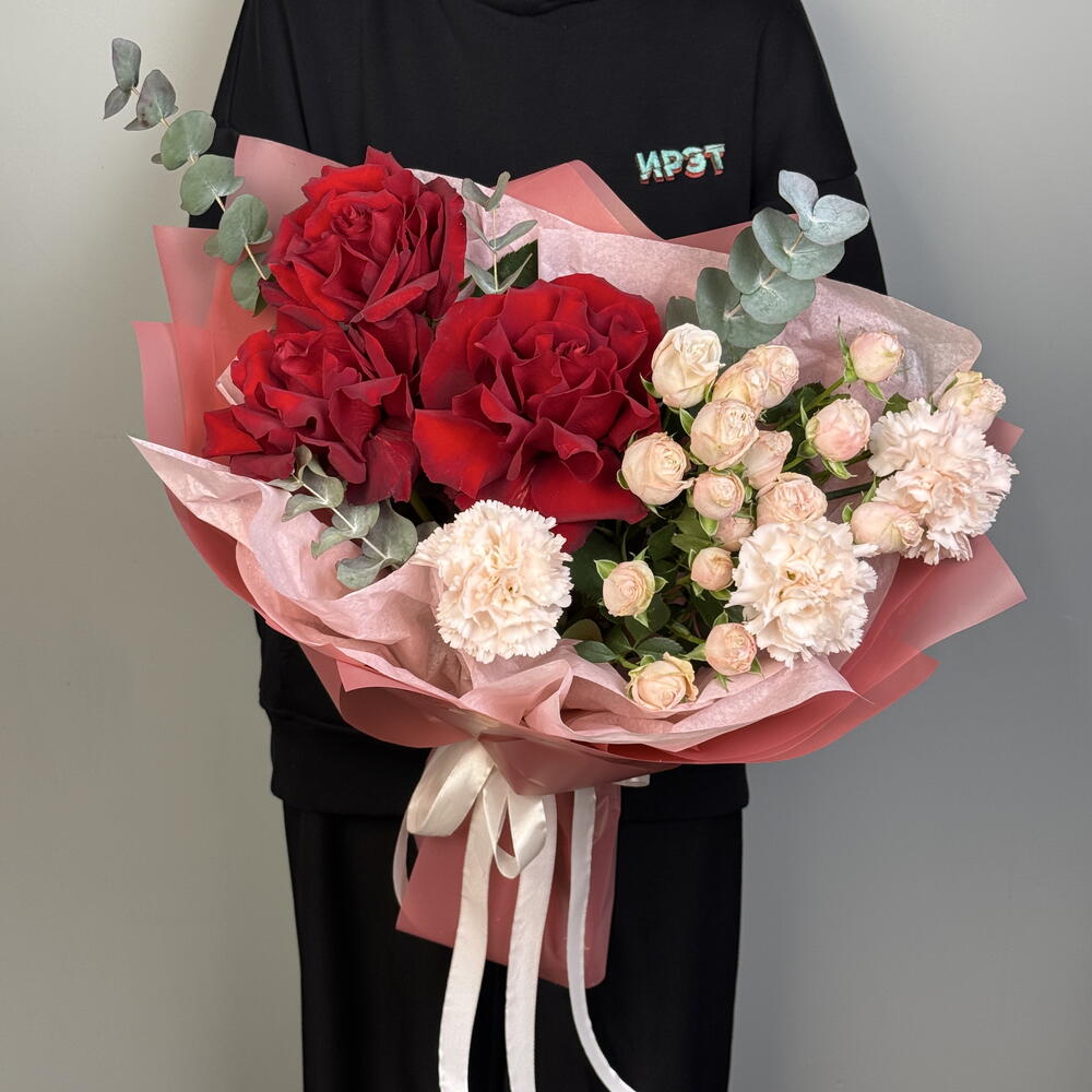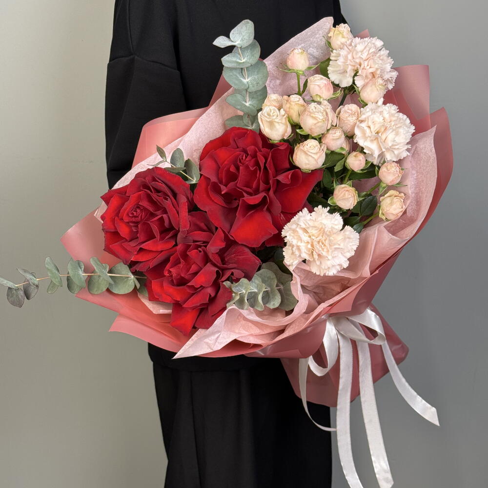 Роза кустовая - 3 шт. Эвкалипт - 4 шт. Диантус - 3 шт. роза французская красная - 3 шт.