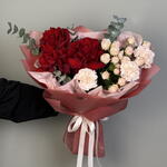 Идеальный букет для ярких эмоций. Сочетание алых и белых французских роз, пионовидных кустовых роз и нежных диантусов создают потрясающую объемную композицию. Дополненный эвкалиптом и упакованный в стильную матовую пленку с бумагой тишью и атласной лентой, этот букет — настоящее признание в стиле.