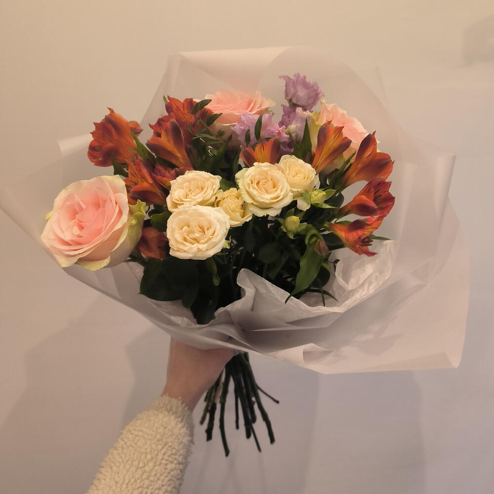 Авторский букет Яркий день с розами альстромерией и лиловым лизиантусом