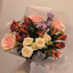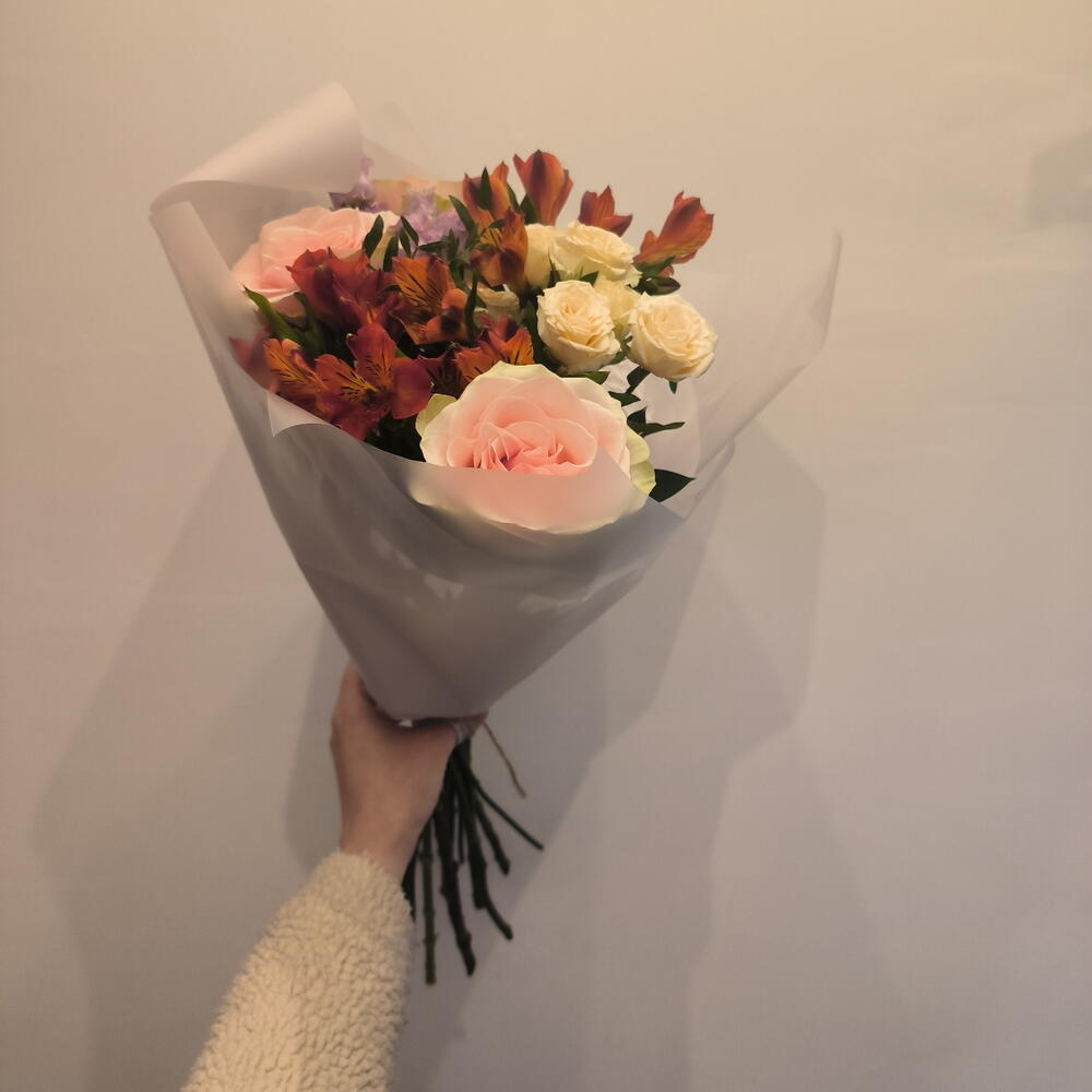 Альстромерия - 3 шт. Лизиантус - 1 шт. Рускус - 3 шт. Кустовая роза - 1 шт. Фисташка - 1 шт. Дизайнерская упаковка - 1 шт. роза фруттето - 3 шт.