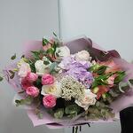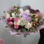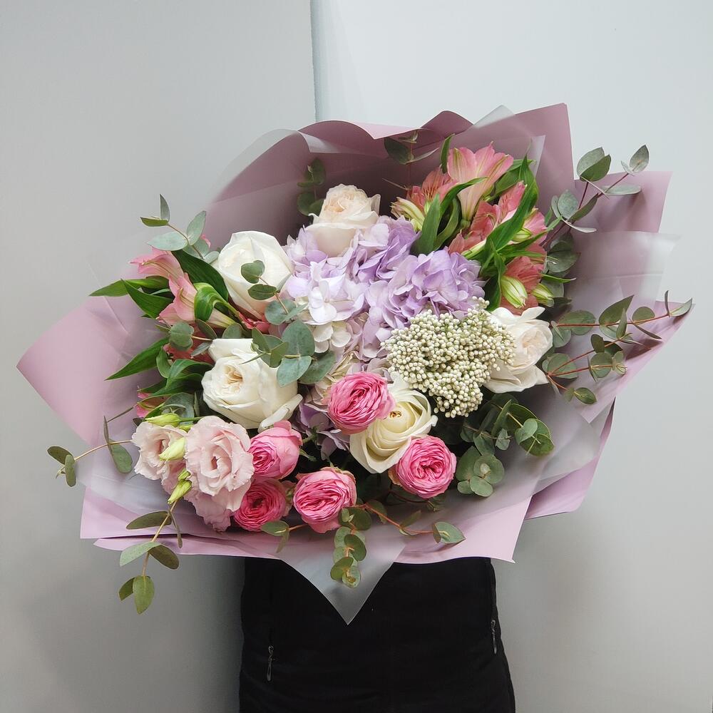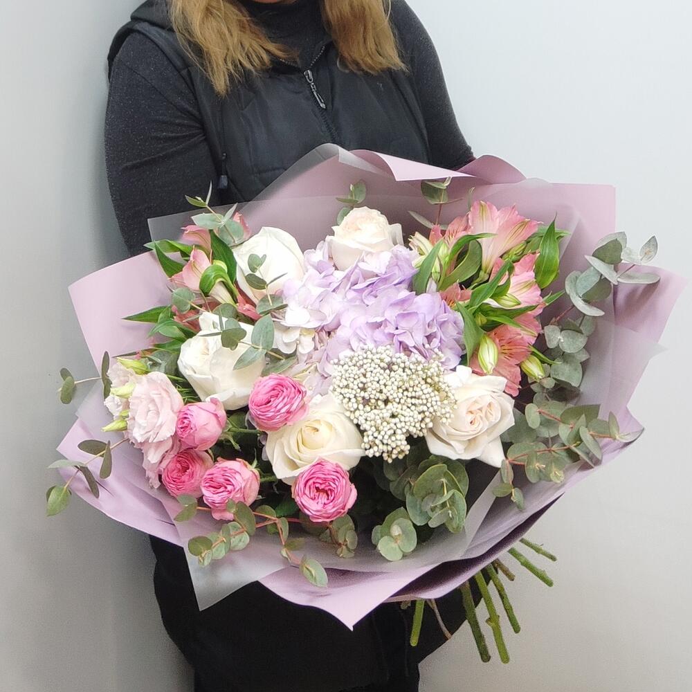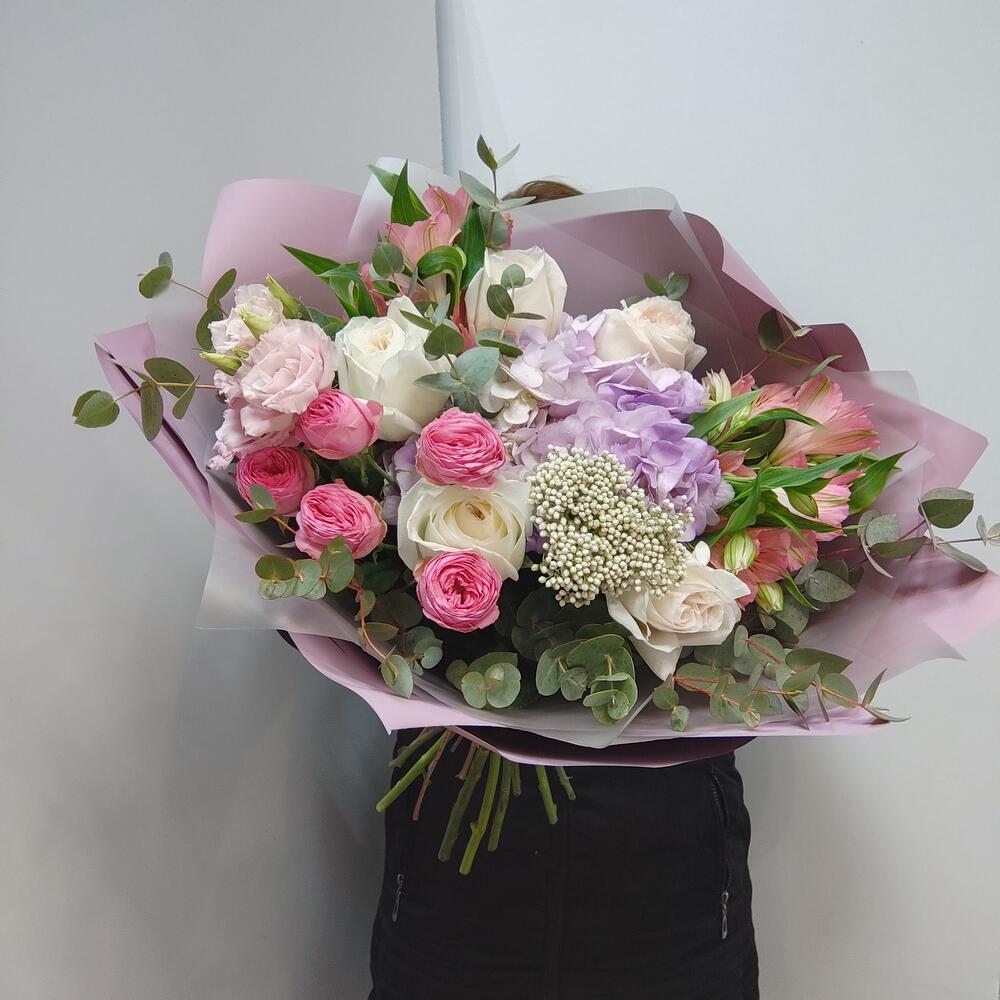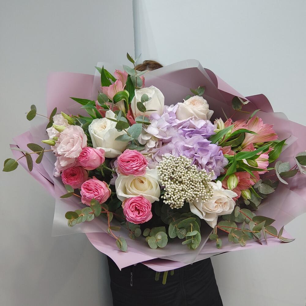 Альстромерия - 2 шт. Гортензия - 1 шт. Озотамнус - 1 шт. Эвкалипт - 7 шт. Эустома - 1 шт. Лента атласная - 2 шт. Роза пионовидная кустовая - 1 шт. Упаковка дизайнерская - 5 шт. роза пионовидная ароматная - 5 шт.