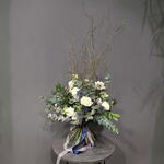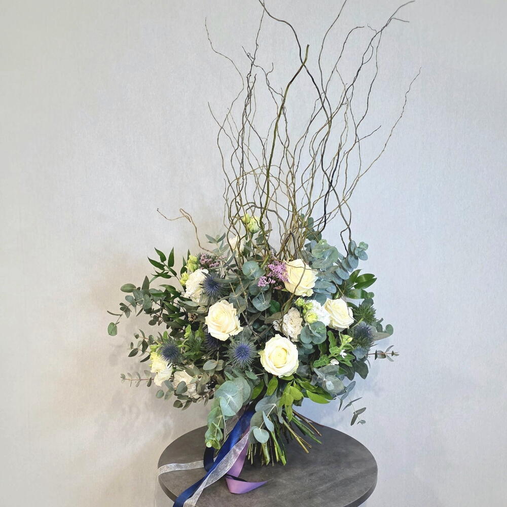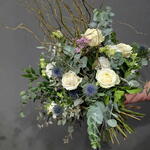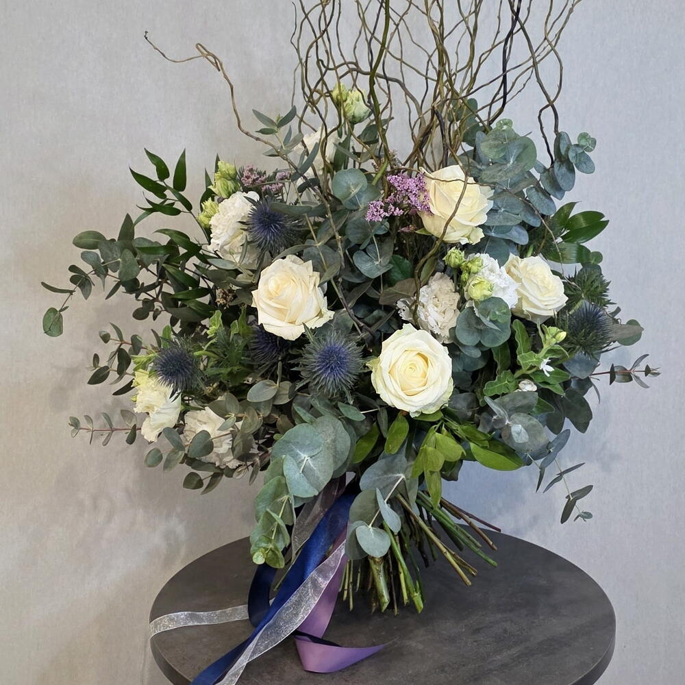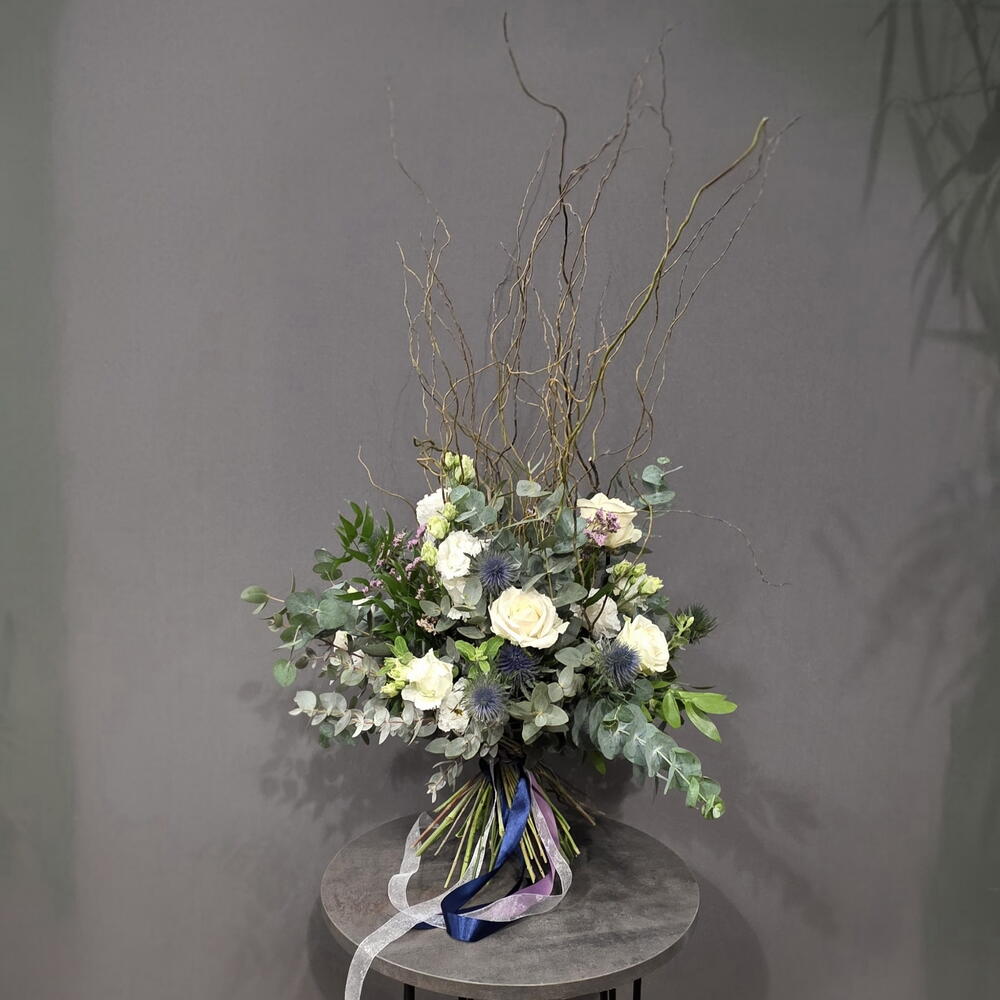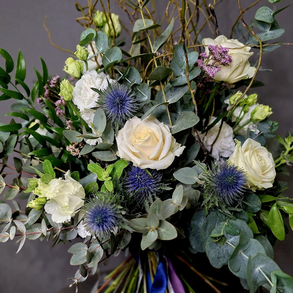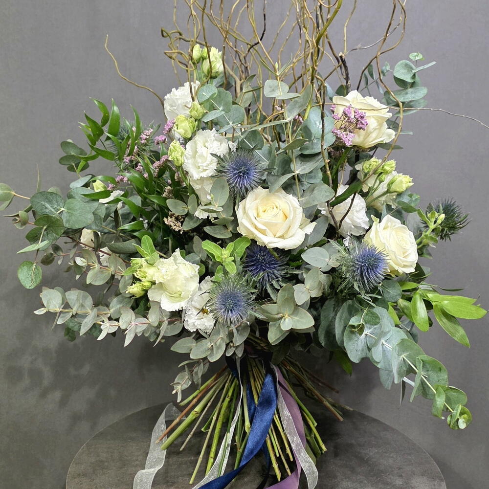 Лимониум - 3 шт. Роза Аваланж - 5 шт. Эрингиум - 3 шт. Оксипеталум - 3 шт. Лента сатиновая - 2 шт. Лента органза - 1 шт. Эвкалипт Микс - 20 шт. эустома кудрявая - 4 шт. Корилус Конторта - 5 шт. Рускус Италия Лонг - 6 шт.