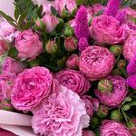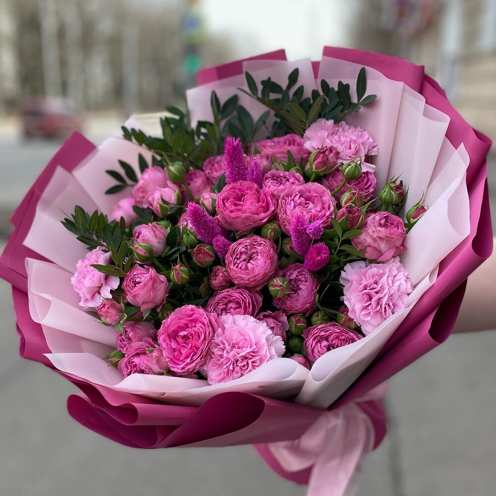 Фисташка - 1 шт. Гвоздика сортовая - 4 шт. Фаларис - 1 шт. Пленка дизайнерская - 4 шт. роза кустовая мисти бабл - 5 шт.