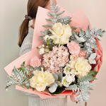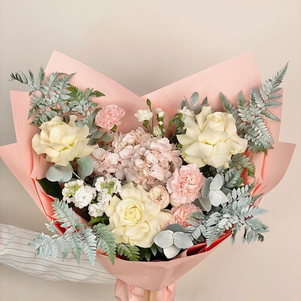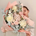 Эвкалипт - 2 шт. Упаковка - 1 шт. Лента атласная - 1 шт. Гвоздика кустовая - 1 шт. Гвоздика цветная - 3 шт. Листья папоротника - 4 шт. маттиола кустовая - 1 шт. писташ пучок - 1 шт. французская роза мондиаль - 3 шт. куст. роза мэнсфилд парк - 1 шт.