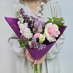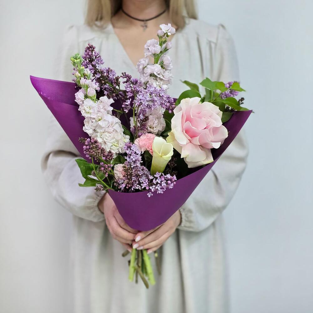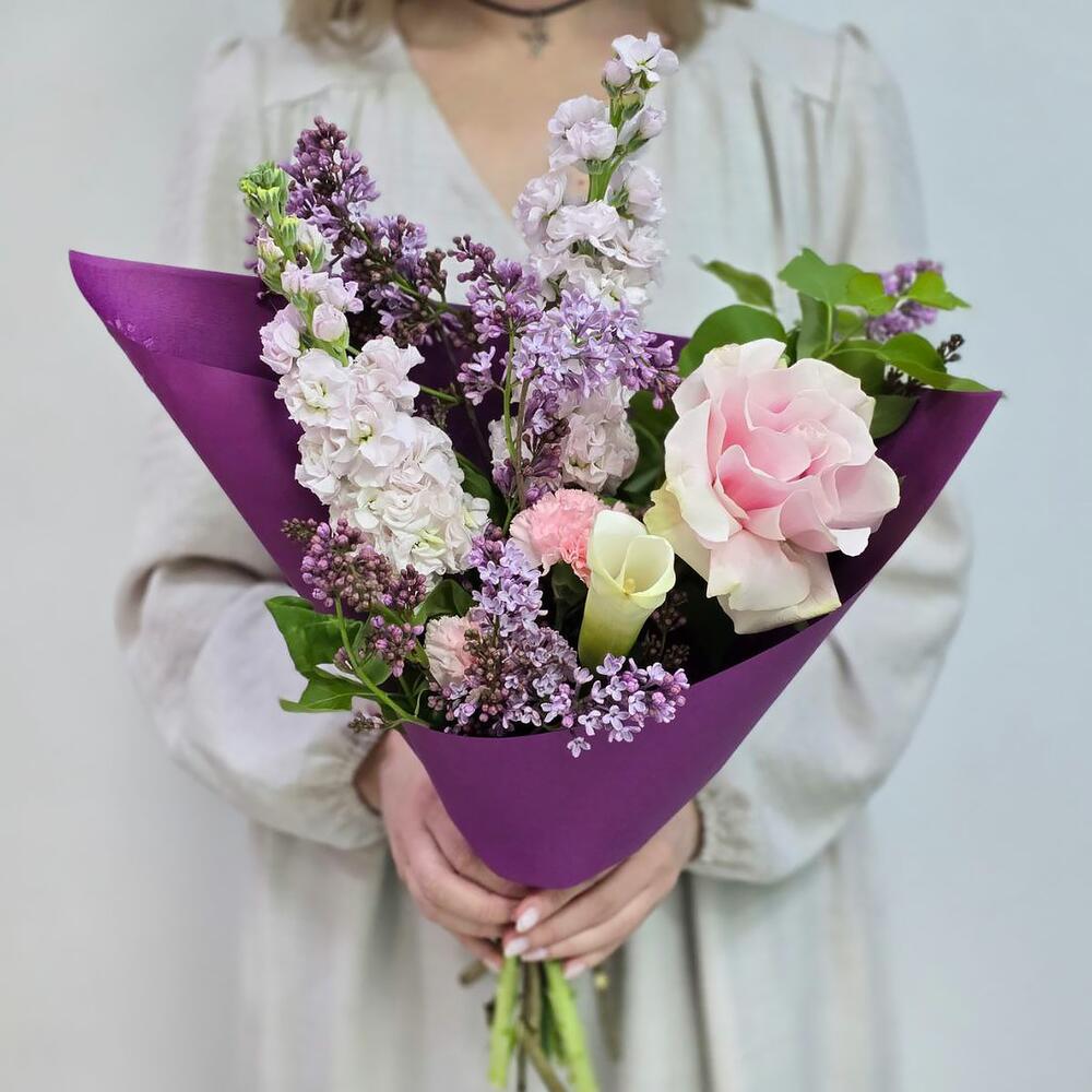 Калла - 1 шт. Маттиола - 2 шт. Сирень - 2 шт. Роза Эквадор - 1 шт. Гвоздика - 2 шт. Лента атласная - 1 шт. Упаковка дизайнерская - 1 шт.