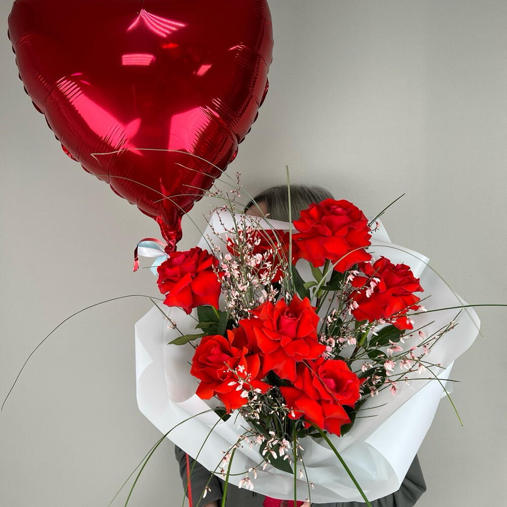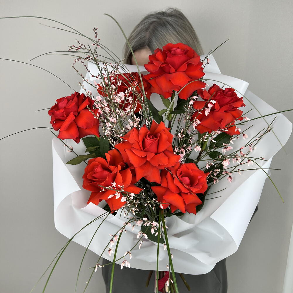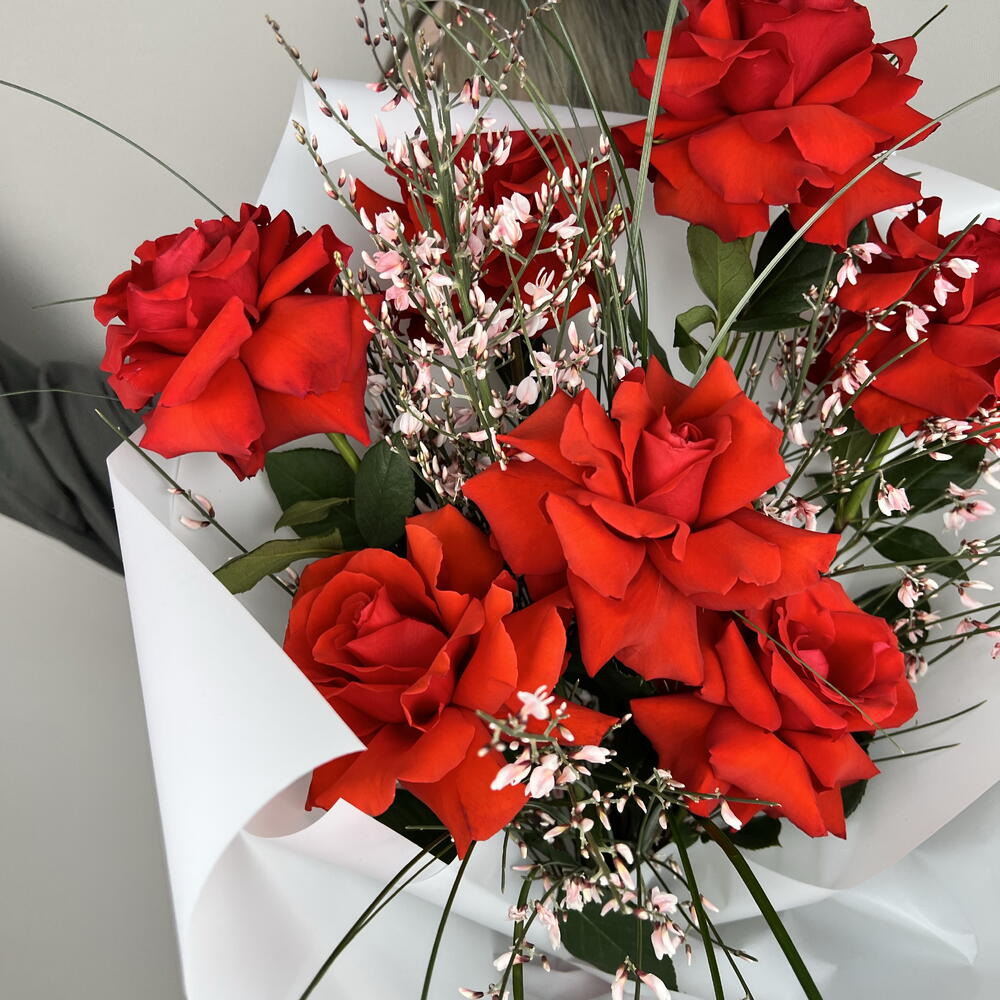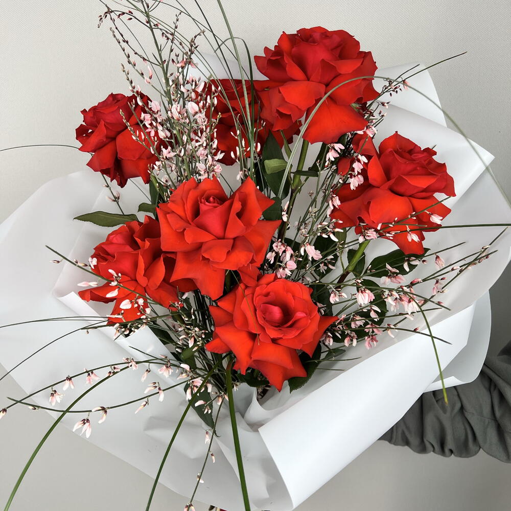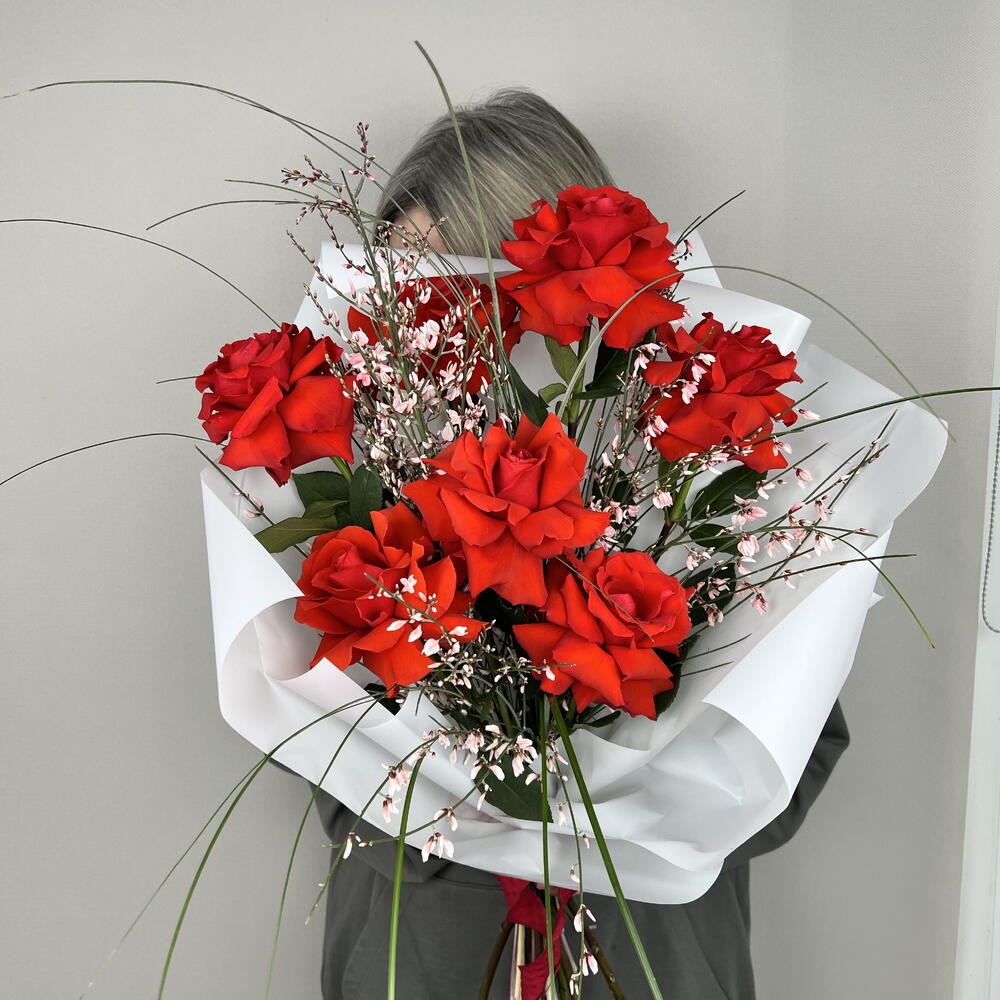Стильный букет из вывернутых роз с воздушной генистой💥 Подарите не просто цветы, а настоящее произведение флористического искусства. В центре этой композиции — премиальные алые розы, раскрытые в особой французской технике. Это делает каждый бутон невероятно пышным, открывая взгляду бархатистое сердце цветка.