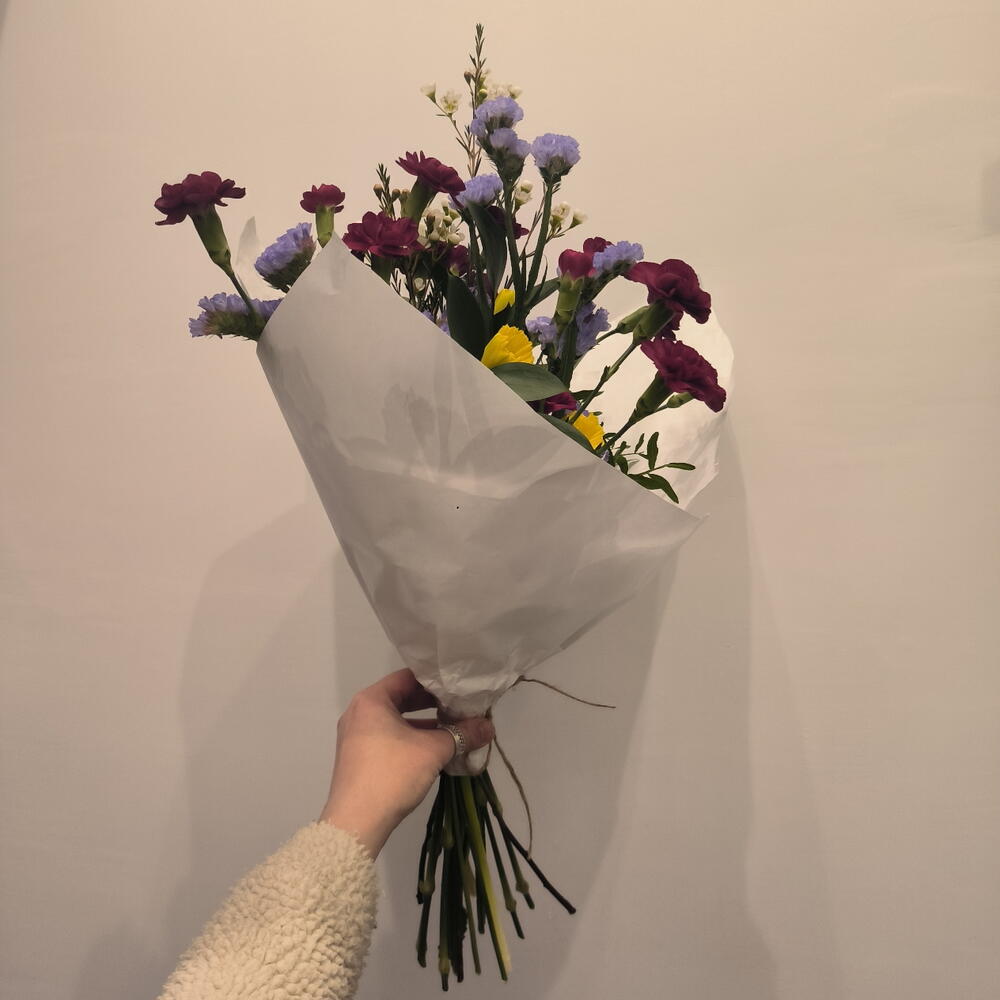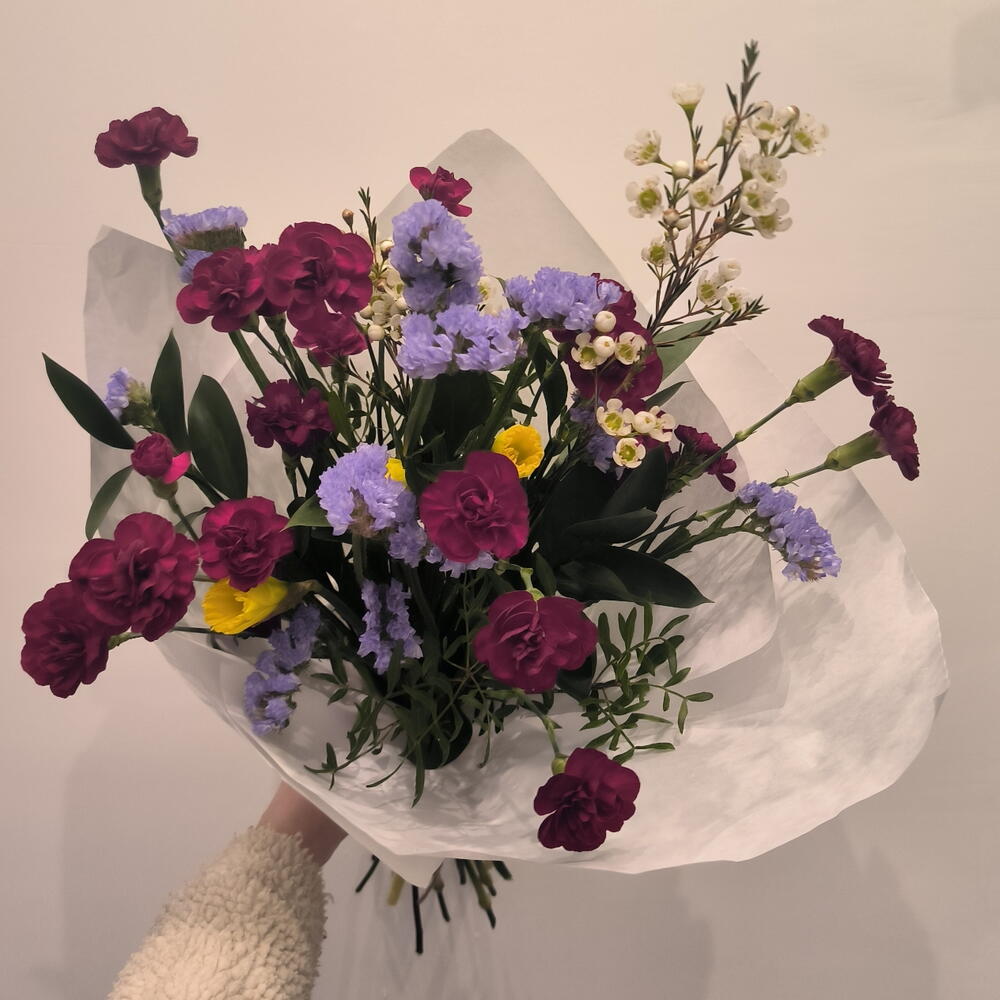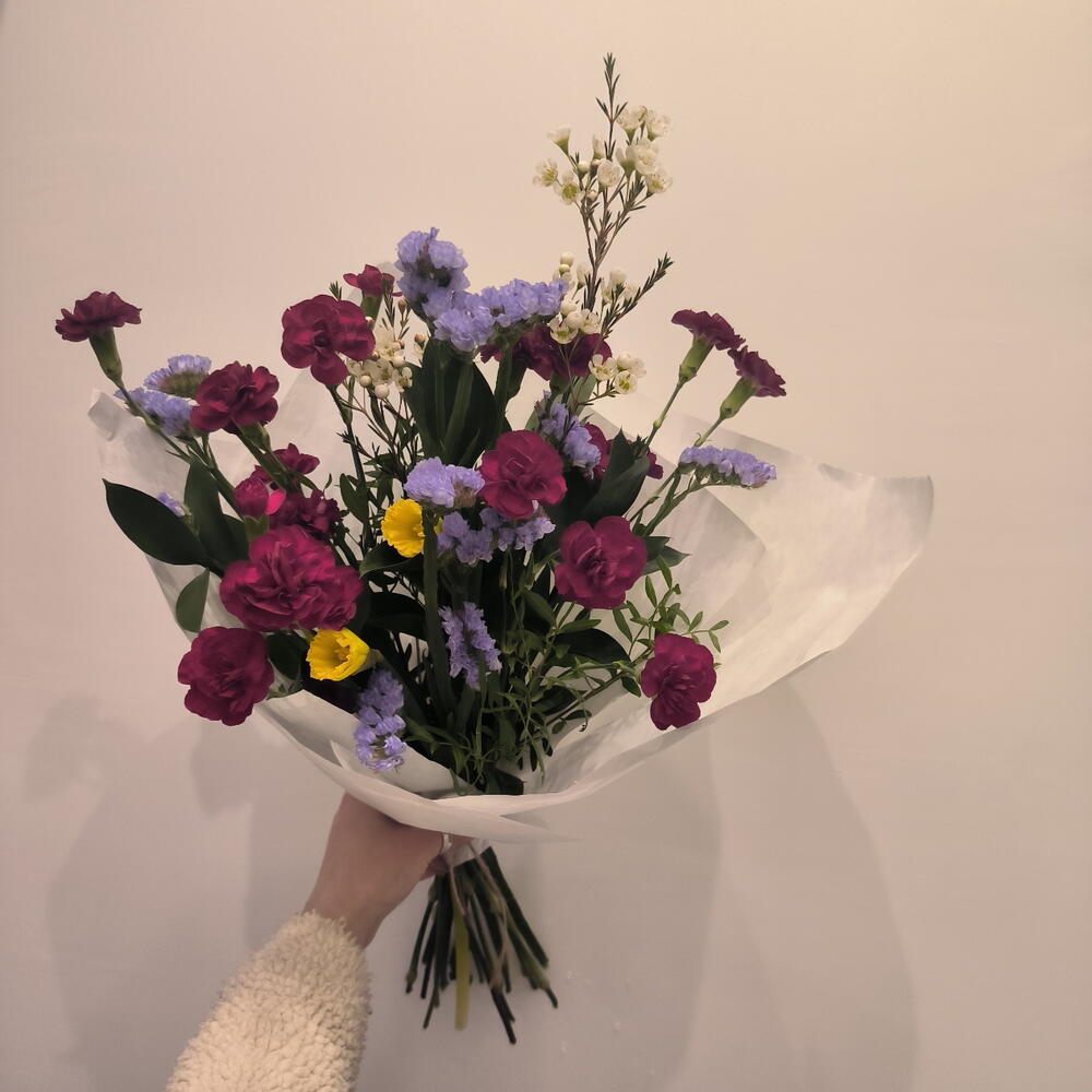 Невероятно яркий комплимент с характером. Гвоздики Бордо, жёлтые как желток и солнце нарциссы, фиолетовые соцветия лимониума, зелень фисташки и рускуса-все вместе оставит приятное впечатление и поднимет настроение!