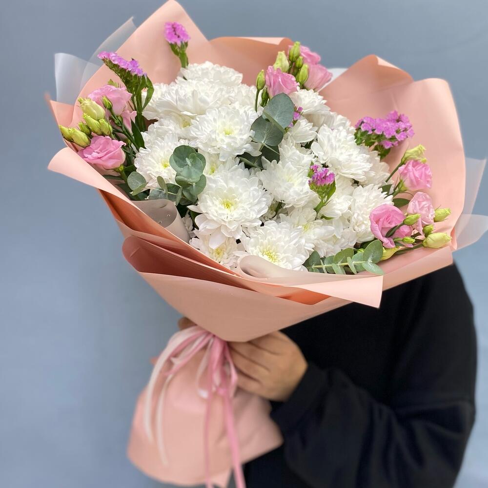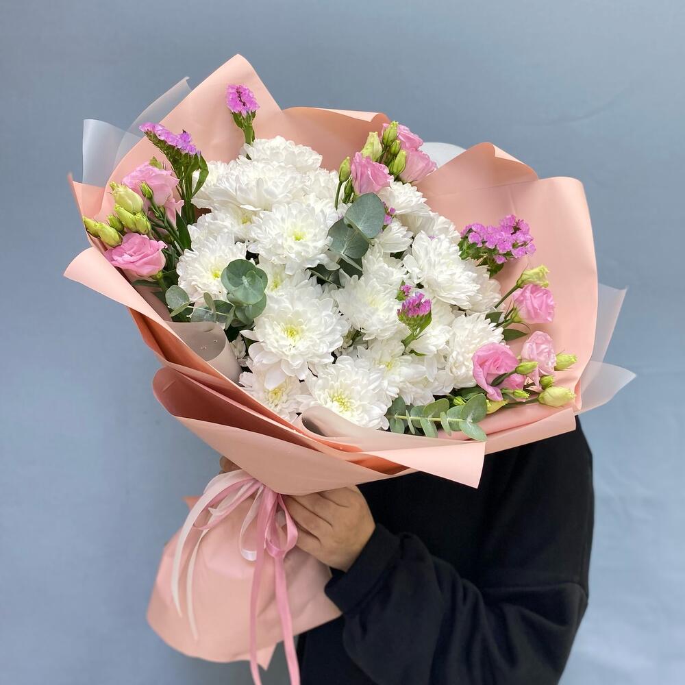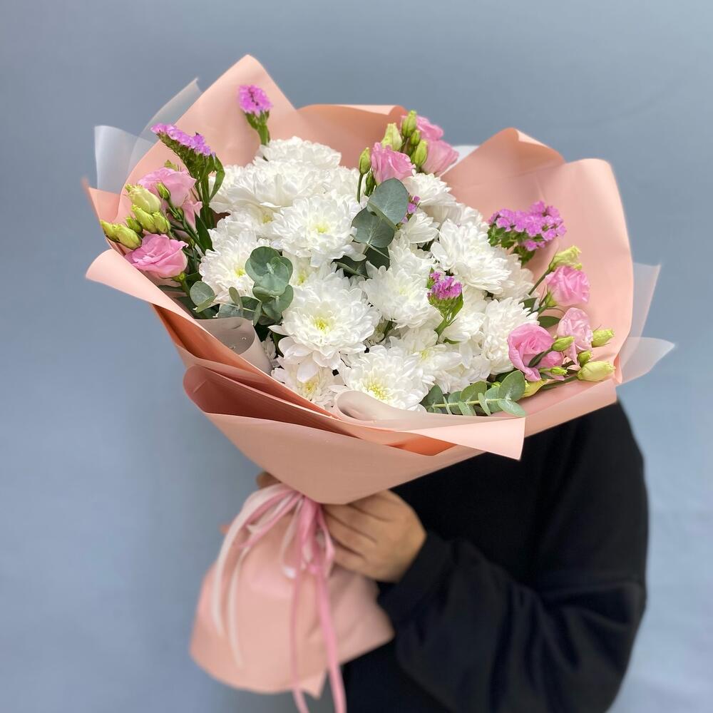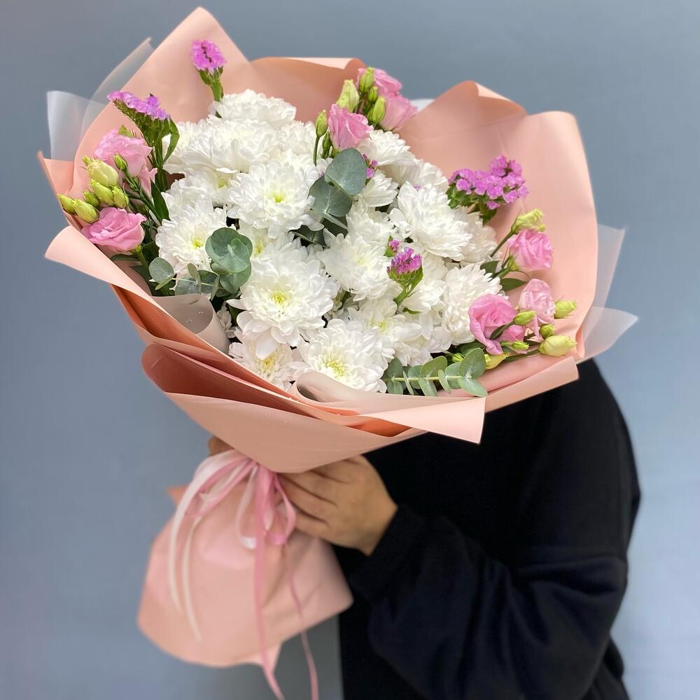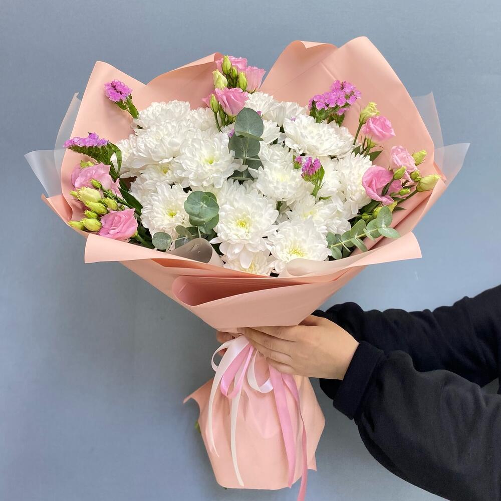 Статица - 3 шт. Эвкалипт - 3 шт. Эустома - 3 шт. Упаковка дизайнерская - 3 шт. кустовые хризантемы - 5 шт.