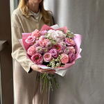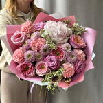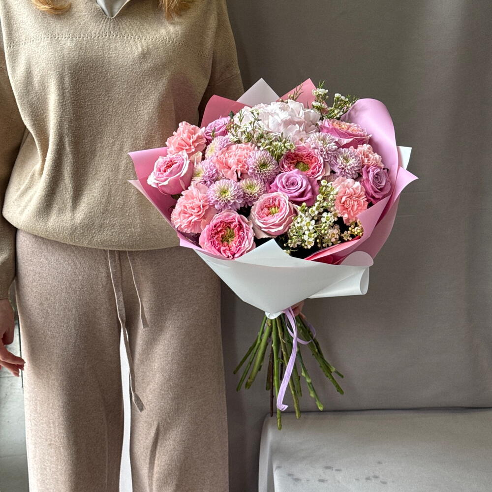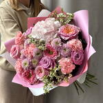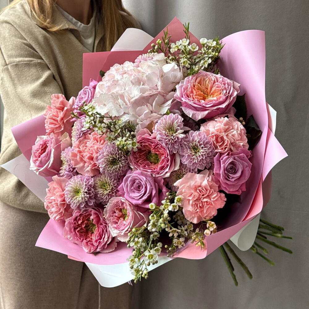 Ваксфлауэр - 3 шт. Хризантема кустовая - 4 шт. Роза - 3 шт. Диантус - 5 шт. Роза пионовидная - 5 шт. Упаковка дизайнерская - 3 шт. гортензия голландия - 1 шт.