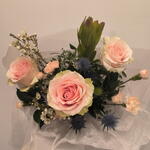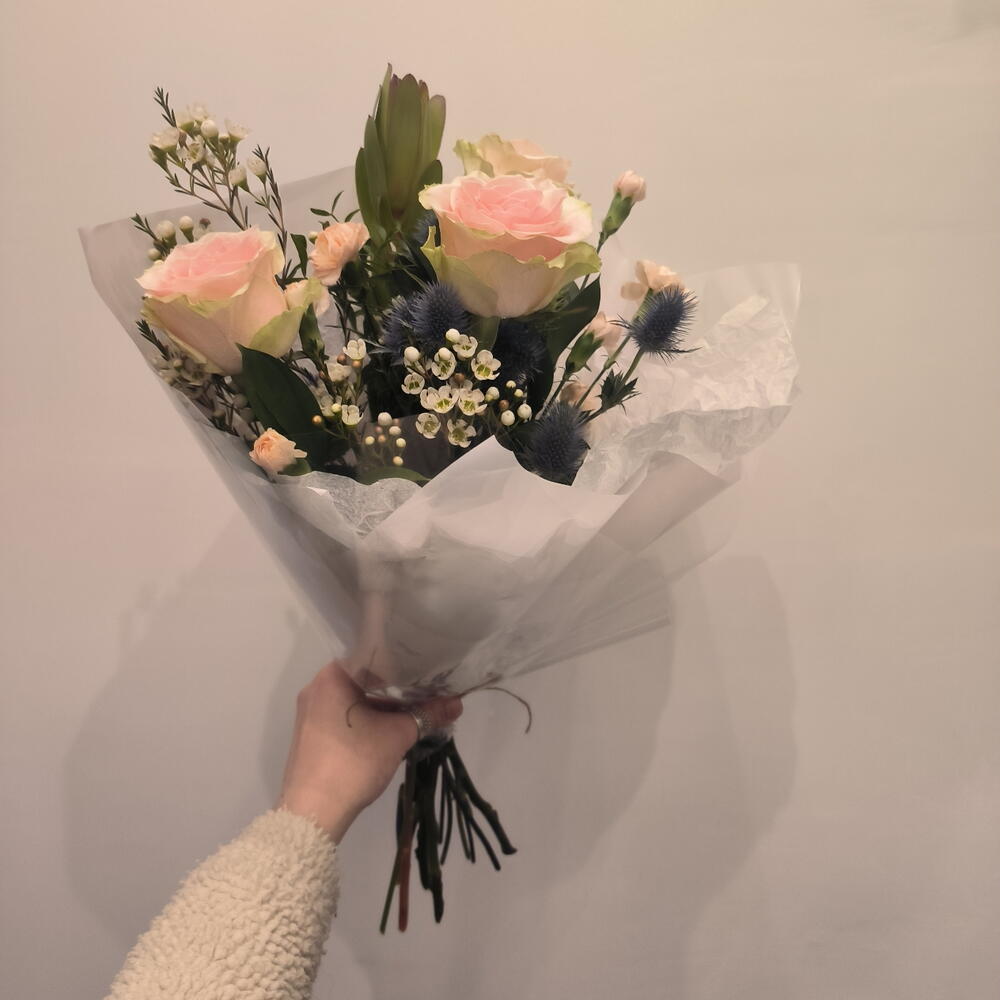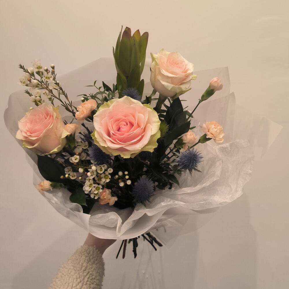 Нежный комплимент с розами, персиковыми кустовыми диантусами, синими колючками, хамелациусом и леукодендроном