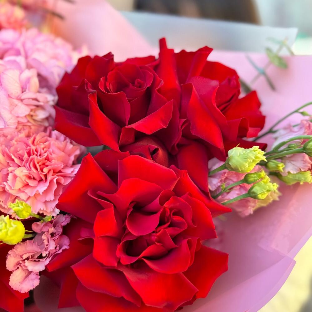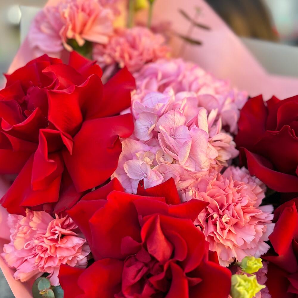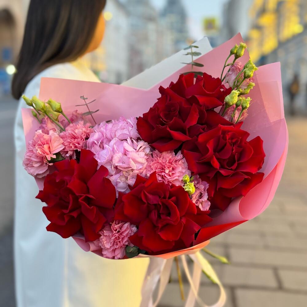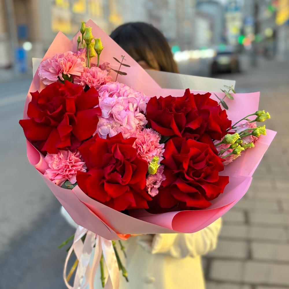 Это сочное и страстное послание любви. Красные французские розы символизируют глубокие чувства и страсть, а нежные эустомы и диантусы добавляют мягкости и изящества, объемная гортензия дополняет эффектный и выразительный образ. Такой букет — идеальный способ сказать «я люблю» ярко и искренне, он точно не останется без внимания и застанет сердце врасплох. Этот яркий букет прекрасно подойдет для романтического признания или просто чтобы сделать день особенным для близкого человека, будь то 14 февраля, 8 марта, 1 сентября, День учителя, день рождения, свидание или свадьба. Уважаемые клиенты! Пожалуйста, не пытайтесь определить размеры композиции по фото. Фотографии предназначены исключительно для того, чтобы вы могли лучше рассмотреть состав букета. Реальные размеры каждой позиции мы обязательно указываем в карточке товара. Благодарим за понимание! Как ухаживать за букетом? 1. Обновите срез букета (секатором или ножом срежьте стебли на 1 см под углом 45 градусов). 2. Поставьте цветы в вазу с холодной водой, вдали от источников тепла. 3. Меняйте воду в вазе каждый день, а срез обновляйте раз в 1-2 дня. К букету прилагается памятка по уходу за цветами и транспортировочная упаковка.