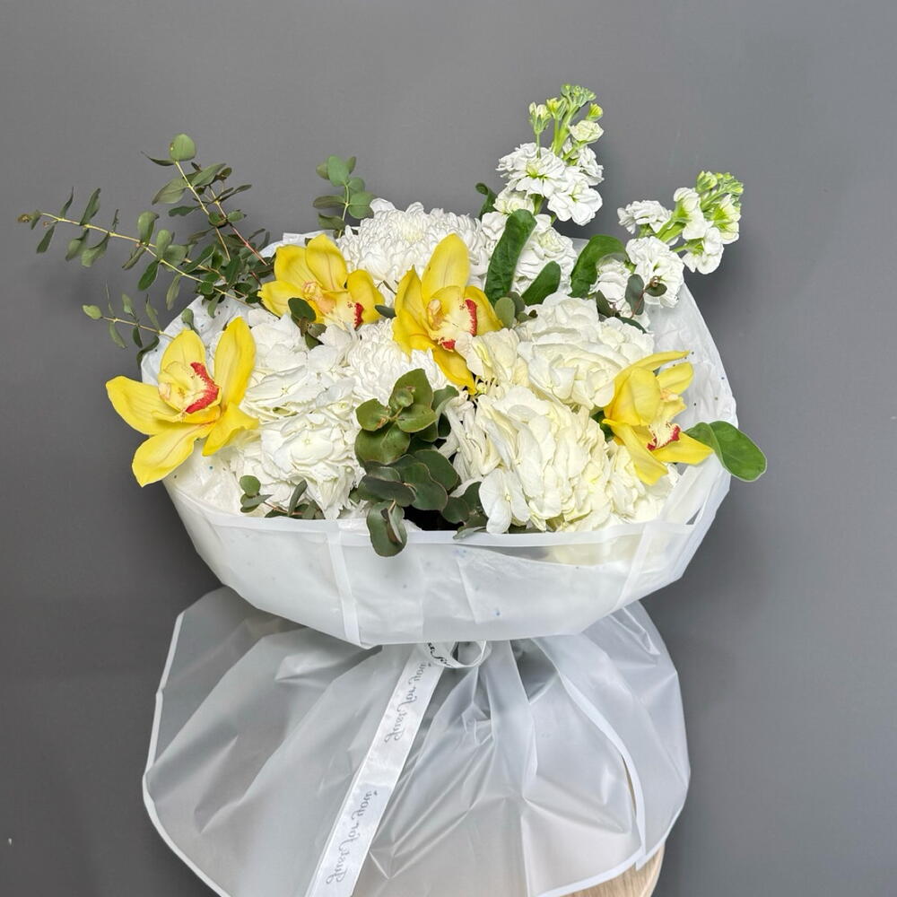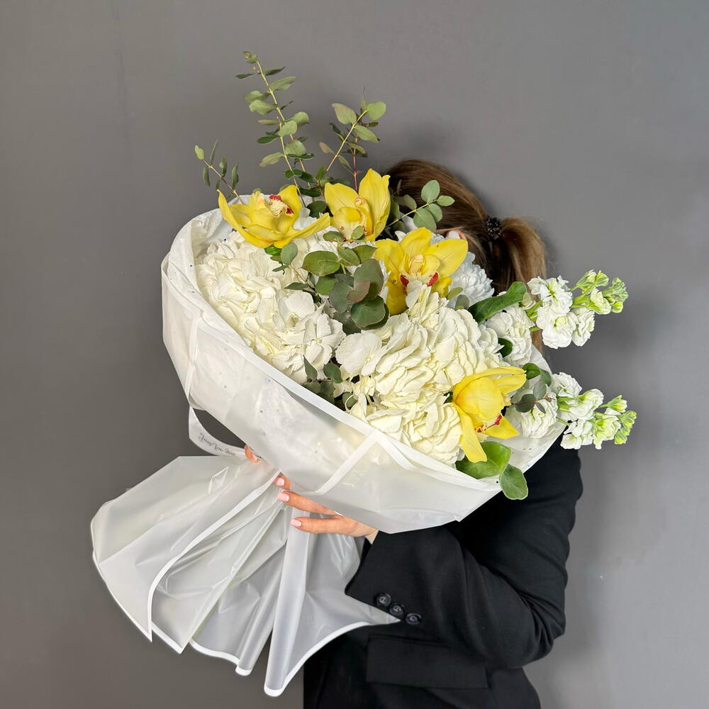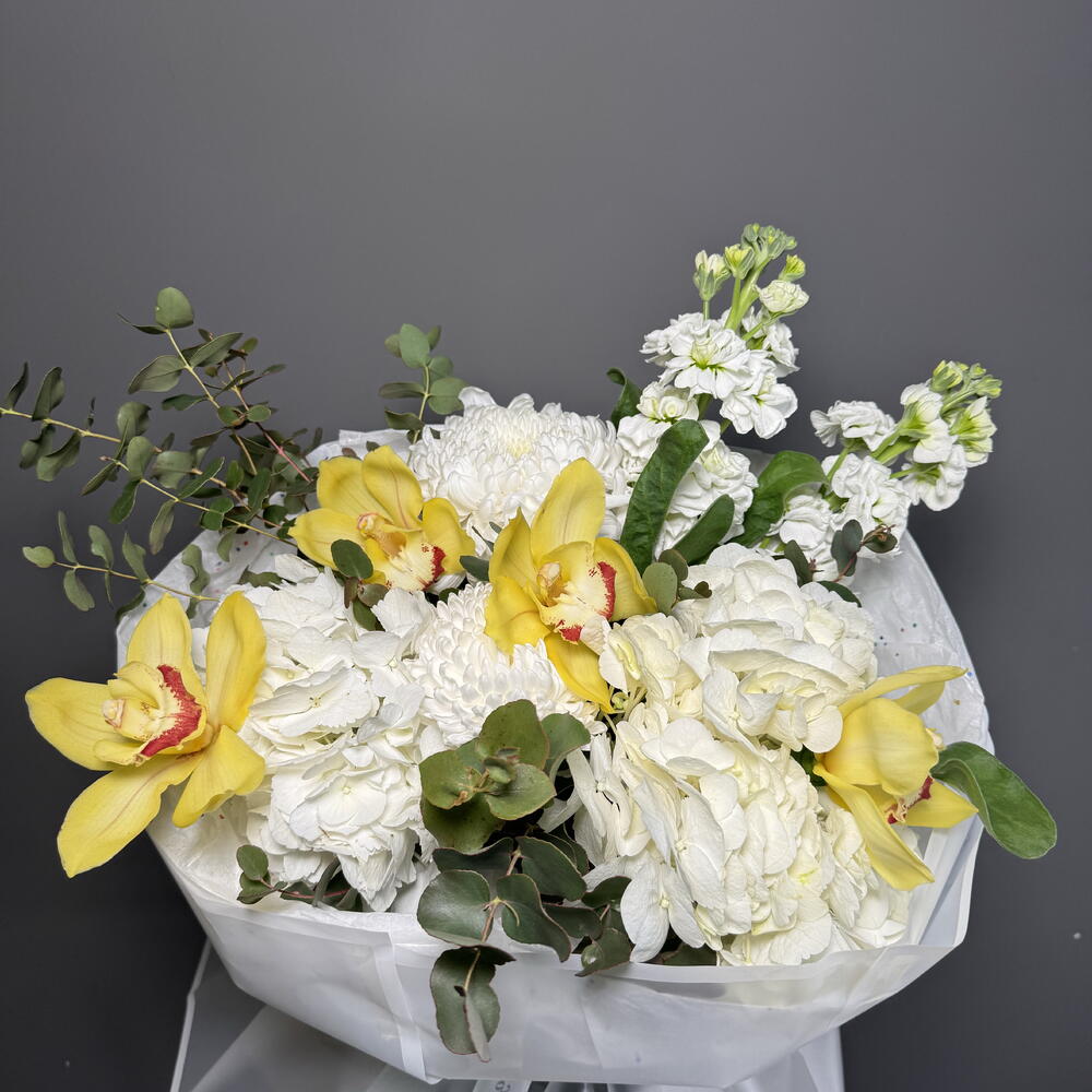 Погрузитесь в атмосферу изящества с авторским букетом, объединяющим нежность орхидей, воздушность гортензии и элегантность хризантемы. Вкусная гармония дополнена атласной лентой, стильной упаковкой и свежестью эвкалипта, создавая идеальный подарок для особого случая. Этот уникальный букет подчеркнет вашу заботу и станет ярким акцентом в любом интерьере.