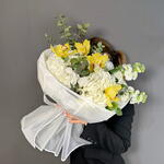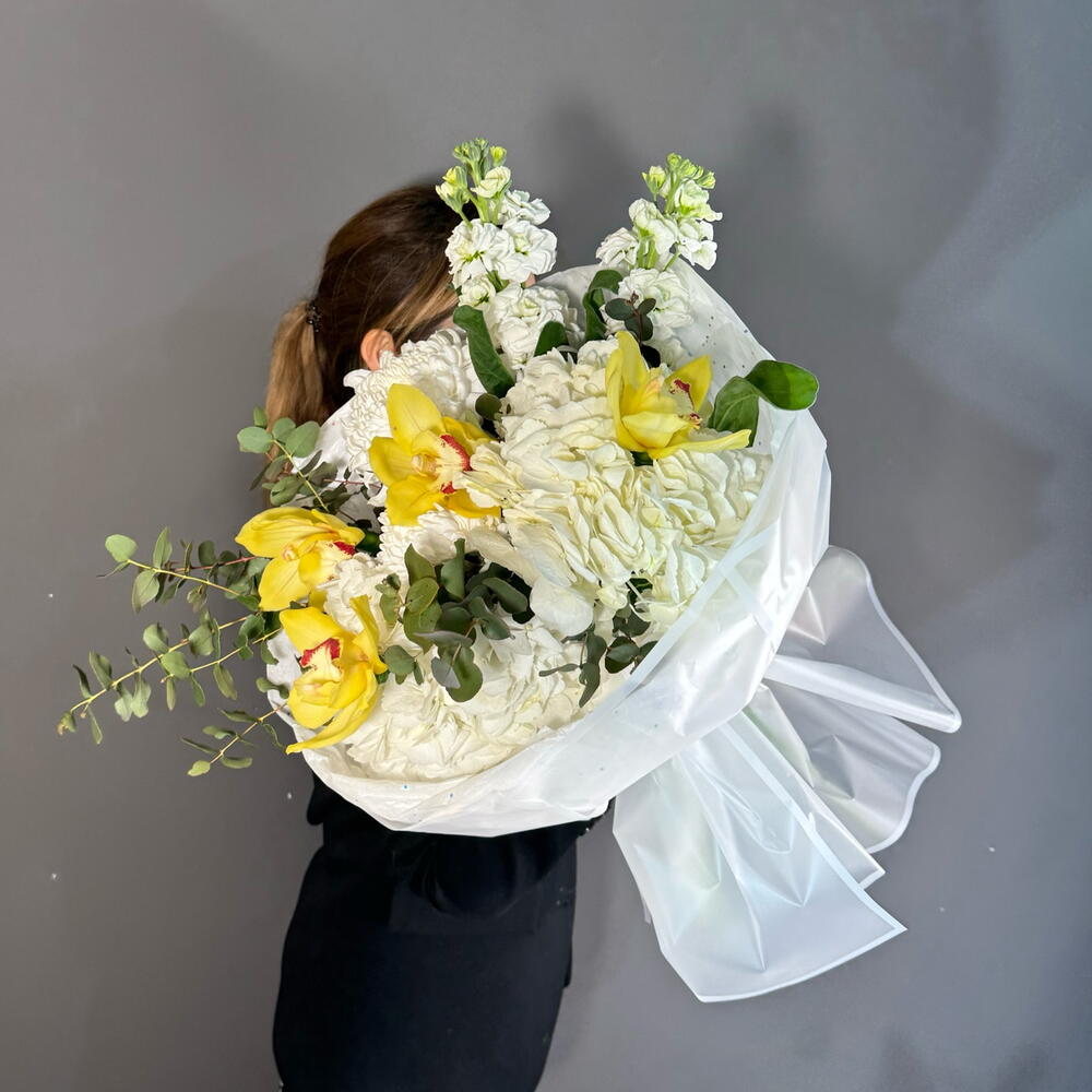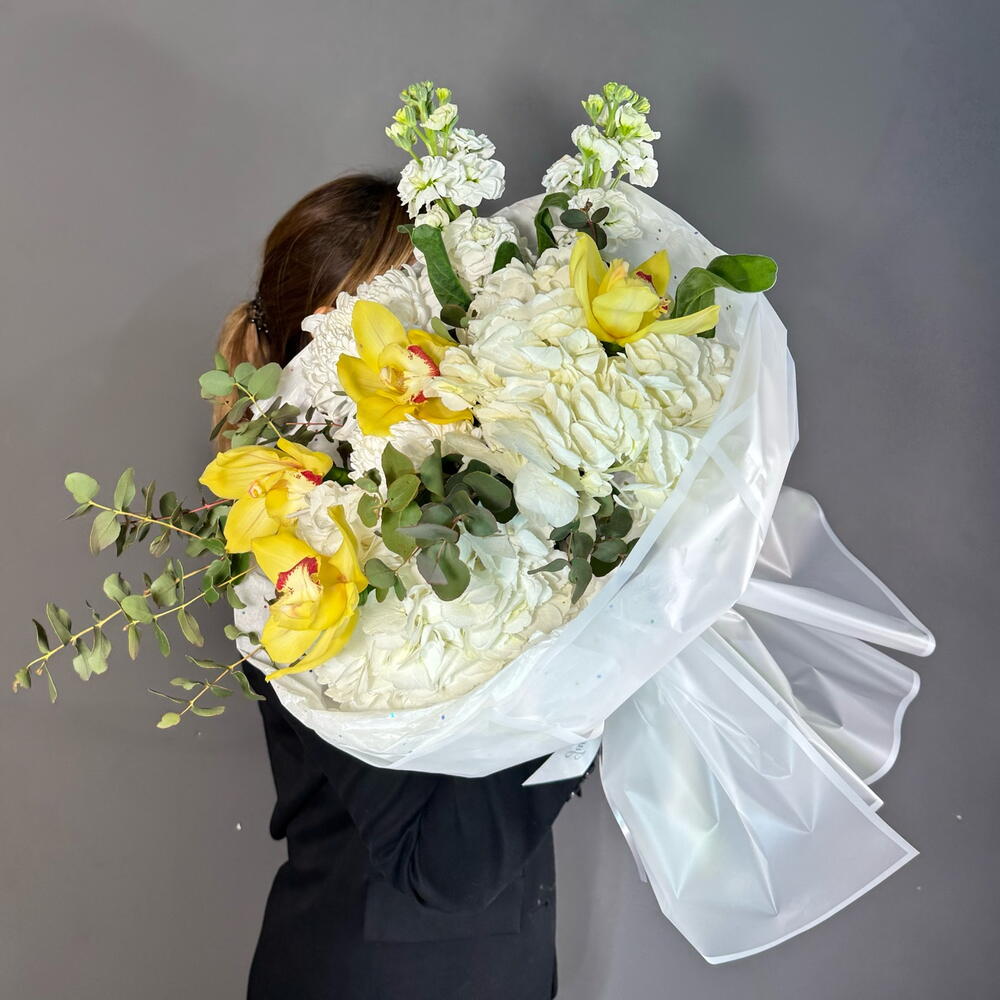 Авторский букет с орхидеей, гортензией, маттиолой