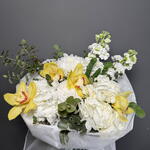 Гортензия - 2 шт. Маттиола - 2 шт. Эвкалипт - 2 шт. Лента атласная - 1 шт. Хризантема одноголовая - 2 шт. Упаковка дизайнерская - 1 шт. Орхидеи - 4 шт.