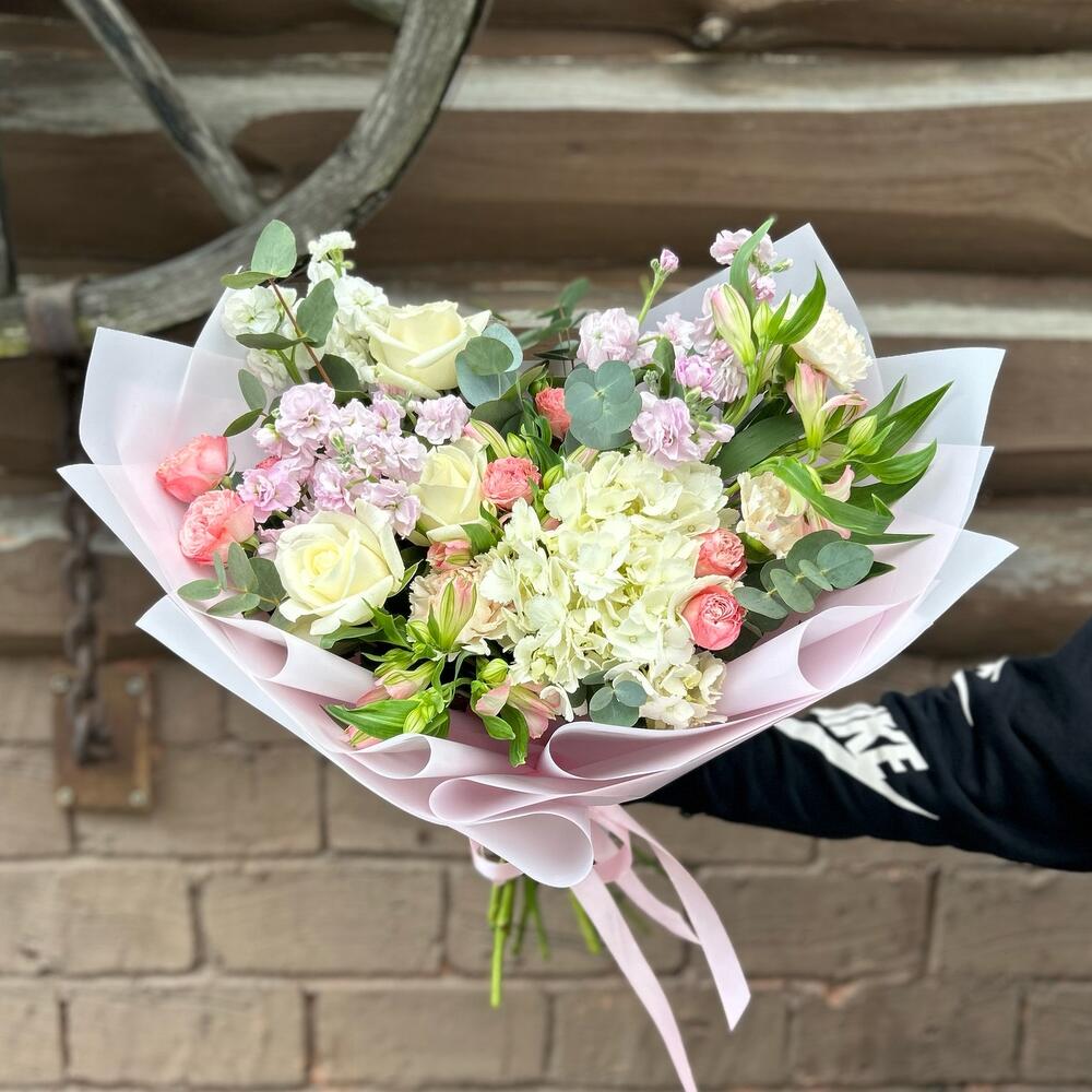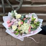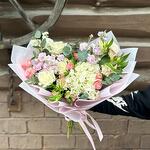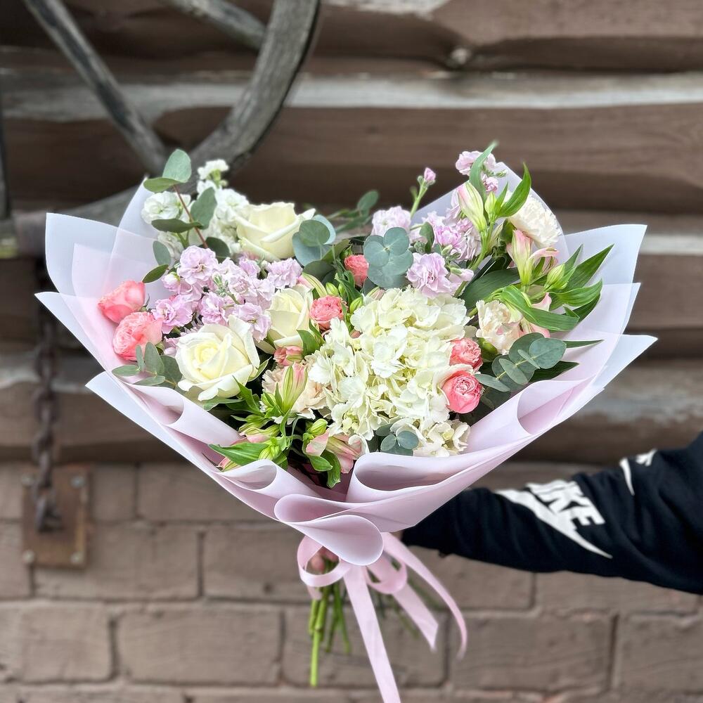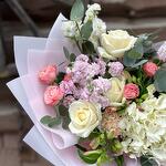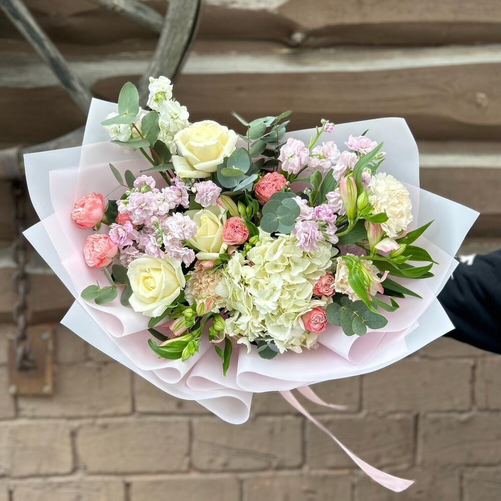 Альстромерия - 3 шт. Гортензия - 1 шт. Эвкалипт - 8 шт. Роза Эквадор - 3 шт. Лента атласная - 1 шт. Диантус - 3 шт. Упаковка дизайнерская - 1 шт. Пионовидная кустовая роза - 3 шт. маттиола кустовая - 3 шт.