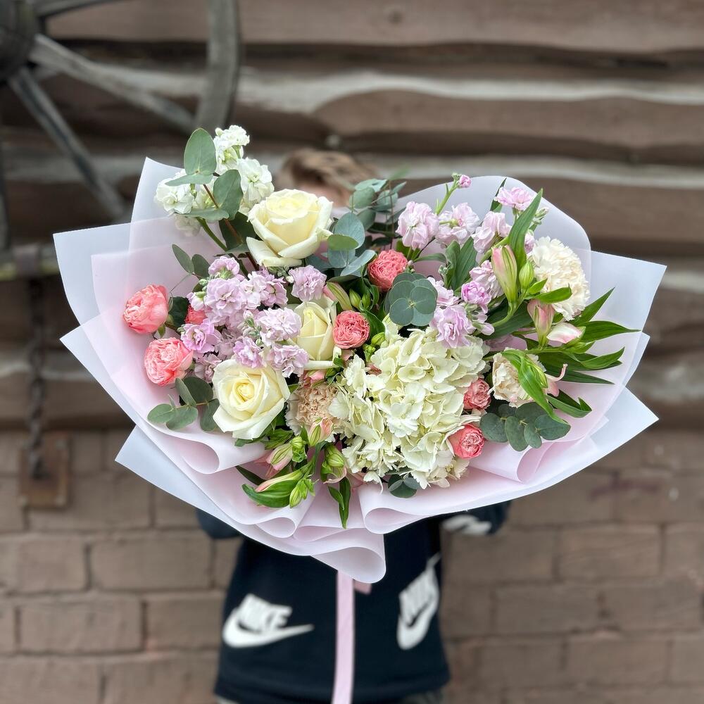Авторский Букет с Пионовидными Кустовыми Розами,Ароматной Маттиолой,Гортензией,Розами Эквадор,Альстромерии,Диантус и Эвкалипт