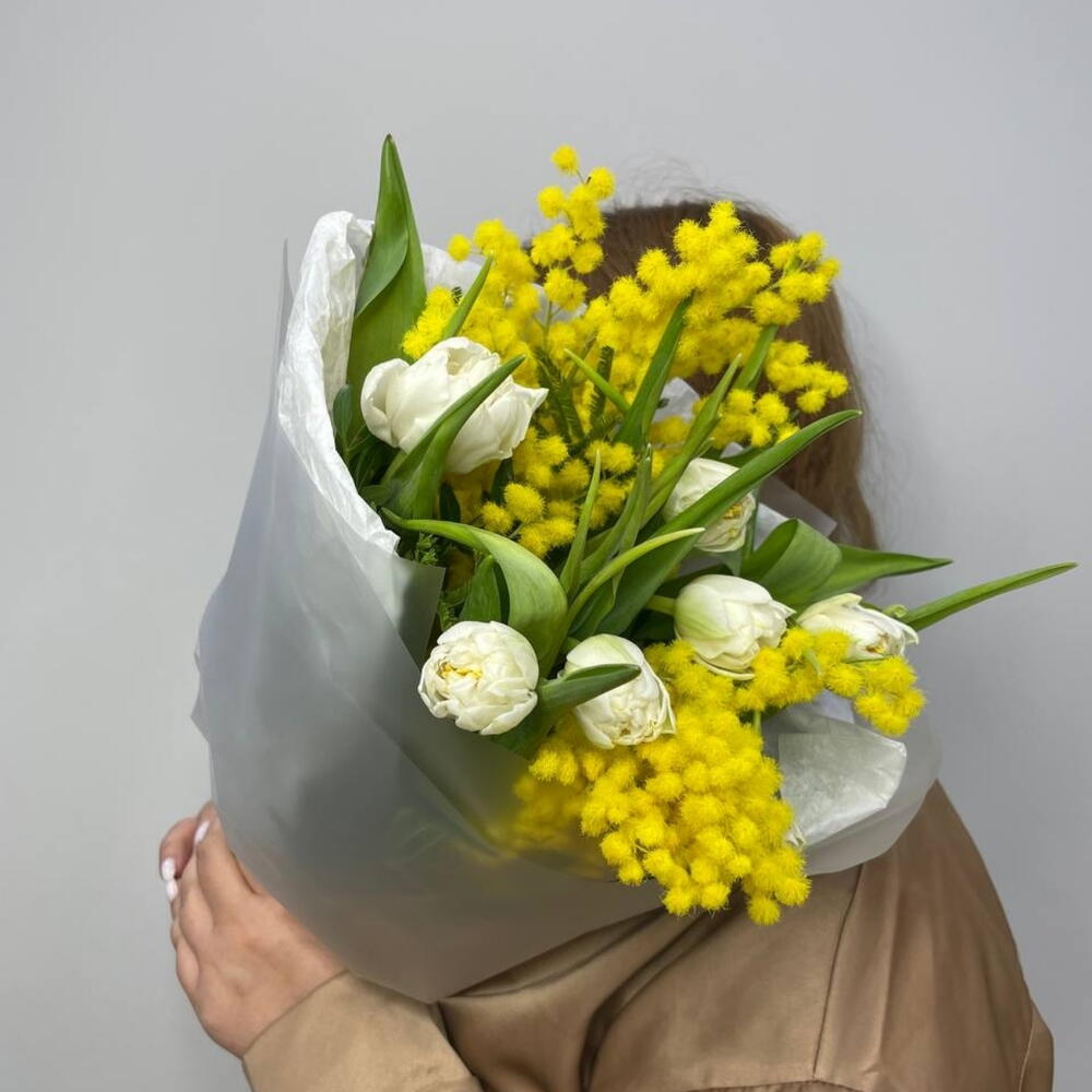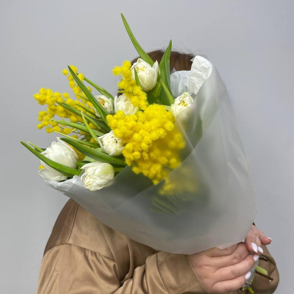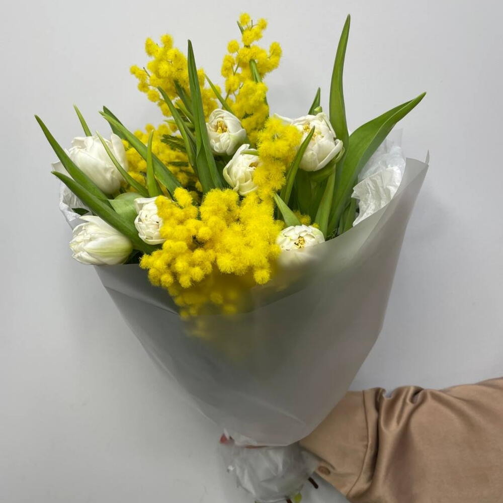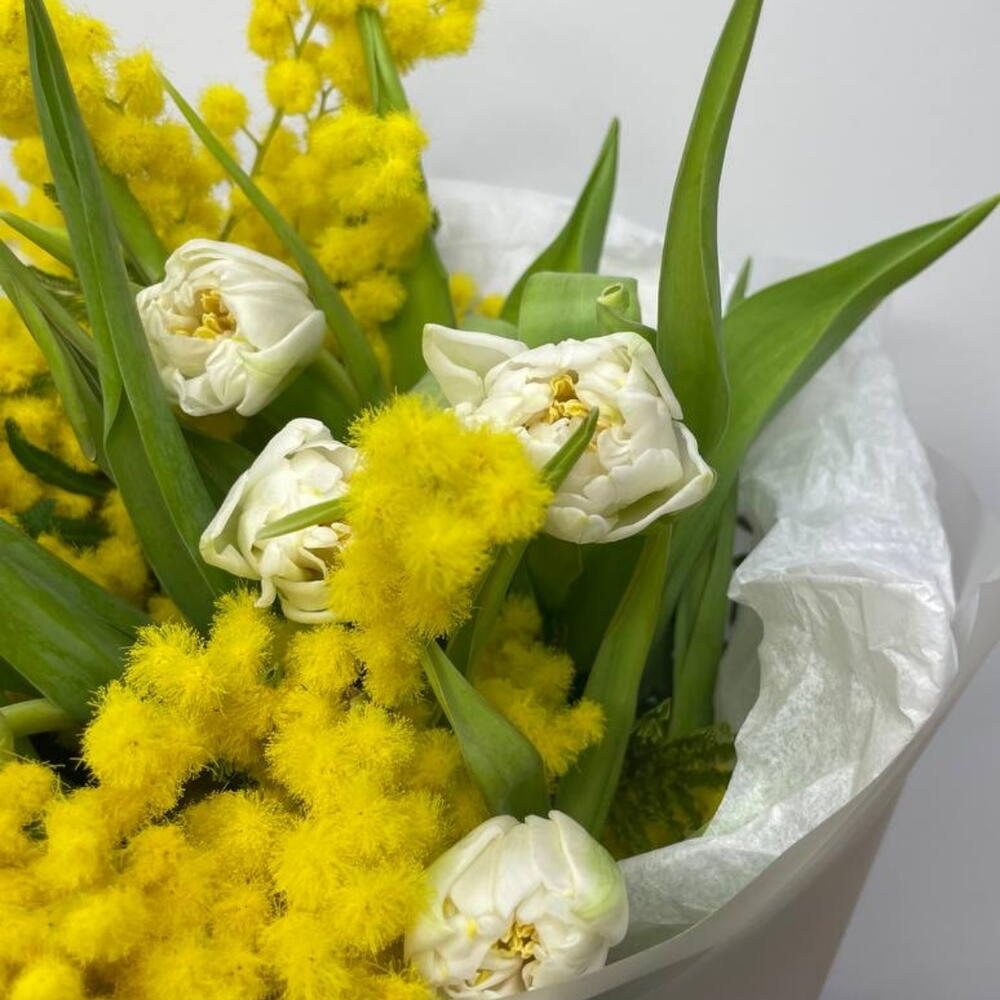 Тюльпан - 7 шт. Лента атласная - 1 шт. Упаковка дизайнерская - 1 шт. мимоза пучок - 1 шт.
