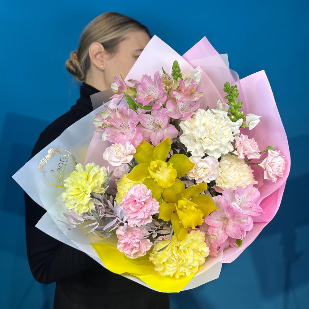 Альстромерия - 2 шт. Орхидея Цимбидиум - 2 шт. Лента атласная - 1 шт. Диантус - 5 шт. Фисташка - 1 шт. Диантус кустовой - 3 шт. Леувенбек - 2 шт. Пленка матовая - 2 шт. инструкция по уходу за цветами - 1 шт. минералы для срезанных цветов - 1 шт. персональная открытка с вашим пожеланием. - 1 шт.