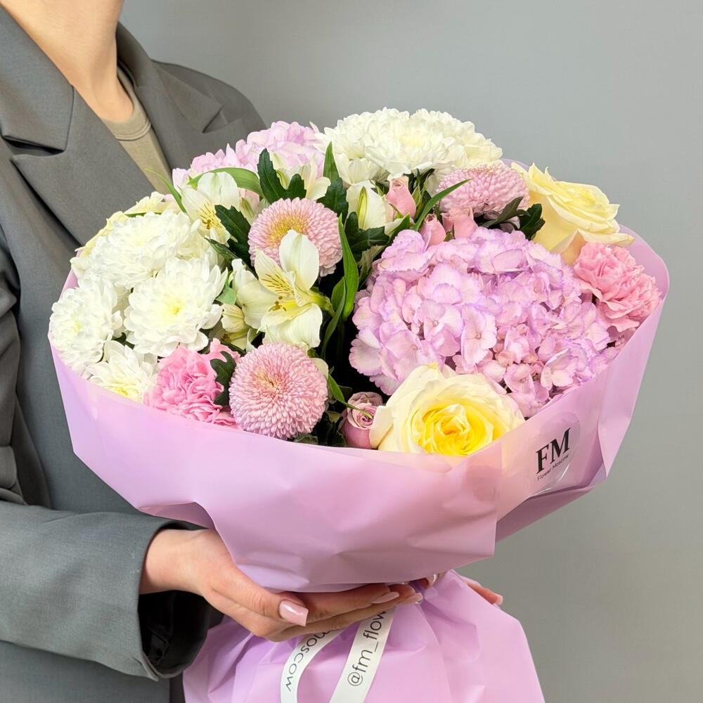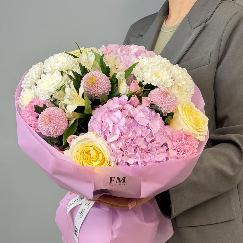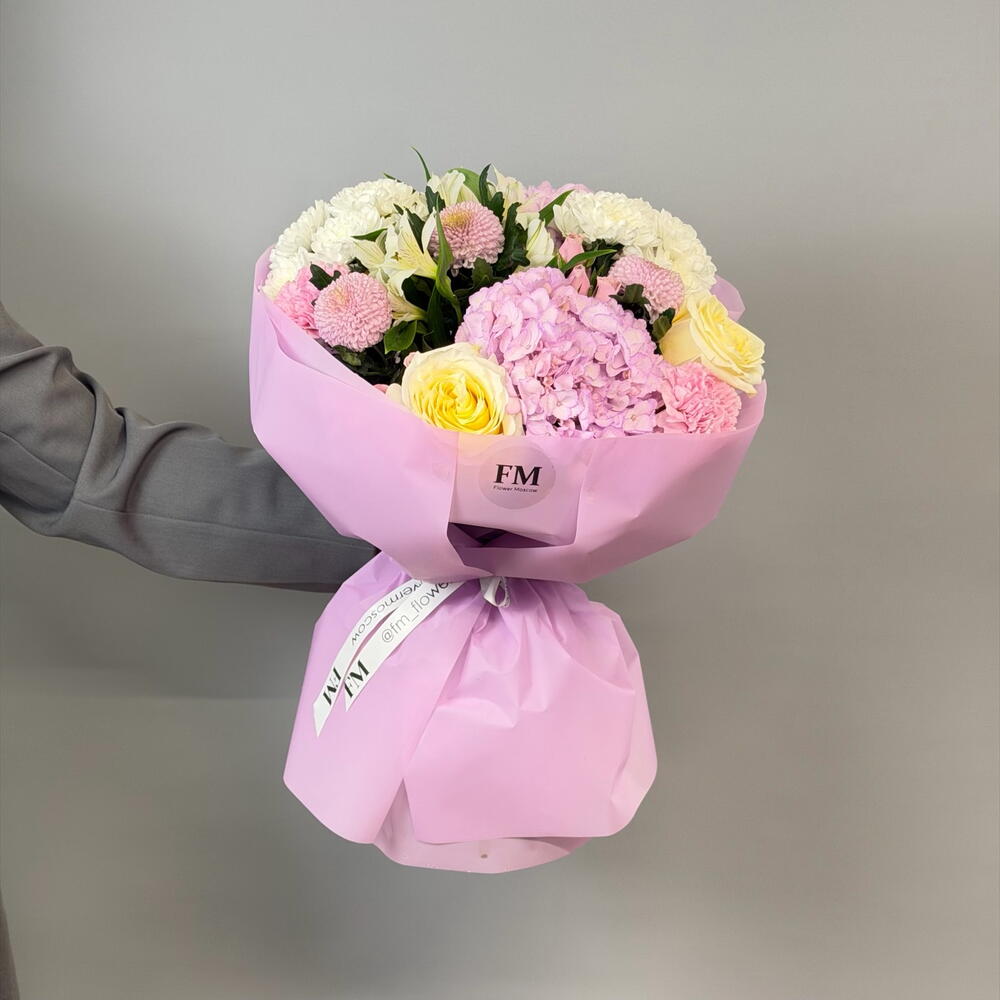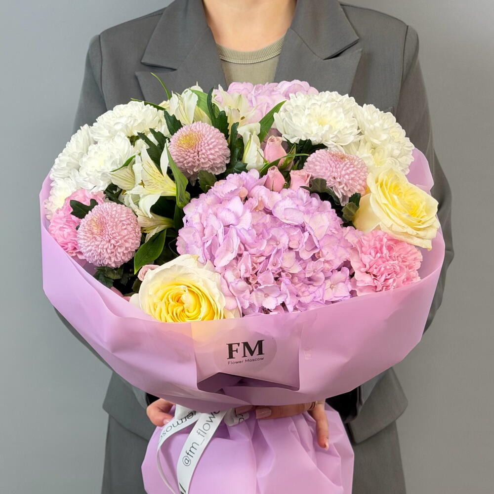 Альстромерия - 2 шт. Гортензия - 2 шт. Роза кустовая - 3 шт. Хризантема кустовая - 2 шт. Гвоздика - 3 шт. Упаковка дизайнерская - 1 шт. момоко - 3 шт.