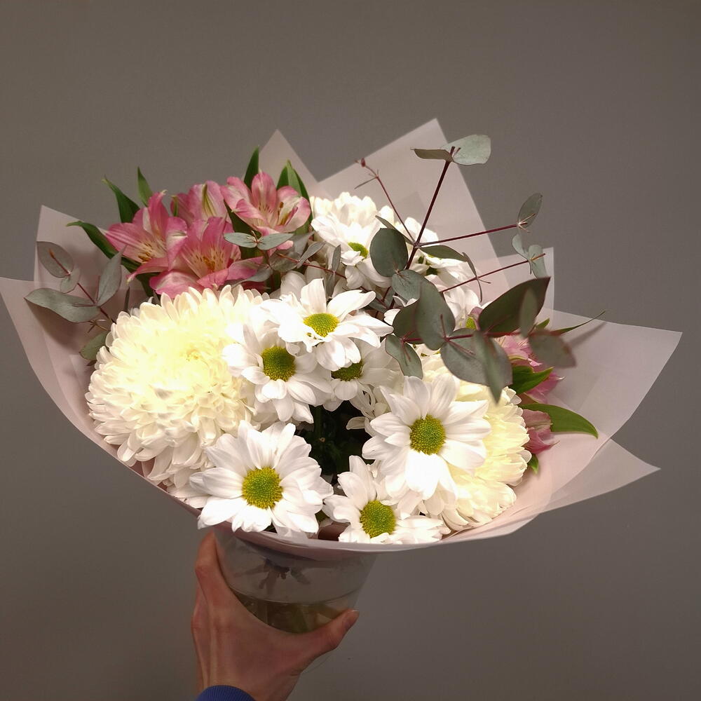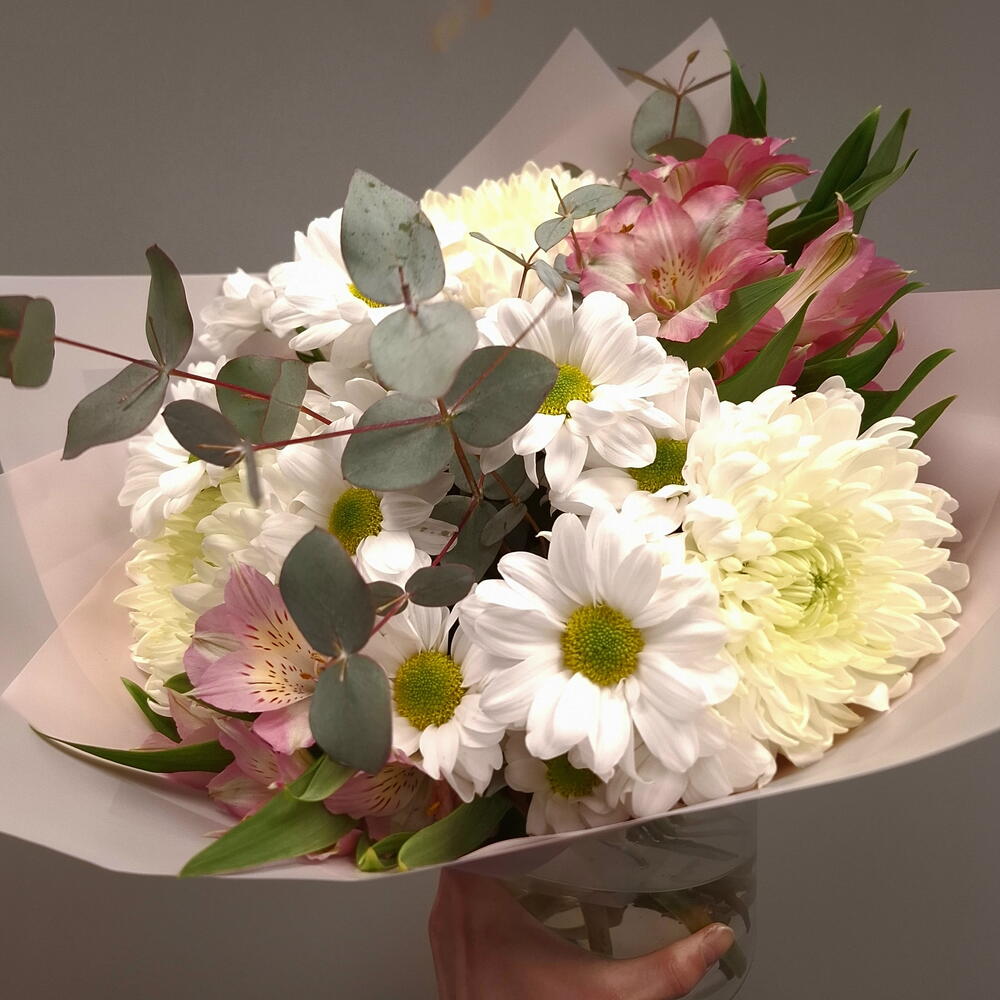 Альстромерия - 2 шт. Гиперикум - 1 шт. Хризантема кустовая - 2 шт. Хризантема одноголовая - 3 шт. Эвкалипт Синерия - 2 шт.