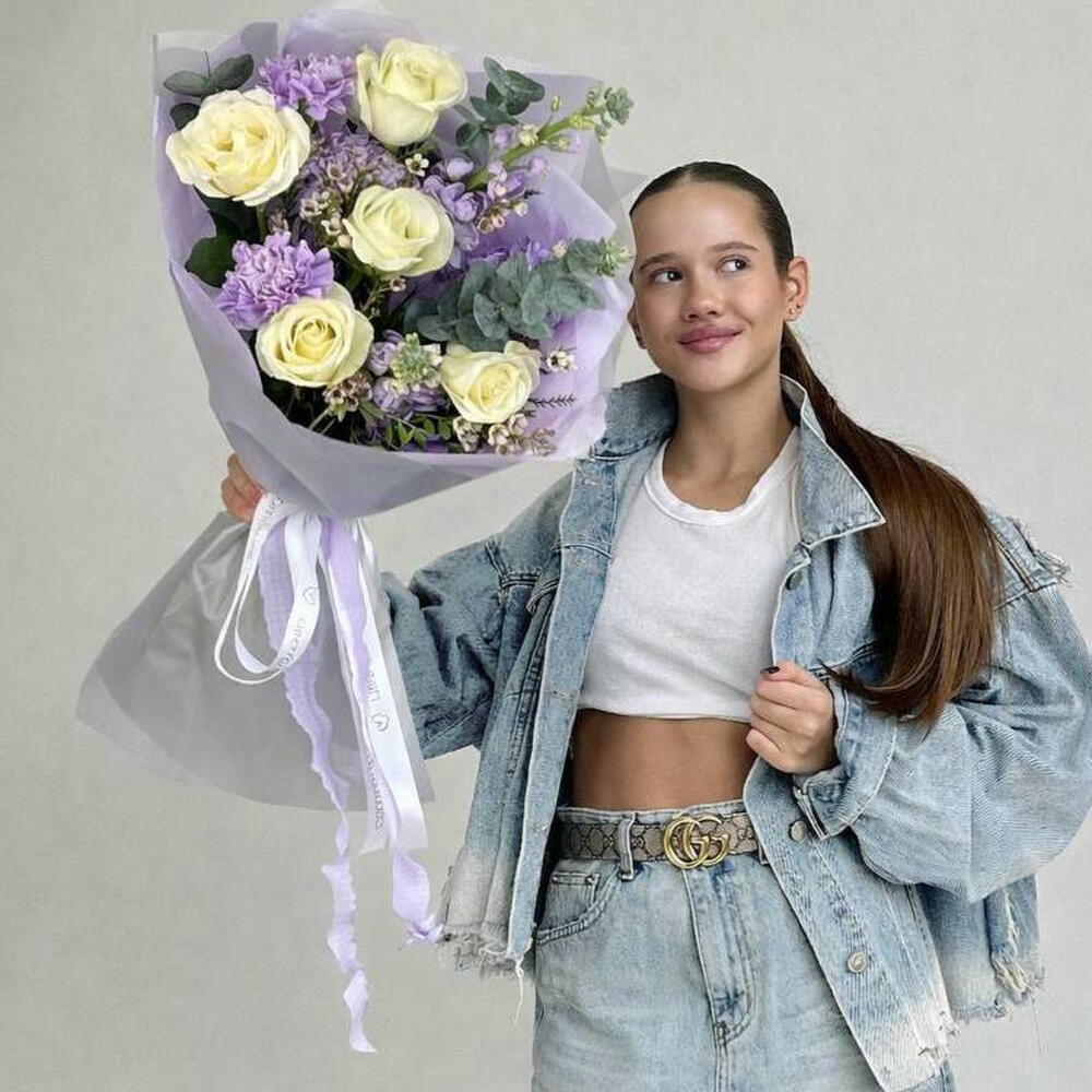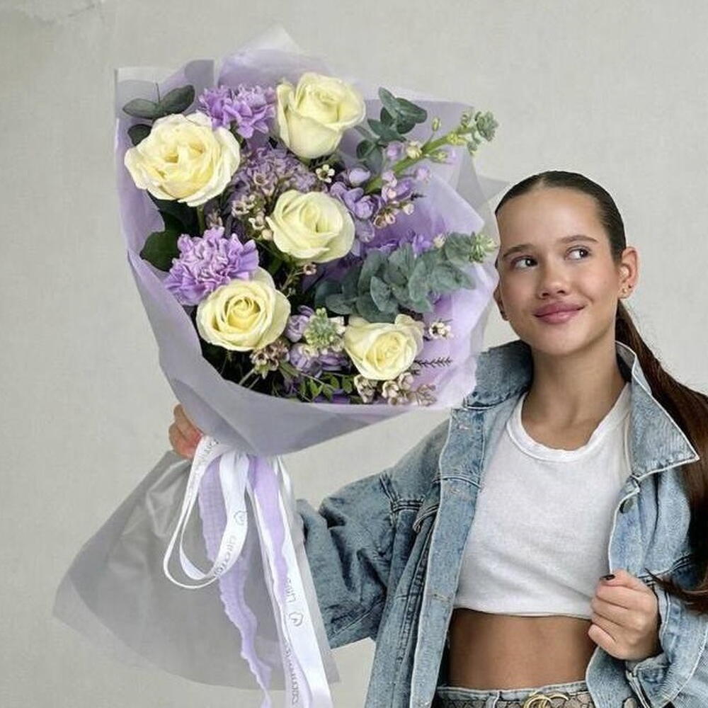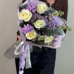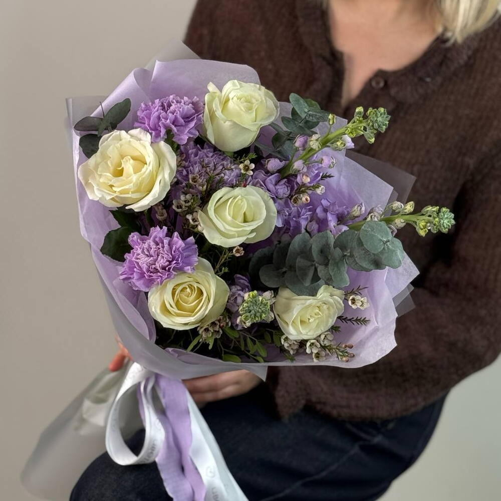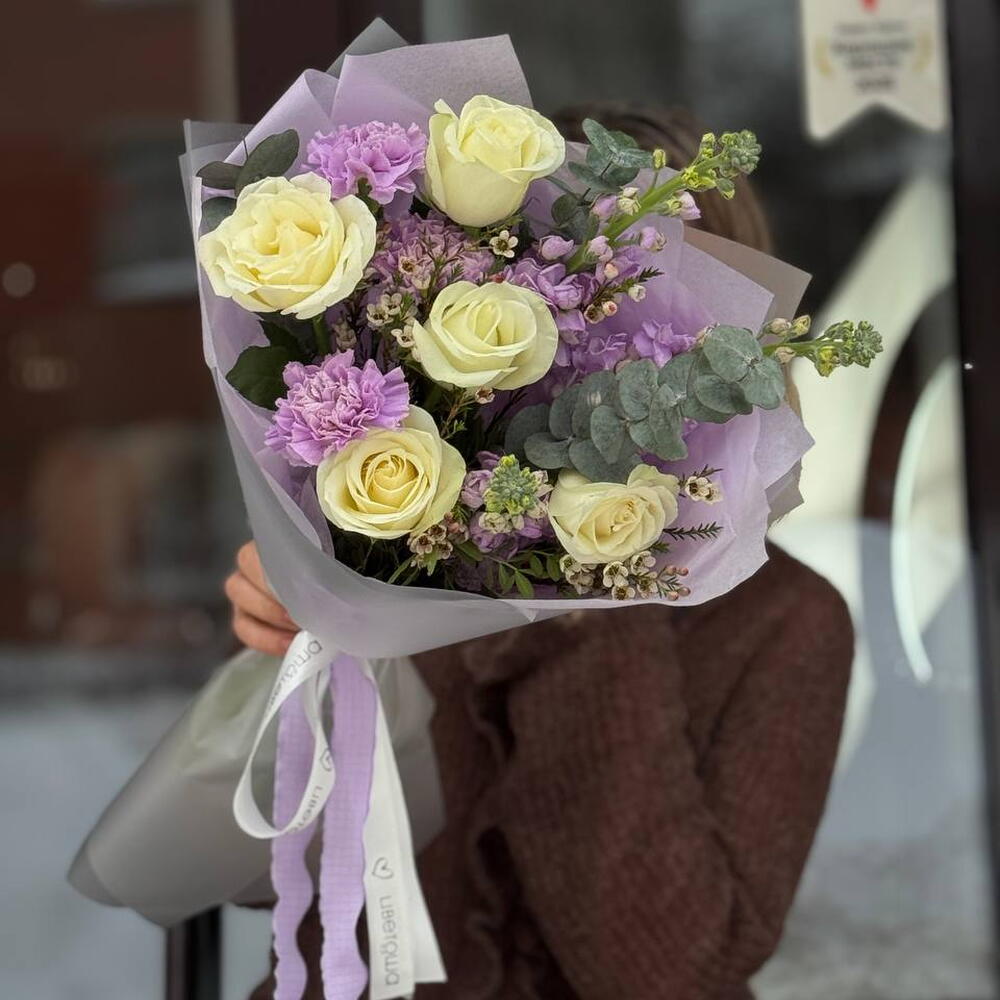 Маттиола - 3 шт. Эвкалипт - 1 шт. Фисташка - 1 шт. Хамелациум - 1 шт. Гвоздика цветная - 3 шт. роза кения белая 50 см - 5 шт.