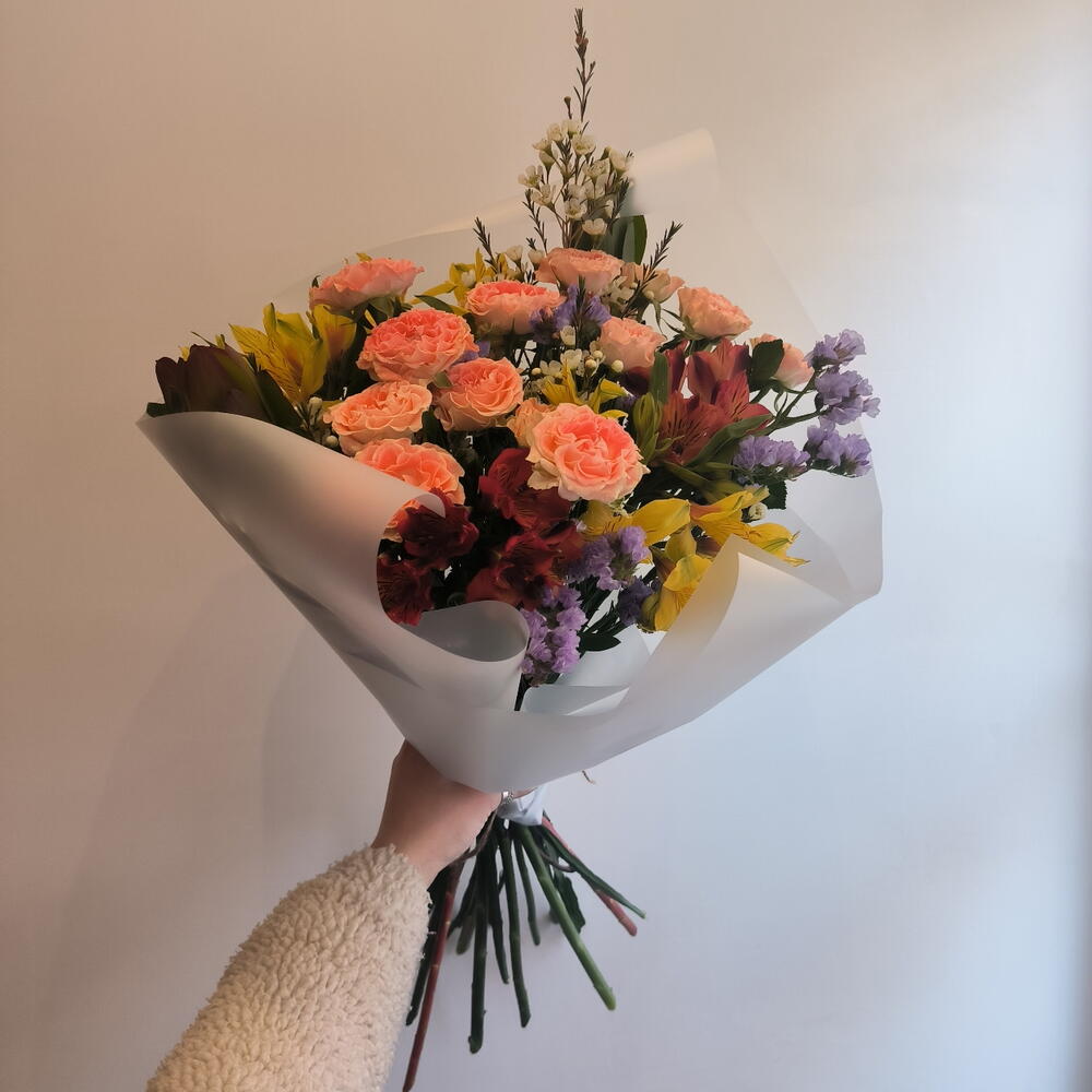 Авторский букет Весенний день с кустовой пионовидной розой альстромериями леукодендронами лимониумом и ваксфлауэром