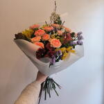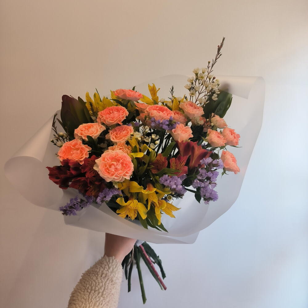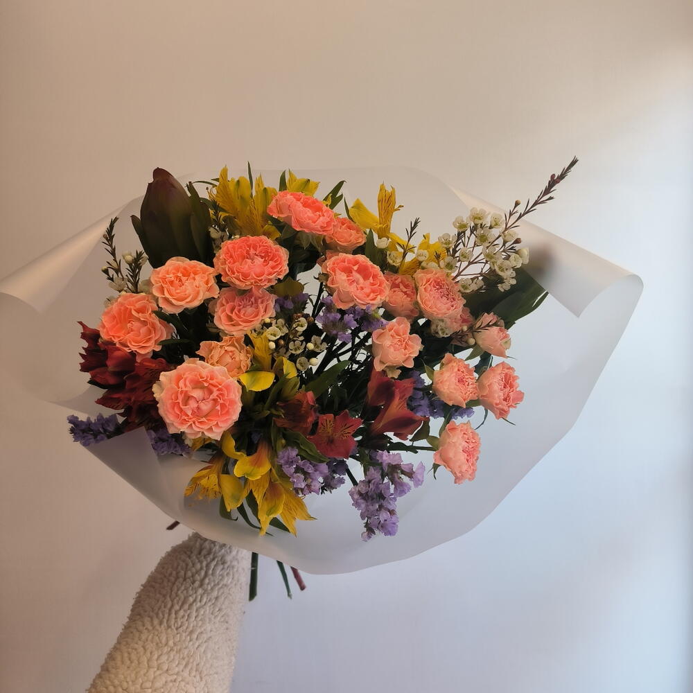 Невероятный яркий сочный комплимент!! Пионовидные кустовые розы это нежность букета, артишоки-леукодендроны ноты экзотики, микс ярких шапок альстромерии-это объем и солнечное настроение, хамелациум с его иголочками и цветками-это характер. Фиолетовая статица добавляет красок, оттенков и фактур.