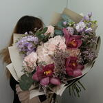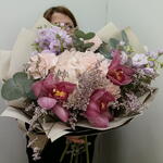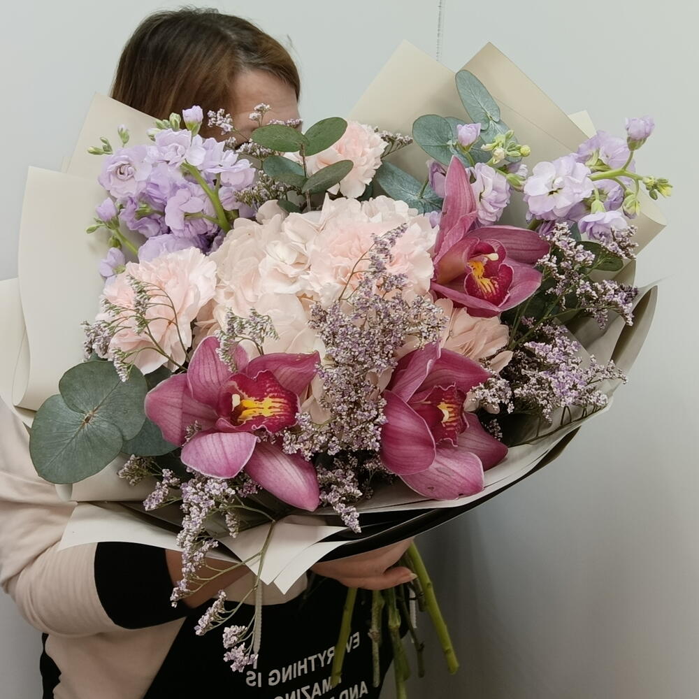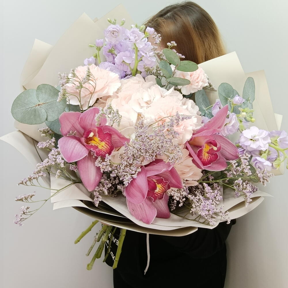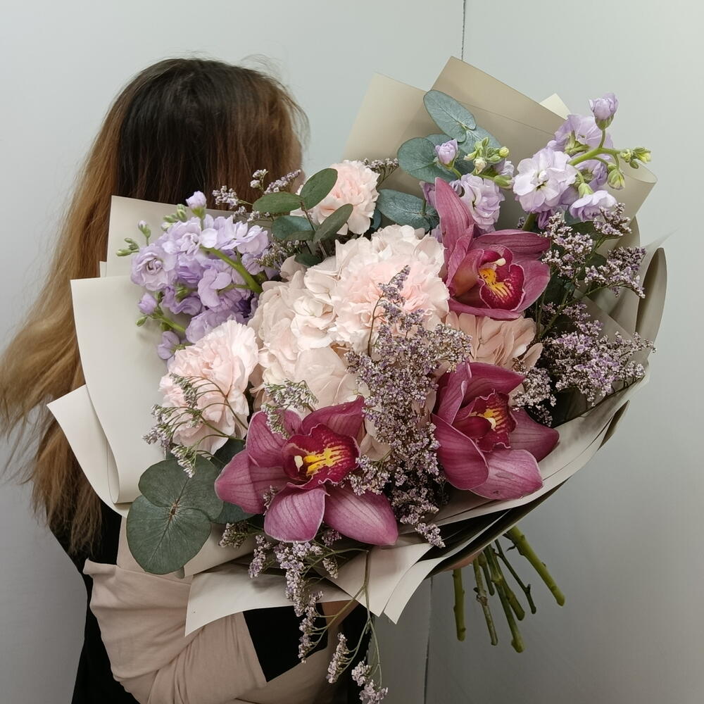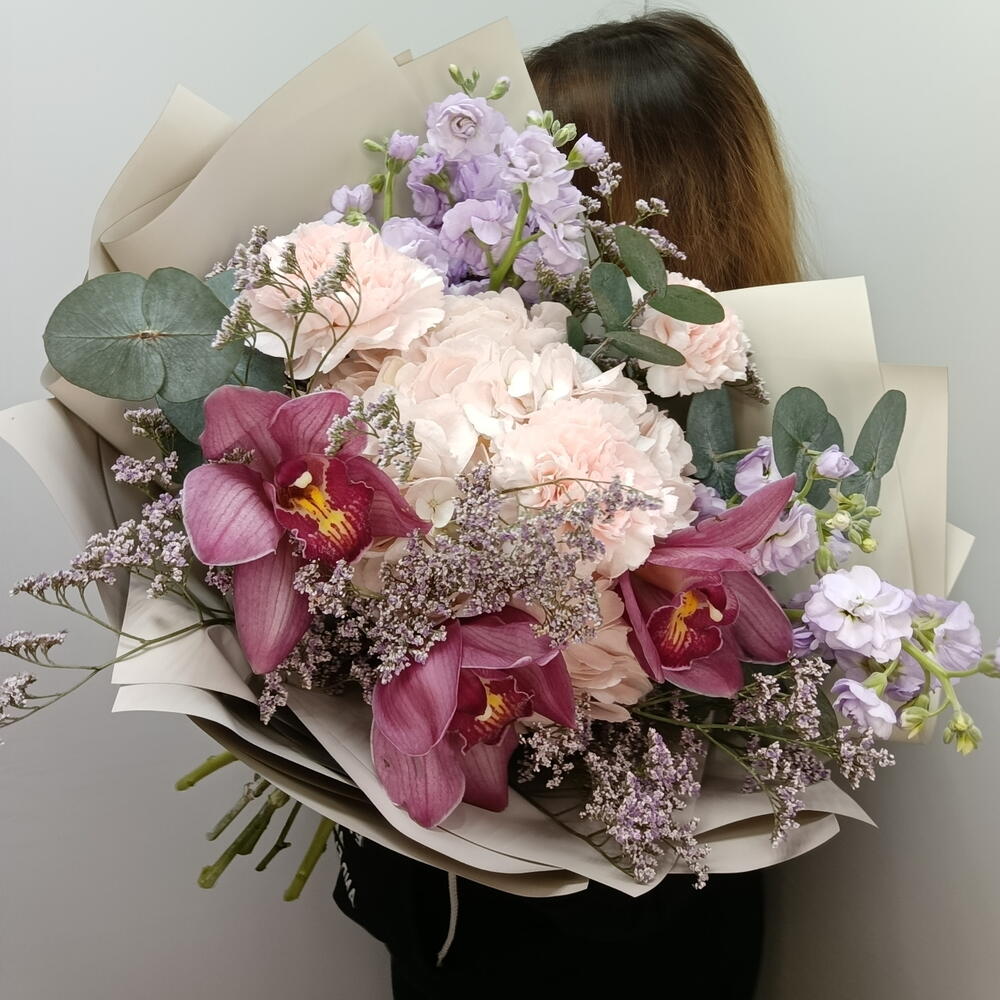 Гортензия - 1 шт. Лимониум - 3 шт. Лента атласная - 2 шт. Диантус - 3 шт. Упаковка дизайнерская - 6 шт. Эвкалипт Цинерея - 5 шт. маттиола кустовая - 2 шт. Орхидеи Цимбидиум Розовый - 3 шт.