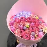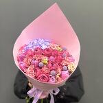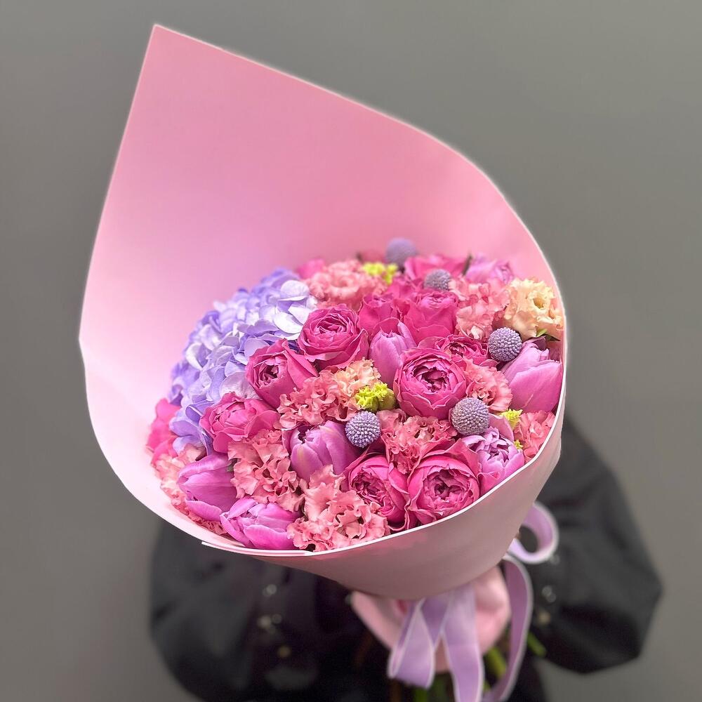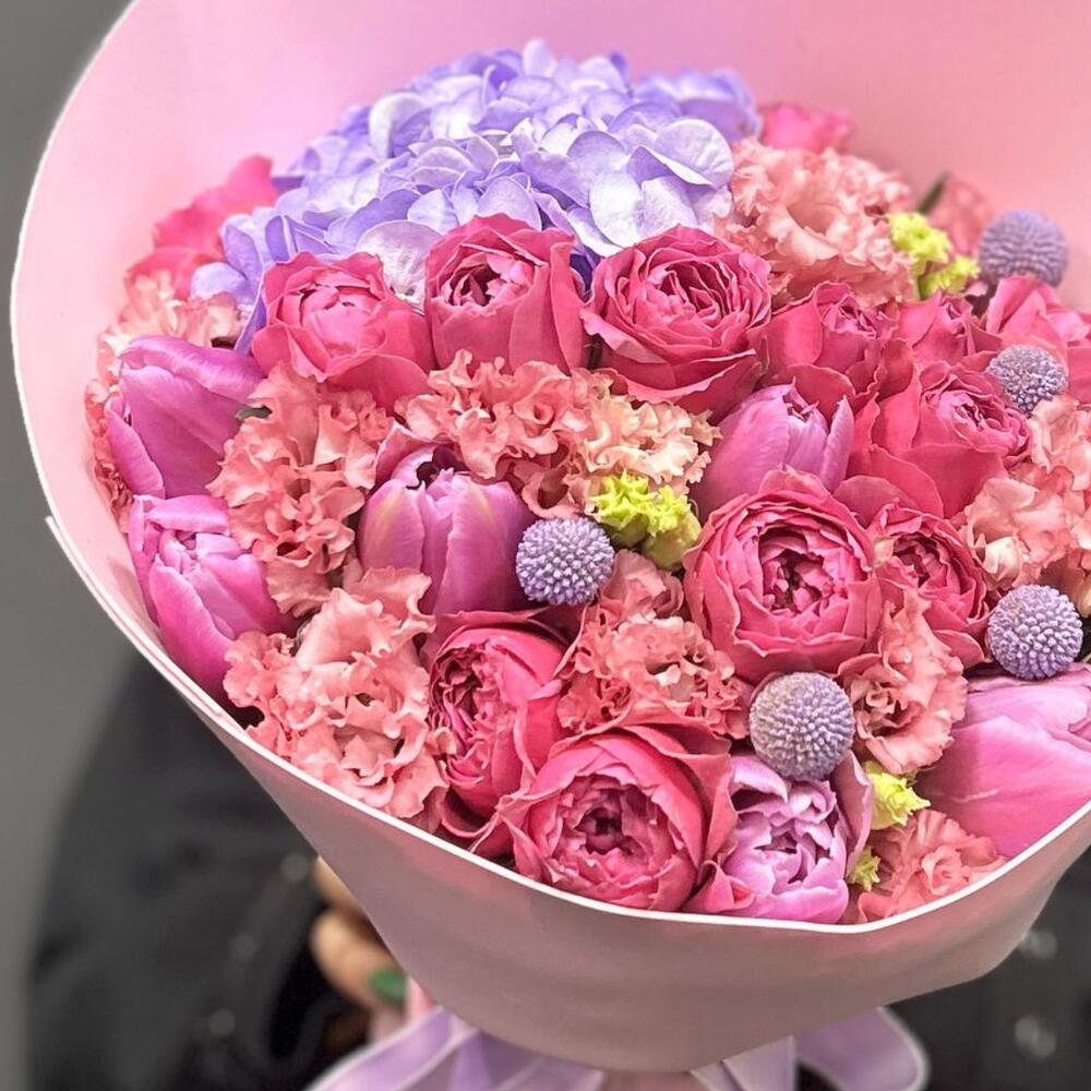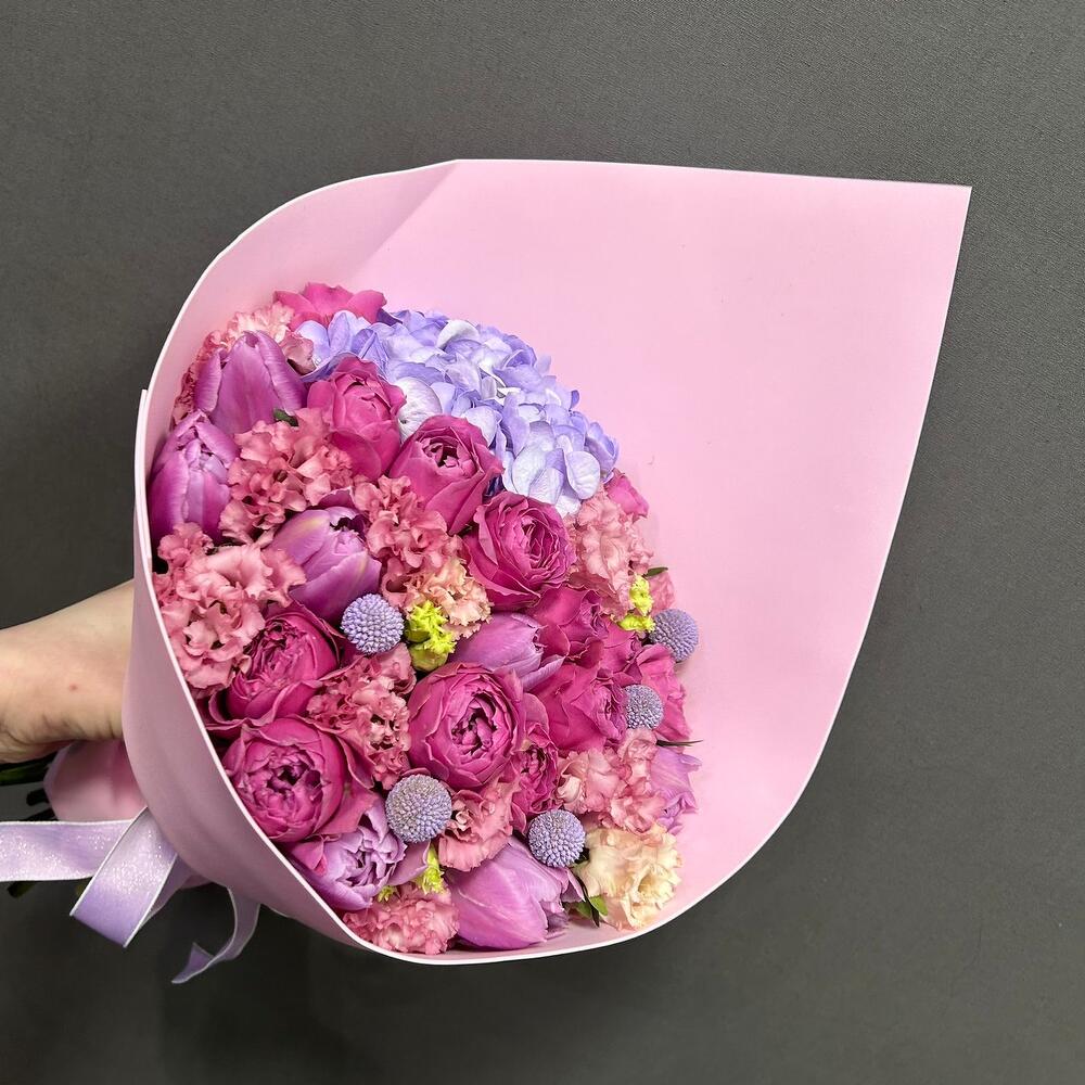 Авторский букет с роскошными пионовидными кустовыми розами сорта Мисти Баблс, гортензией сиреневого цвета, шариками краспедии, тюльпанами и эустомой. Букет упакован в фоамиран с добавлением атласных лент.