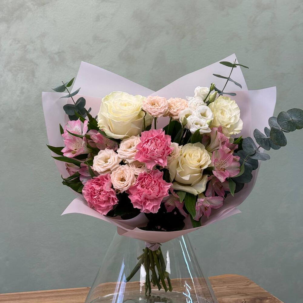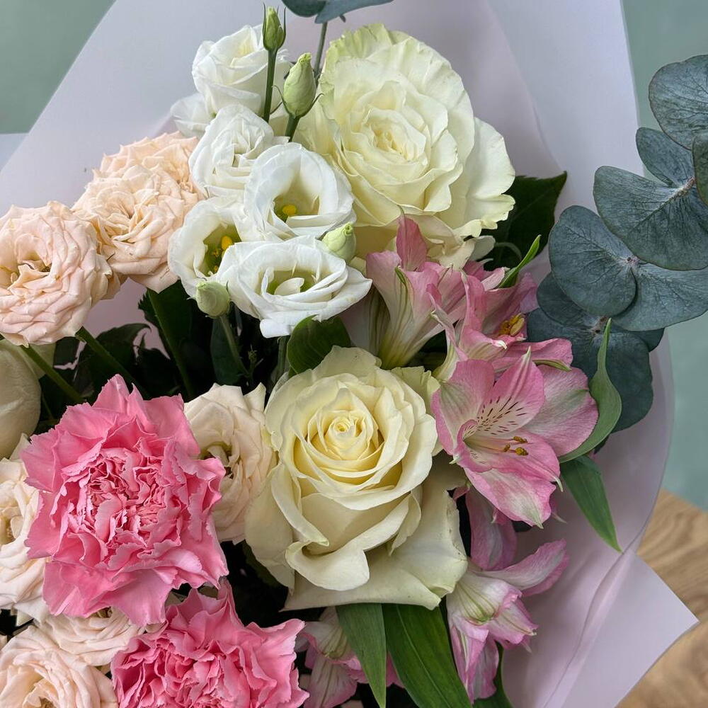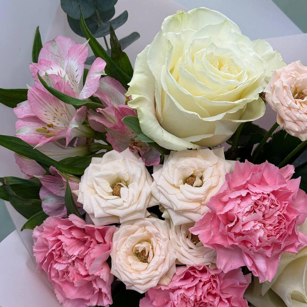 🌹 Белоснежная гармония Нежные белые розы, элегантная эустома и очаровательные диантусы создают идеальный букет чистоты и свежести. Подчеркнет ваши искренние чувства и станет прекрасным подарком для любого случая.