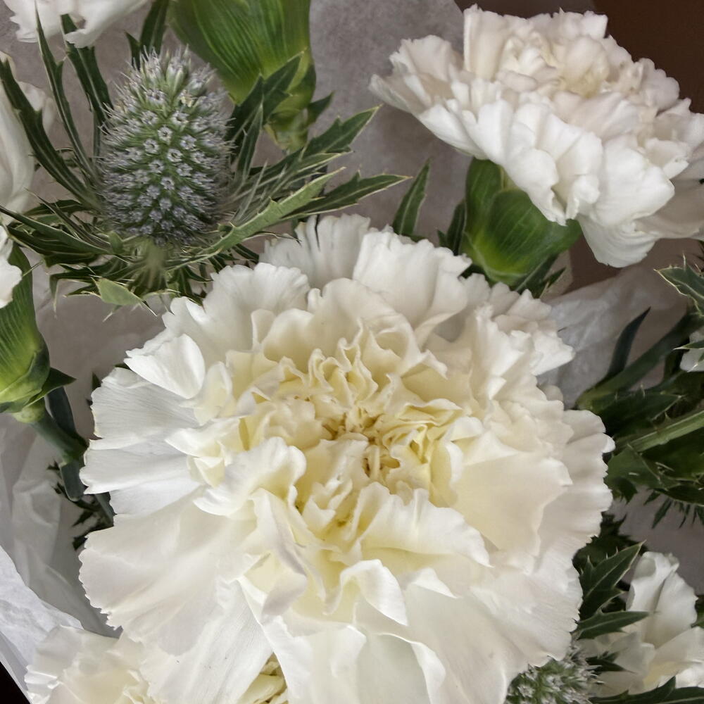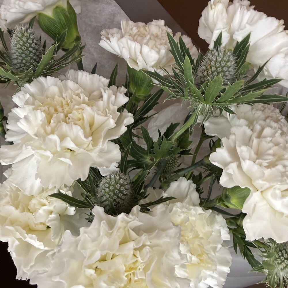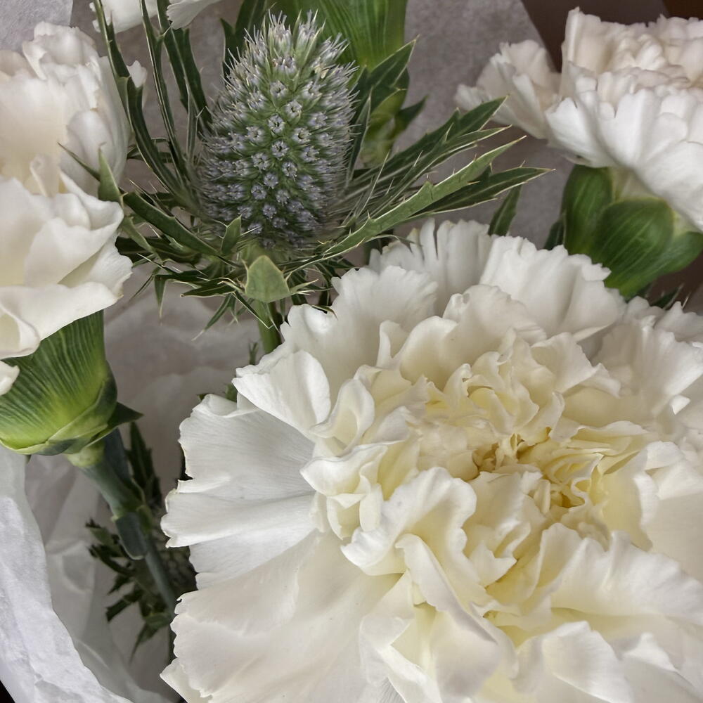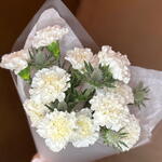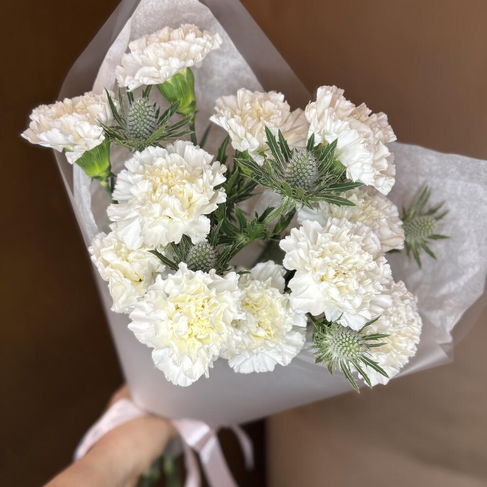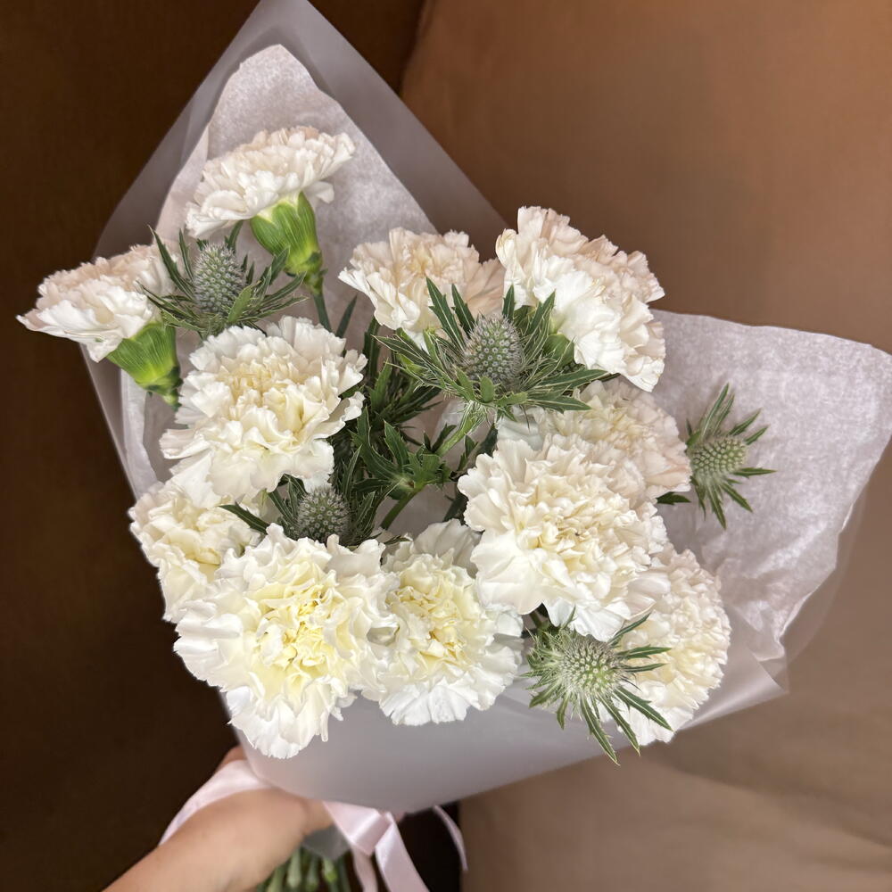 Открыточка с вашими пожеланиями - 1 шт. Средство для продления жизни цветов - 1 шт. Эрингиум зеленый - 2 шт. гвоздика диантус - 11 шт. упаковка транспортировочная - 1 шт. упаковка матовая корейская пленка - 1 шт.