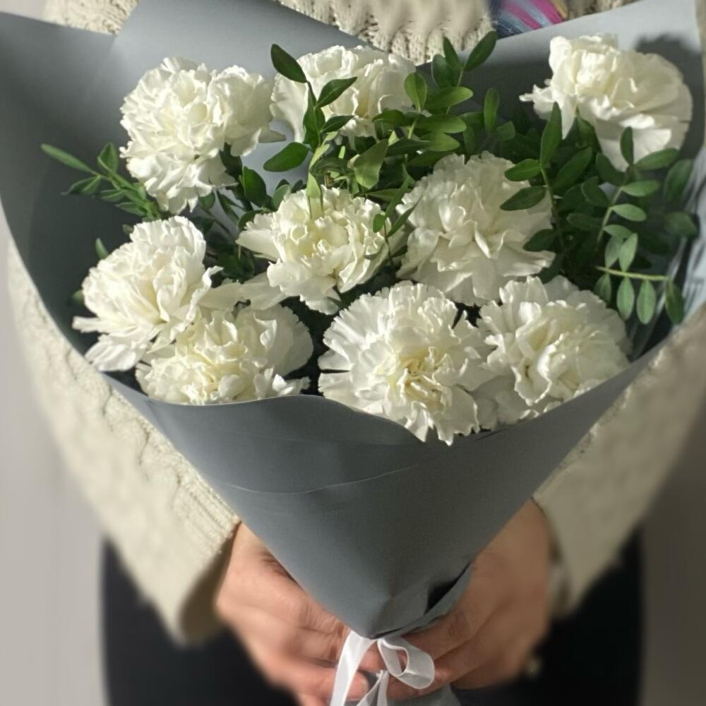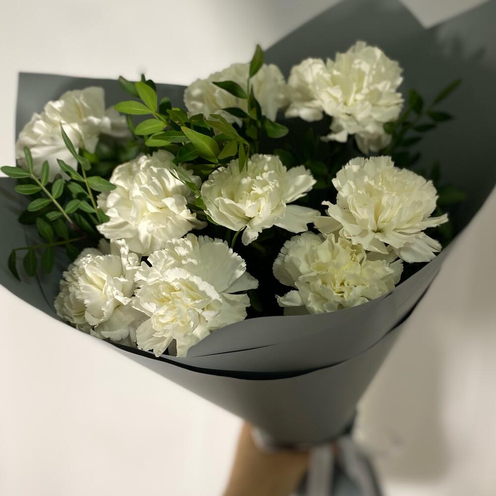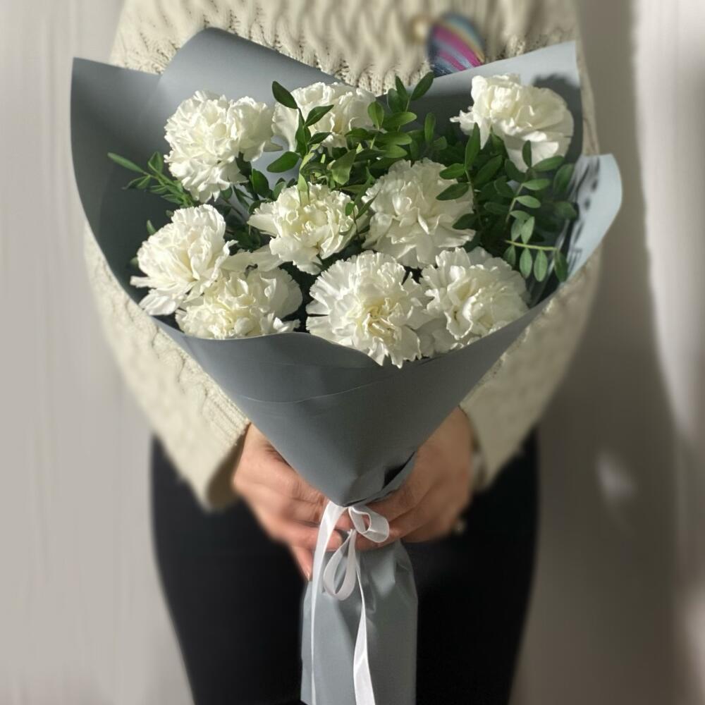 Белые диантусы в стильной серой упаковке