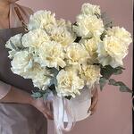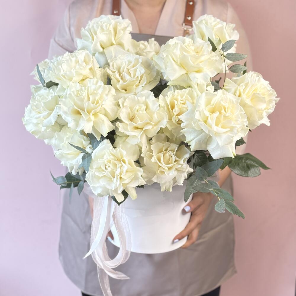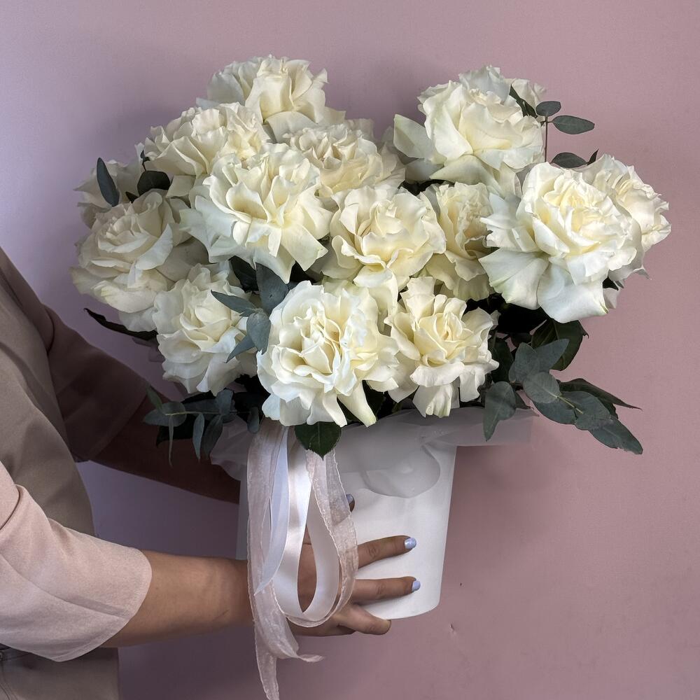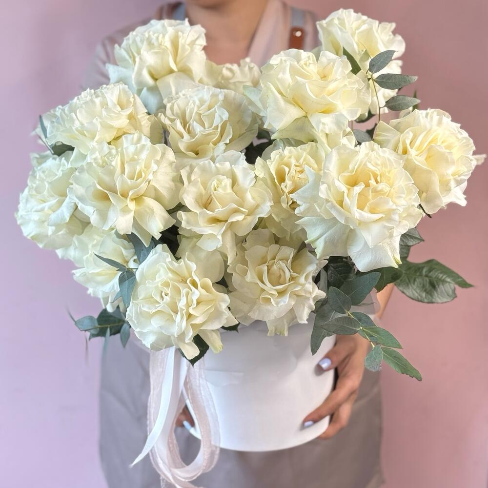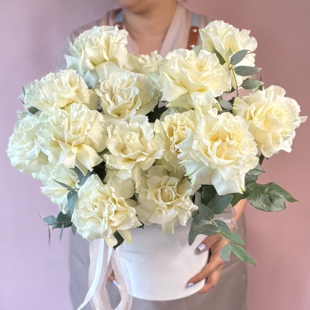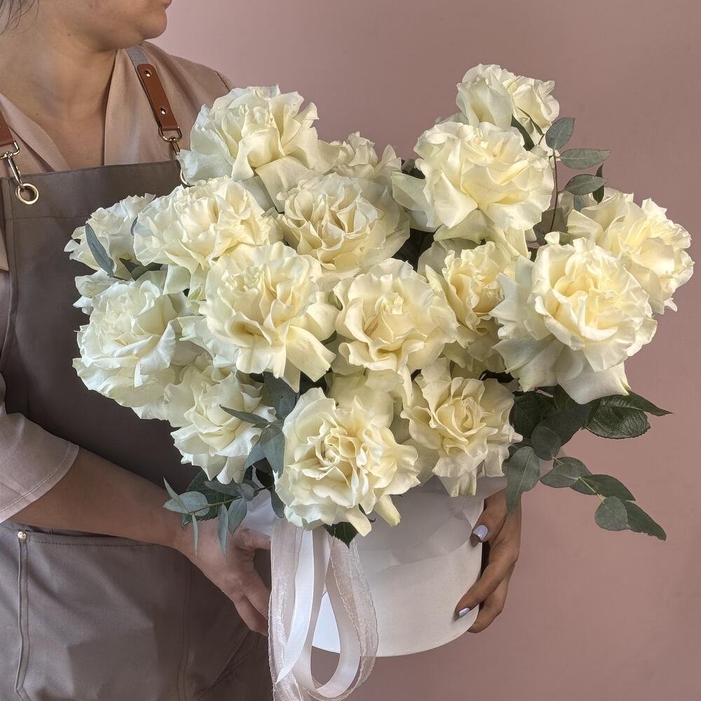 Эвкалипт - 10 шт. Роза - 17 шт. Лента атласная - 1 шт. Коробка шляпная - 1 шт. Оазис флористический - 1 шт.