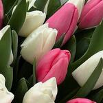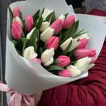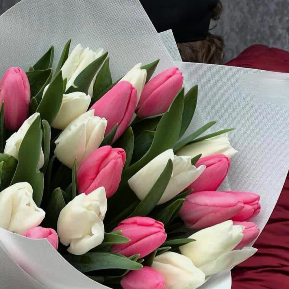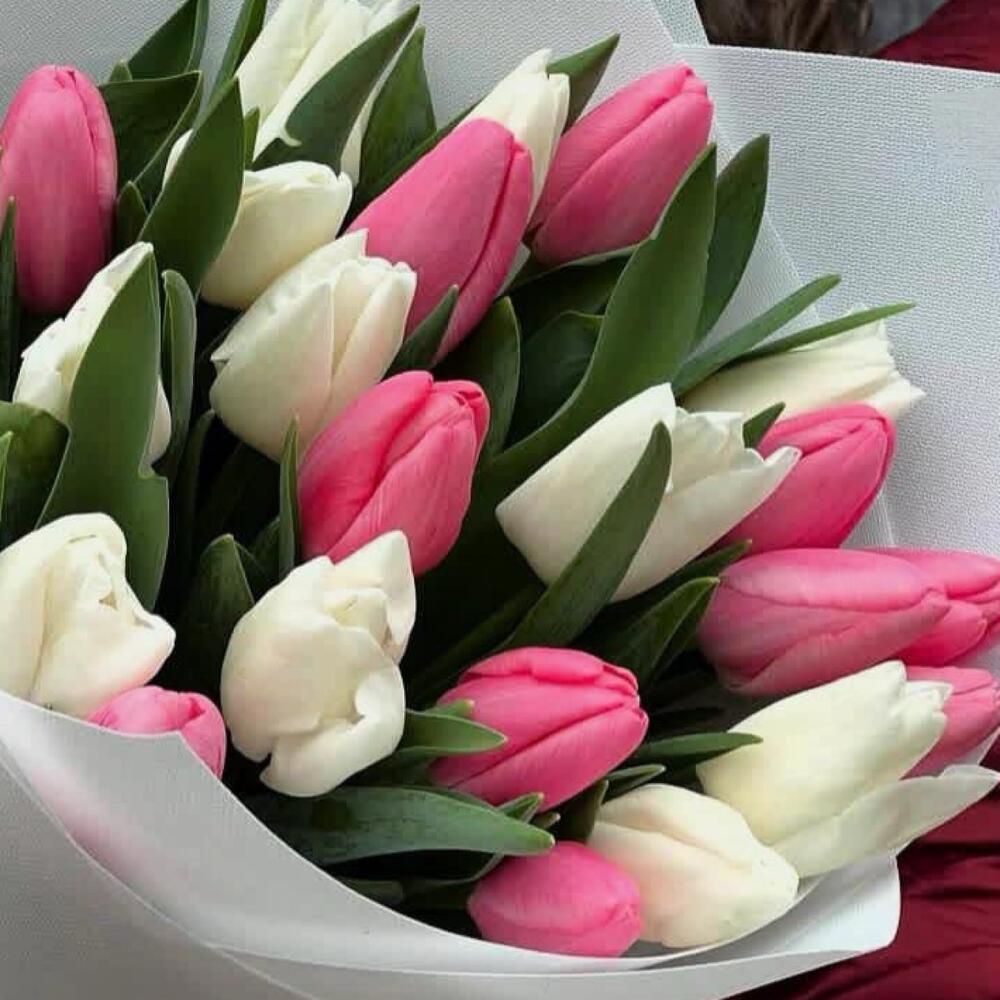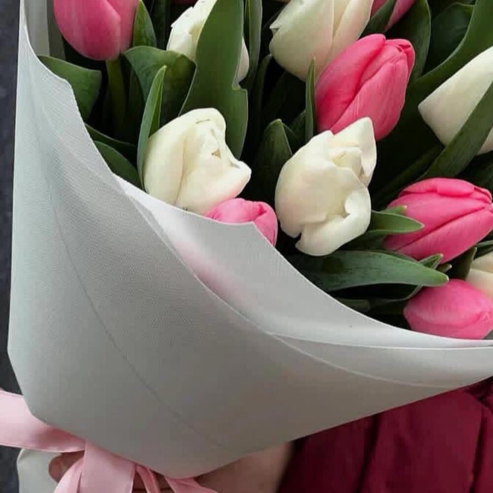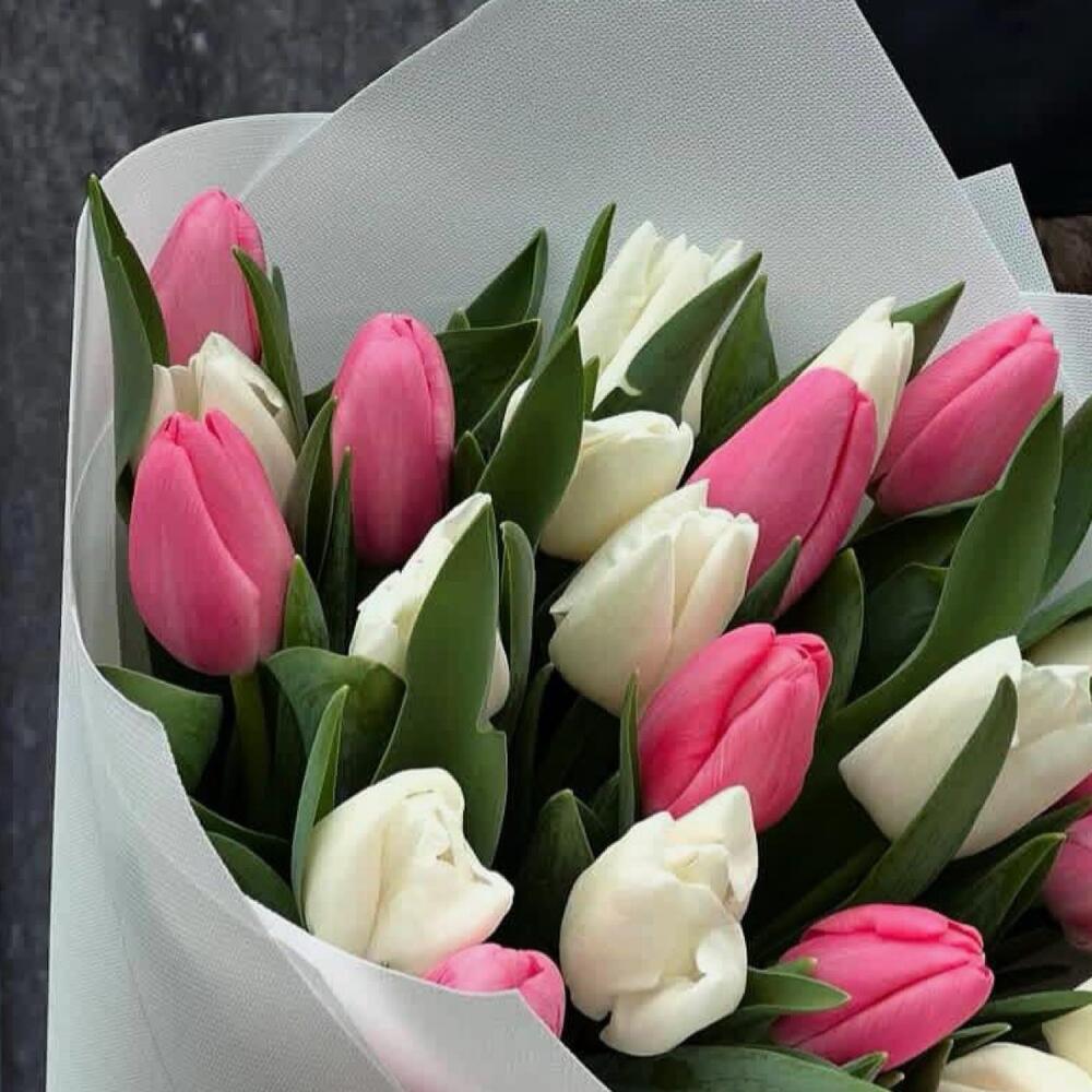 Лента - 1 шт. Упаковка - 1 шт. Открытка - 1 шт. розовые тюльпаны - 12 шт. белые тюльпаны - 13 шт. отличное настроение - 1000 шт.
