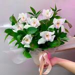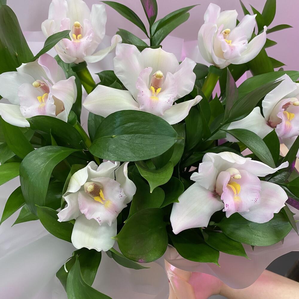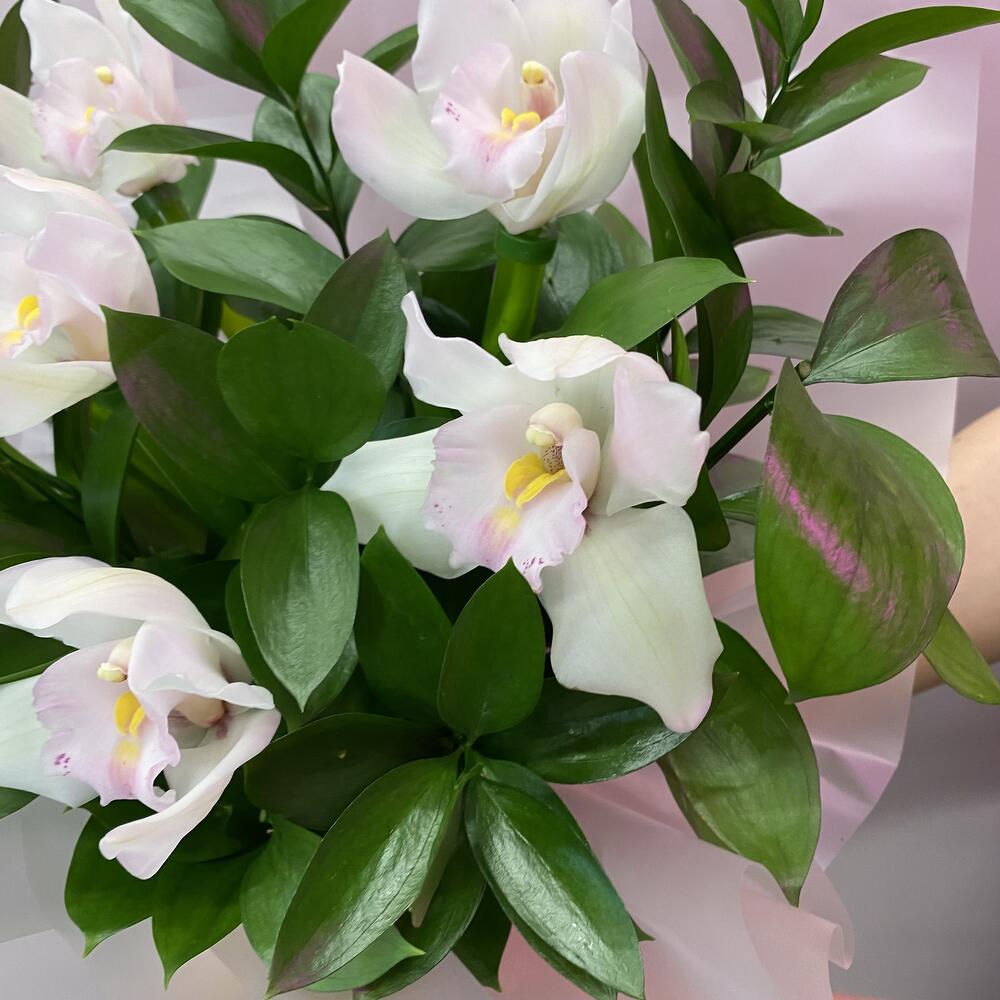Лента атласная - 2 шт. Пленка матовая - 1 шт. Орхидея Цимбидиум белая - 7 шт. Оазис флористический - 1 шт. рускус короткий - 7 шт.