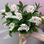 Элегантный и изысканный букет, составленный из свежих орхидей цимбидиум и украшенный зеленью рускуса. Благородные цвета и изящный дизайн делают этот букет отличным подарком для особого случая. Он упакован в элегантную шляпную коробку, что делает его еще более привлекательным и подходящим в качестве подарка для особого человека.