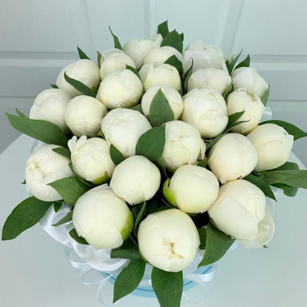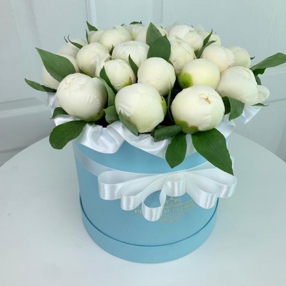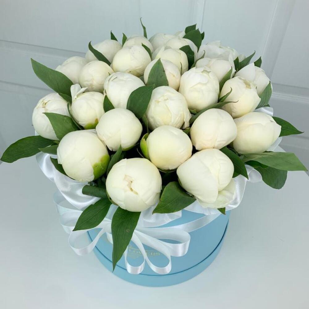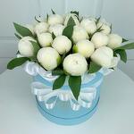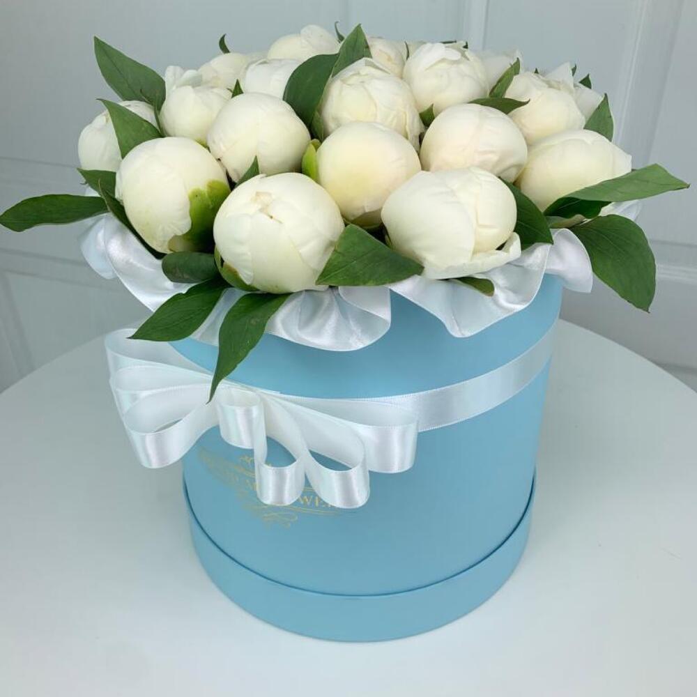 Лента - 1 шт. Коробка шляпная - 1 шт. белые пионы - 25 шт.