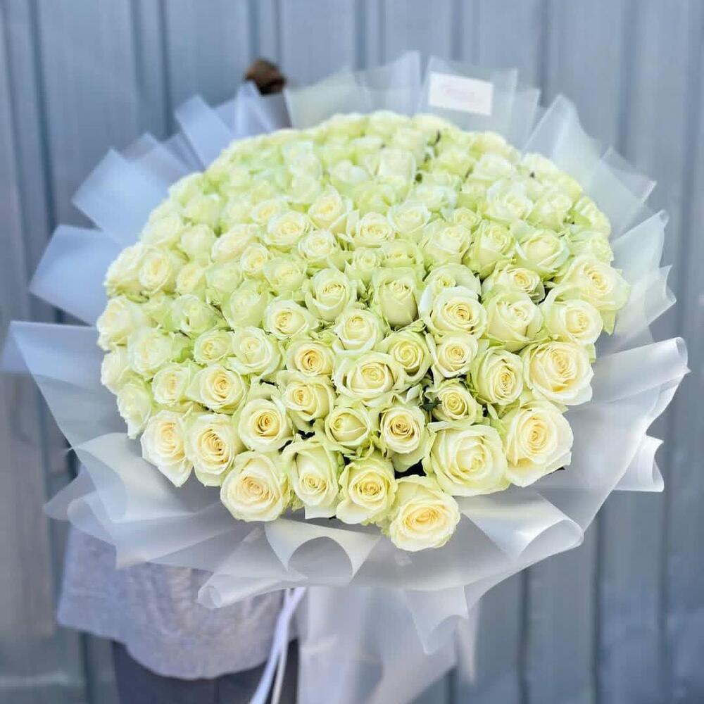 Лента - 1 шт. Упаковка дизайнерская - 1 шт. Открыточка с вашими пожеланиями - 1 шт. хорошее настроение - 1000 шт. розы - 101 шт.