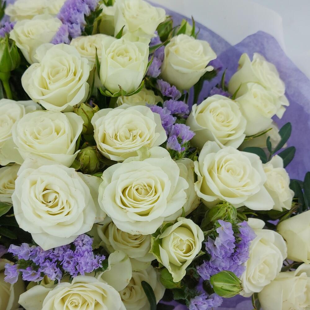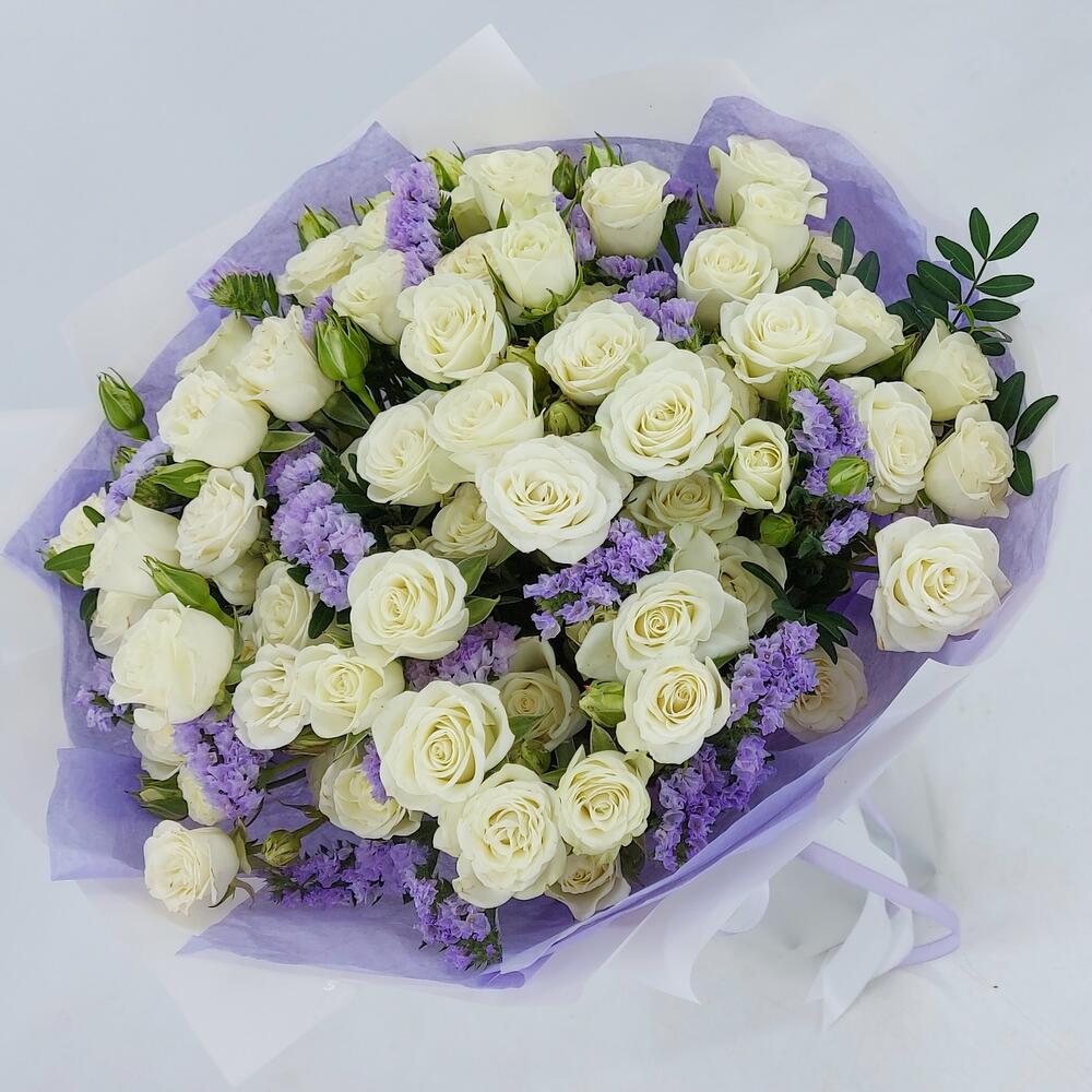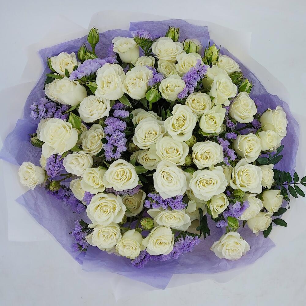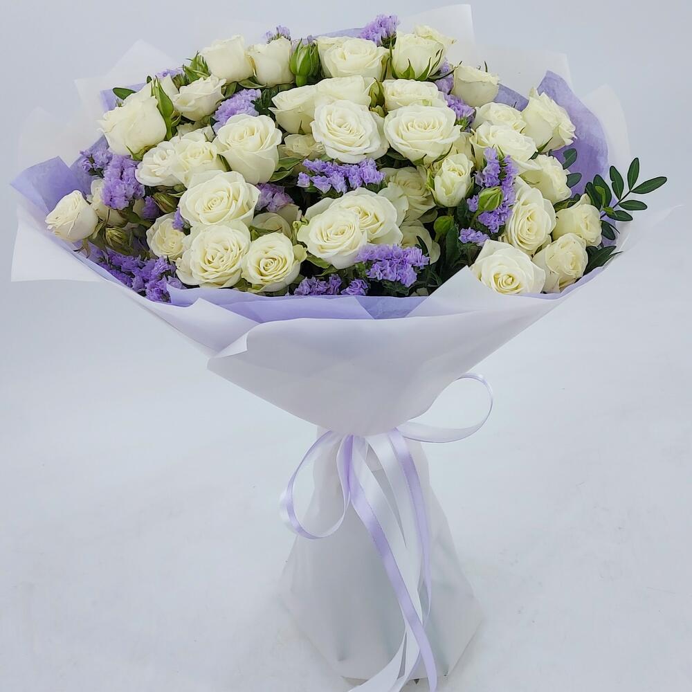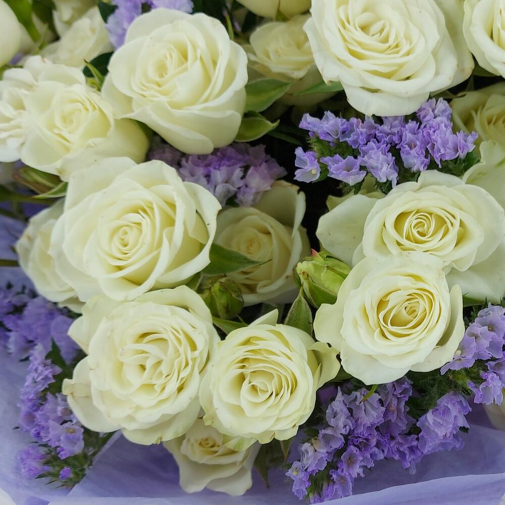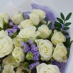 Роскошный букет из белых кустовых розочек и лавандовой статицы с офорслением в тон. Такой букет всегда уместен и подойдёт для любого повода: День Рождения, именины, годовщина свадьбы, рождение ребенка, 8 марта, День Святого Валентина, выпускной и т.д. Можно вручить маме, сестре, подруге, коллеге, учителю, любимой.