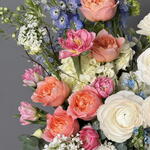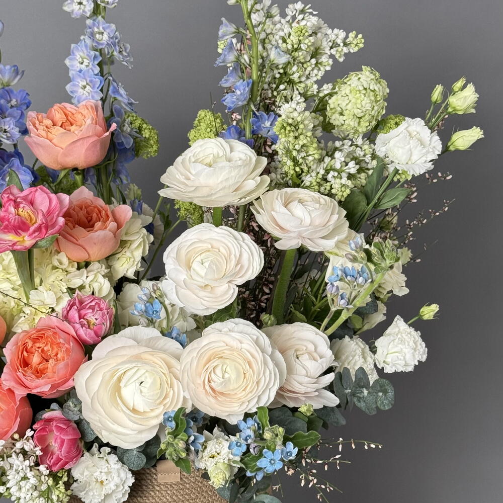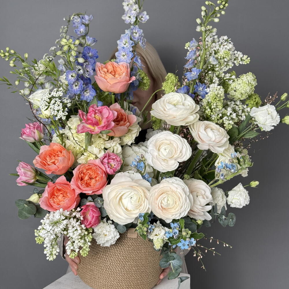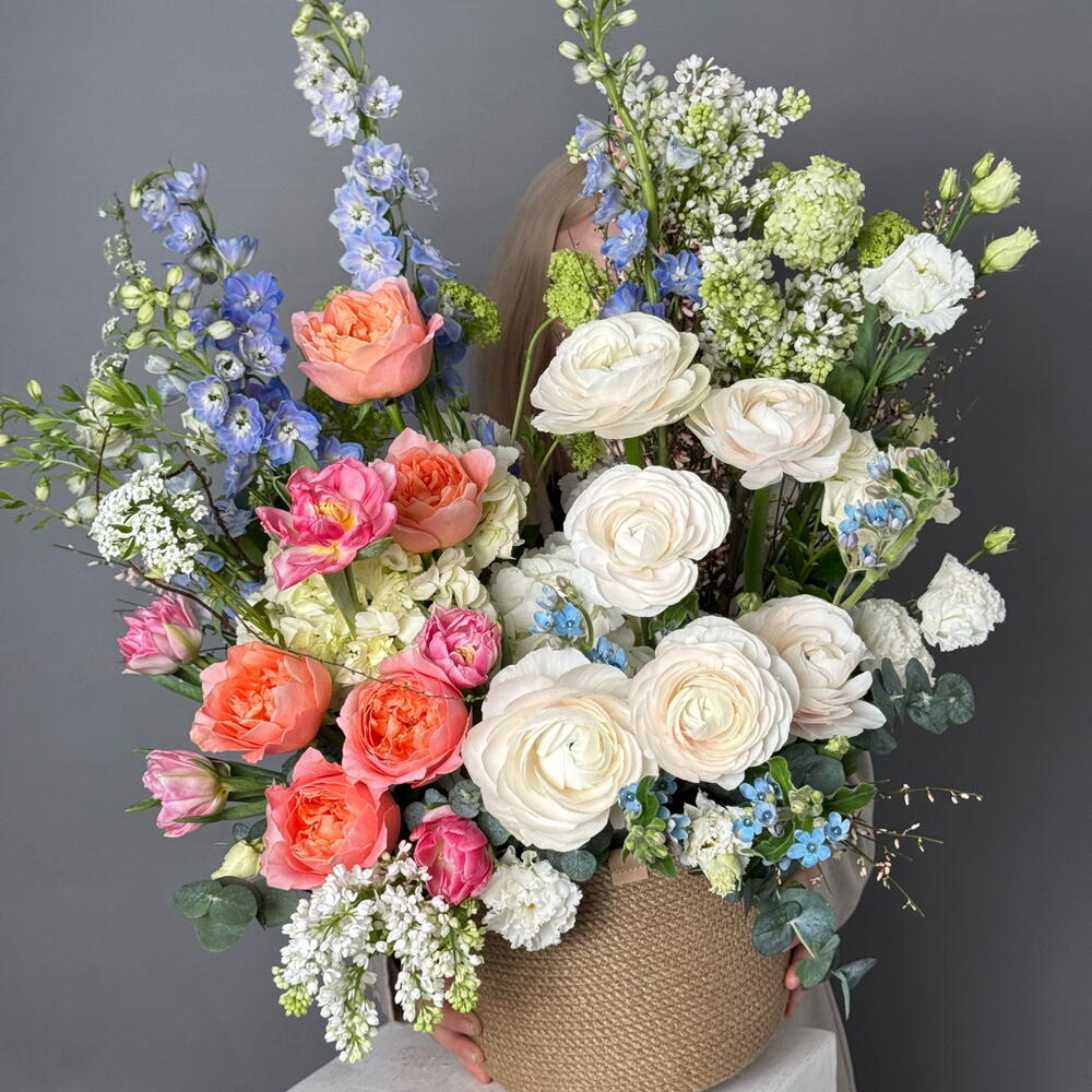Большая композиция в кашпо с сиренью, ранункулюсами и тюльпанами
