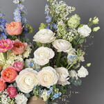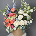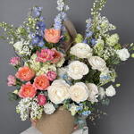 Вибурнум - 3 шт. Гортензия - 3 шт. Дельфиниум - 5 шт. Тюльпан - 6 шт. Эвкалипт - 1 шт. Кустовая роза - 3 шт. Диантус - 8 шт. Ранункулюс - 6 шт. Форзиция - 2 шт. Сирень белая - 4 шт. Оксипеталум - 5 шт. эустома белая - 3 шт. Гениста Розовая - 3 шт. губка флористическая с водой - 2 шт. роза драгонфлай - 5 шт. кашпо круглое д25 - 1 шт.