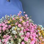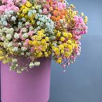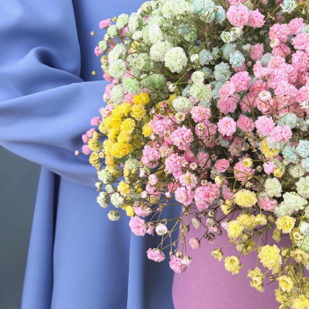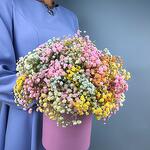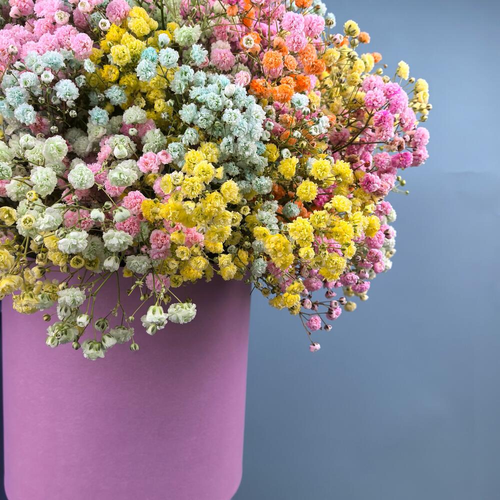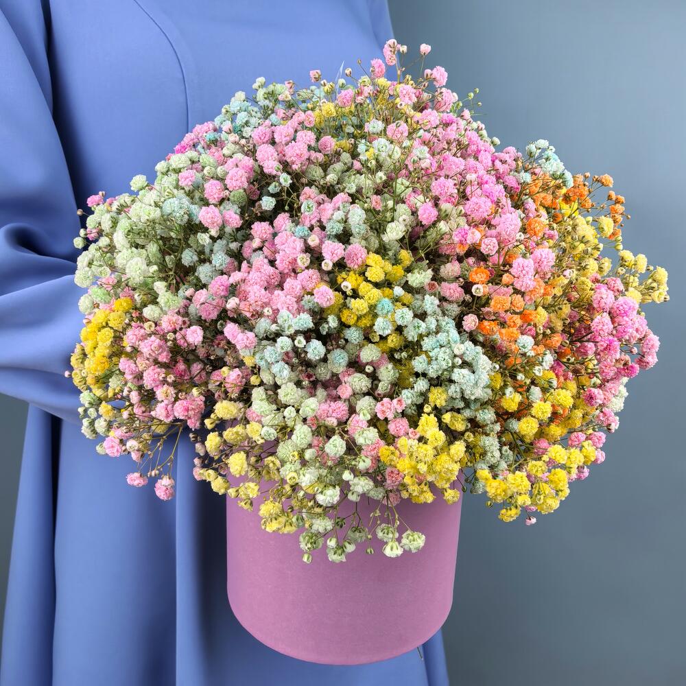 Эффектная и объёмная композиция из разноцветной гипсофилы в шляпной коробке большого размера — это настоящий взрыв нежности и цвета. Воздушные соцветия, окрашенные в пастельные и яркие оттенки, создают ощущение лёгкости и сказочного облака, которое идеально подойдёт для особенных моментов. В составе: Многоцветная гипсофила — окрашенная в жёлтый, розовый, голубой, мятный, сиреневый и персиковый цвета. Объёмная шляпная коробка в нежно-розовом исполнении подчёркивает пышность композиции и её праздничный характер. Такой вариант идеально подойдёт: Для оформления мероприятий, свадеб, фотосессий. Как впечатляющий подарок на юбилей, выписку из роддома, корпоративное торжество или в знак признания и любви. Композиция одновременно смотрится стильно, легко и современно, при этом не теряет романтичного шарма. 🌿 Уход за композицией из гипсофилы (большая коробка) ✅ Если гипсофила свежая: Полив: Проверяйте влажность флористической губки каждые 2–3 дня. Аккуратно добавляйте по 150–200 мл прохладной воды, стараясь не залить коробку. Место размещения: Храните при температуре +15–22°C. Избегайте прямого солнца, сквозняков и рядом стоящих приборов отопления. Срок жизни: Свежая гипсофила в коробке сохраняет вид в среднем 5–7 дней. ✅ Если гипсофила сухая (засушенная): Условия хранения: Не требует полива. Держите в сухом, защищённом от солнца месте. Не трогайте лишний раз — сухая гипсофила довольно хрупкая. Срок службы: При бережном обращении сохраняет декоративность до 6–12 месяцев.