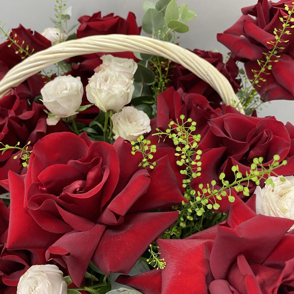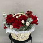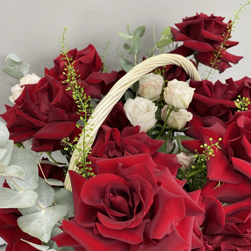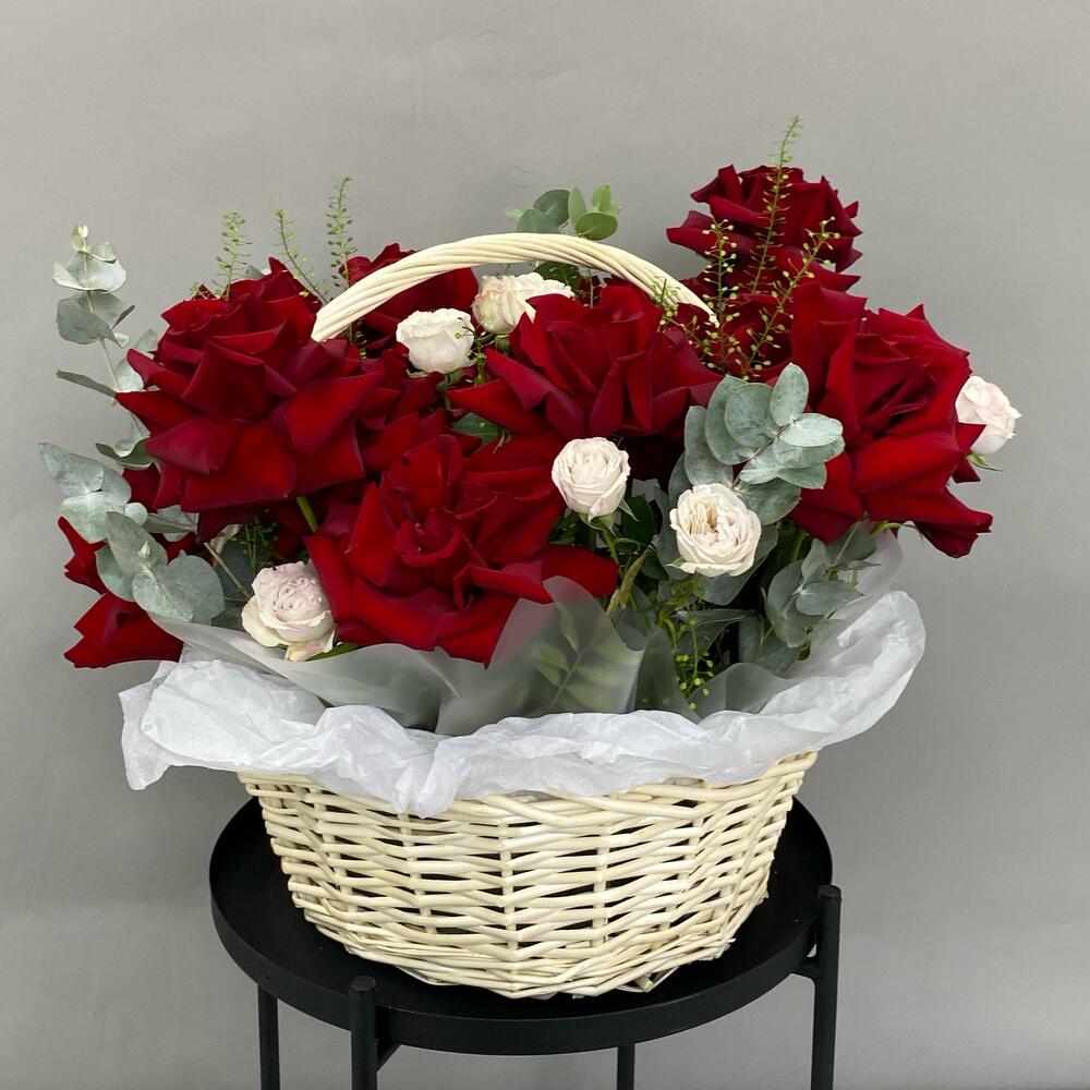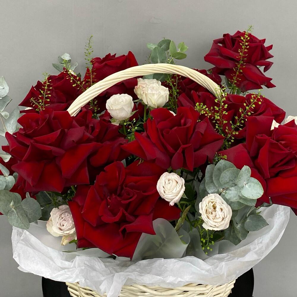 Эвкалипт - 3 шт. Фисташка - 2 шт. Роза кустовая пионовидная - 4 шт. Гринбелл - 3 шт. Корзина большая - 1 шт. Роза французская - 15 шт.